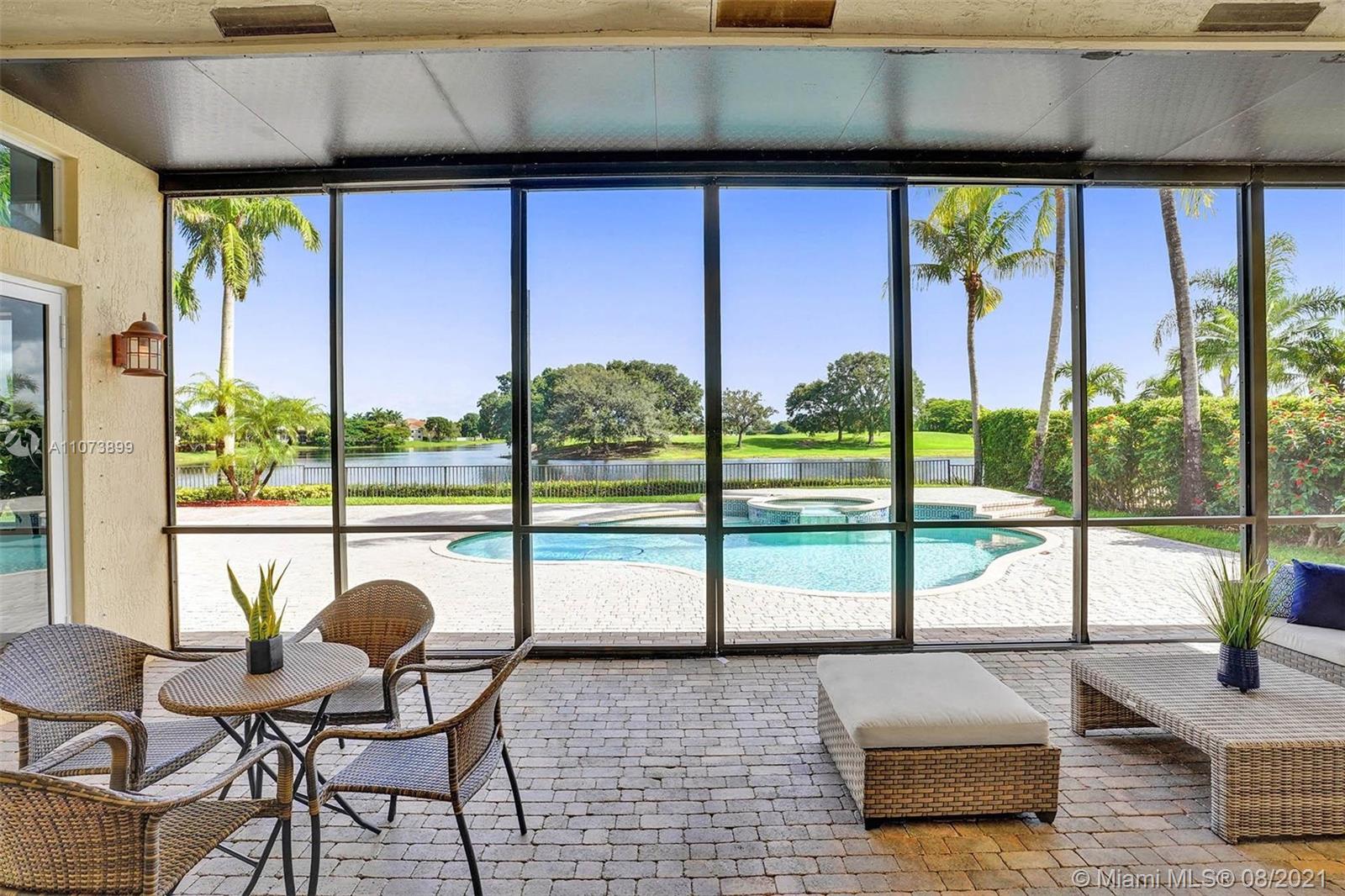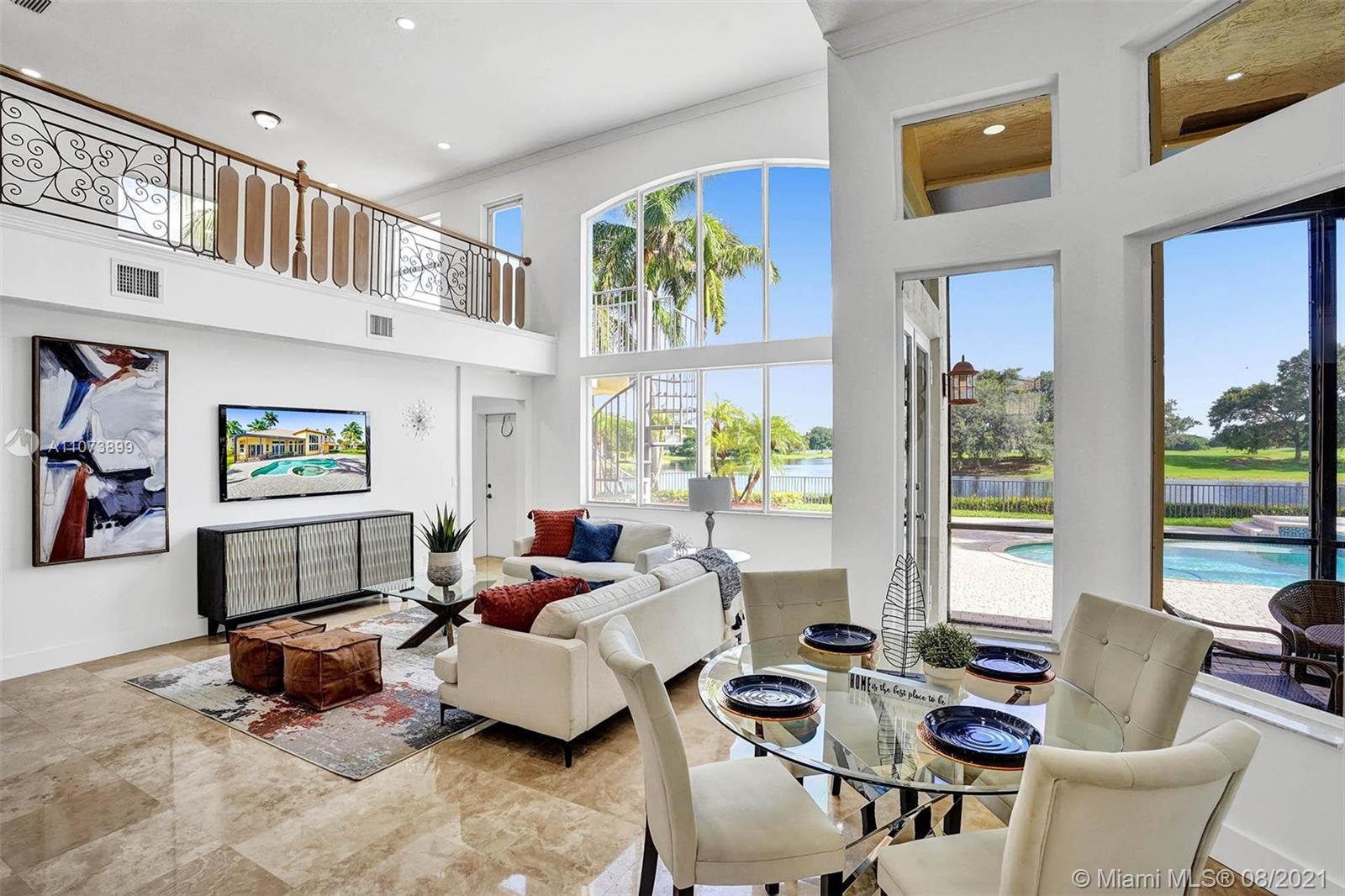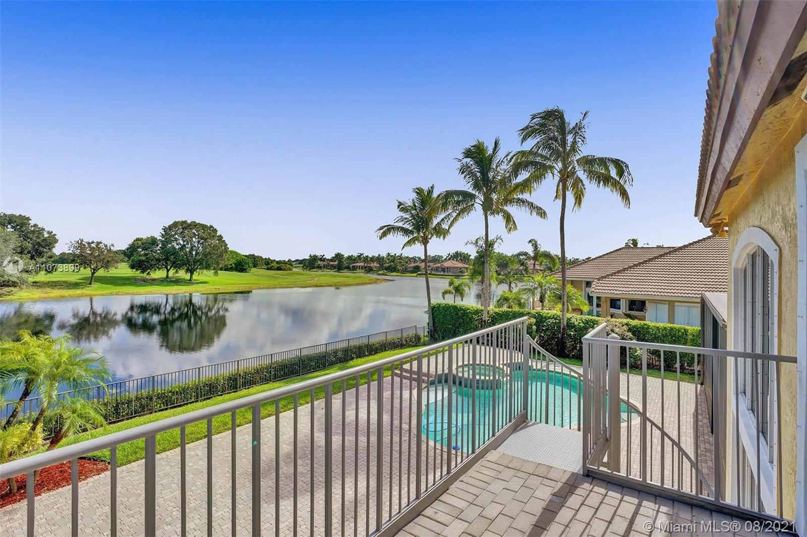 Talk about a VIEW. Incredible setback with oversized paver driveway located in Heron Bay at Long Cove. Privacy galore in this spacious 2 story home featuring travertine marble floors, volume ceiling, windows on water, and extensive crown molding. Brand New modern kitchen with stainless steel appliances and quartz countertops 2021. Owners suite first level with french doors to screened patio, pool, and fully fenced yard with view of golf and water. Newly renovated master bath. Secondary bedrooms 2nd level plus loft and balcony overlooking water and pool.