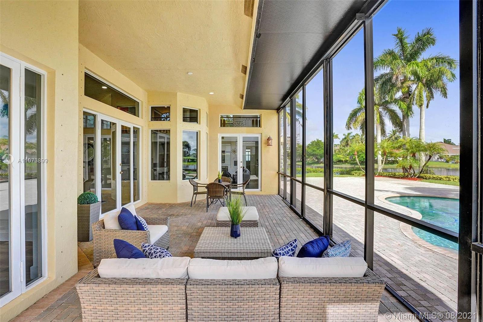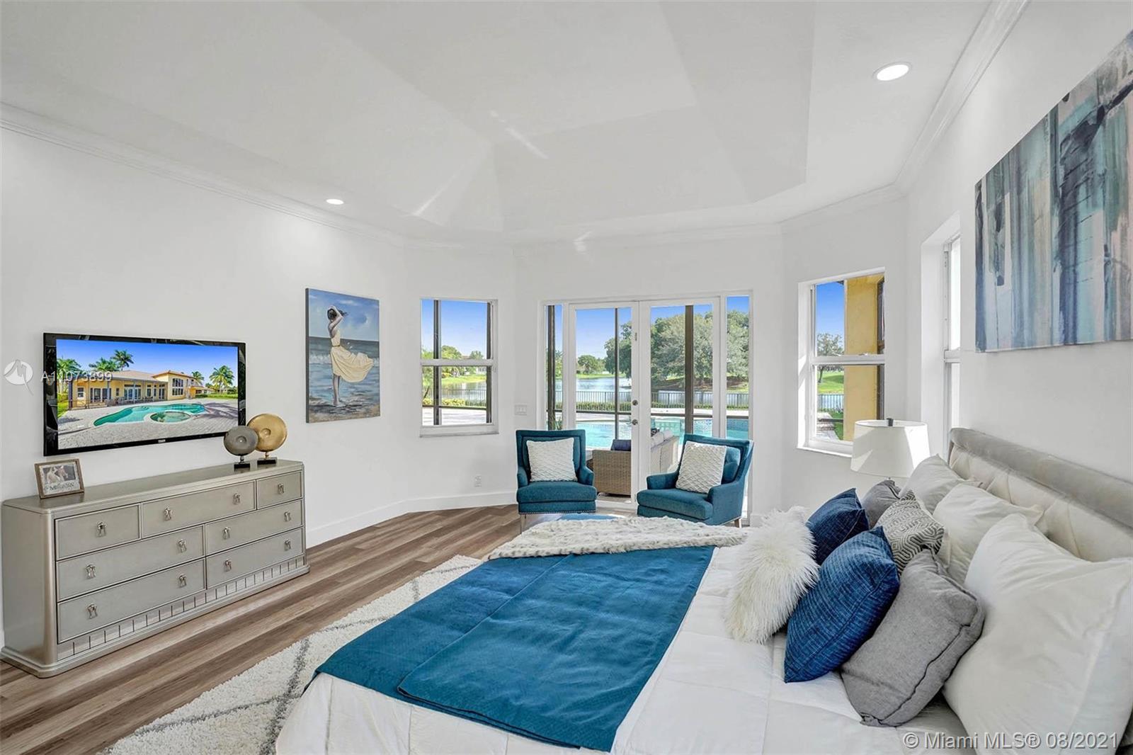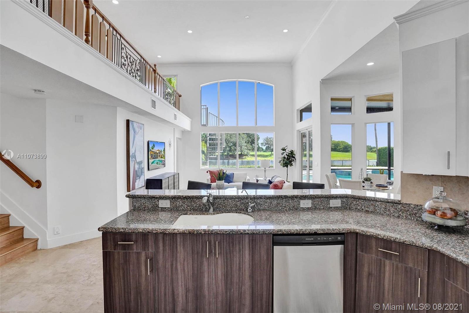 Talk about a VIEW. Incredible setback with oversized paver driveway located in Heron Bay at Long Cove. Privacy galore in this spacious 2 story home featuring travertine marble floors, volume ceiling, windows on water, and extensive crown molding. Brand New modern kitchen with stainless steel appliances and quartz countertops 2021. Owners suite first level with french doors to screened patio, pool, and fully fenced yard with view of golf and water. Newly renovated master bath. Secondary bedrooms 2nd level plus loft and balcony overlooking water and pool.