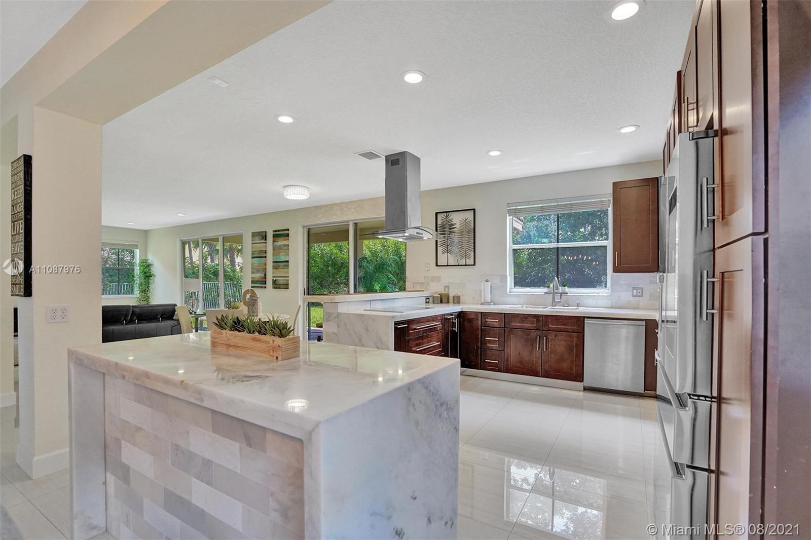 SPACIOUS GLENDALE IN PRESTIGIOUS GATED GOLF COMMUNITY OF WESTON HILLS COUNTRY CLUB. 5 BEDROOMS, 3 BATHS, 3 CAR GARAGE AND PAVER DRIVEWAY. REMODELED MODERN KITCHEN WITH CHOCOLATE WOOD CABINETS, QUARTZITE COUNTERTOPS, MIELE APPLIANCE. FULL BEDROOM AND BATH ON FIRST LEVEL. NEUTRAL PORCELAIN TILE FLOORS THROUGHOUT. LARGE OWNER SUITE WITH SITTING/OFFICE AREA. RENOVATED OWNERS BATH WITH VESSEL TUB, PORCELAIN TILE, AND QUARTZITE COUNTERTOPS. WOOD FLOORING IN ALL BEDROOMS. WOOD STAIRS WITH GLASS RAILING. SOARING CEILINGS IN LR. LARGE COVERED PAVER PATIO PERFECT FOR ENTERTAINING AND YARD WITH PLENTY OF ROOM FOR A POOL FICUS HEDGED FOR PRIVACY. HURRICANE SHUTTERS. WALK TO PARK AND BUS STOP. CLOSE TO ALL OF WESTON'S REGIONAL PARKS, SHOPPING, AND DINING.