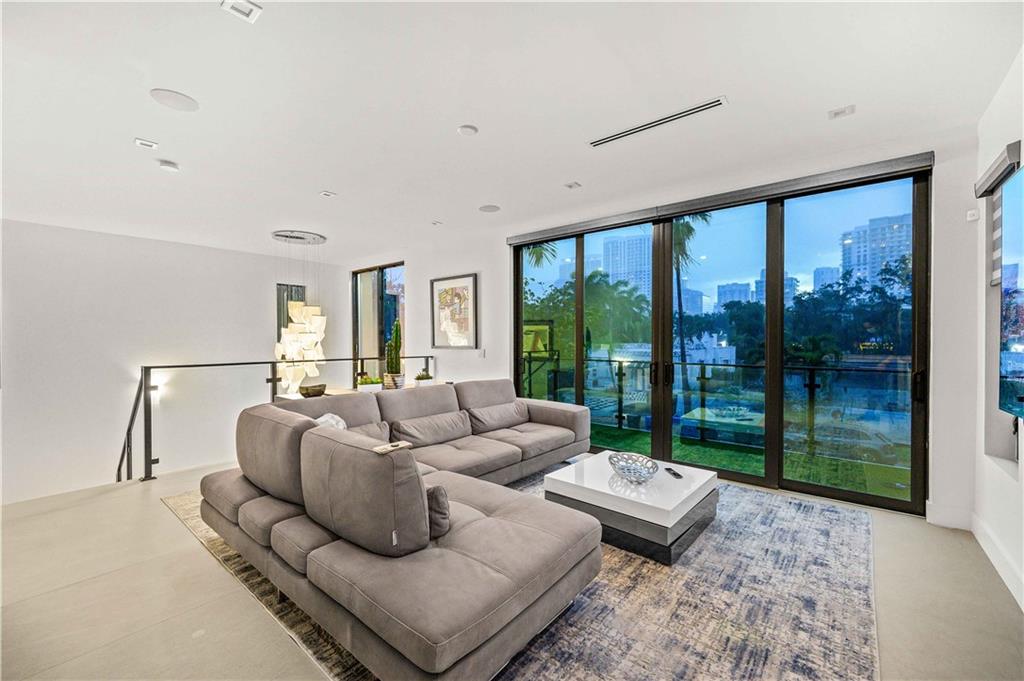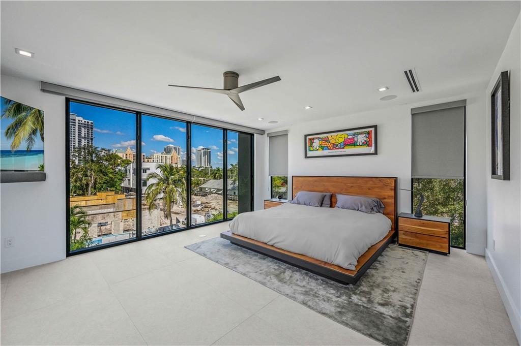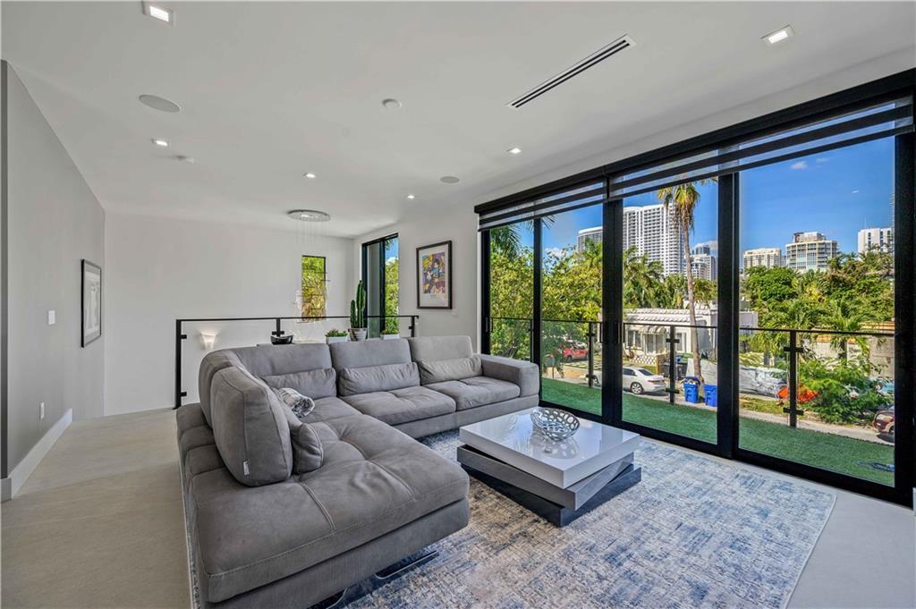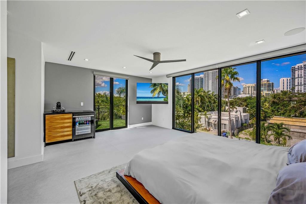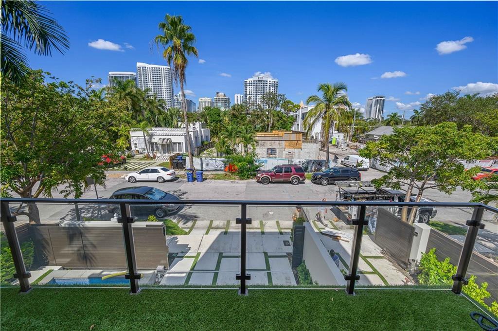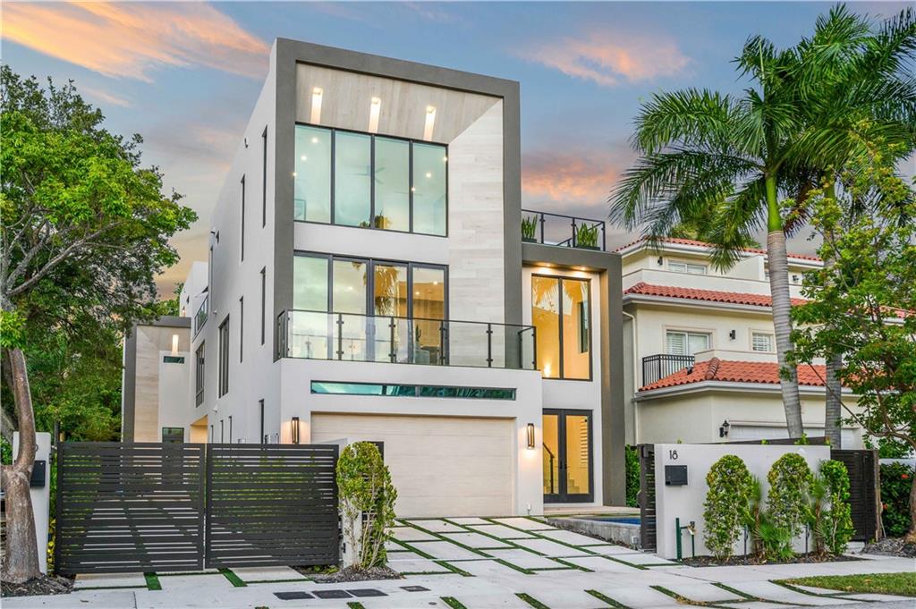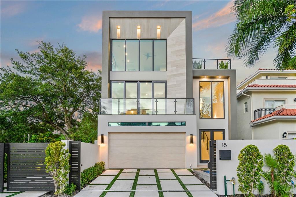Instant Gratification! A ready to move into new 2021 Las Olas neighborhood pool home. This house is cool, modern and light filled with many technology and design upgrades. Two story foyer, main floor living, dining kitchen with breakfast island, powder room and laundry. Walls of glass provide dramatic city skyline views. The living room opens to an open balcony. The top floor is dedicated to the primary suite, and accesses a roof level terrace with gas grill and more fabulous views. All three levels are served by elevator. Gated drive, a splash pool and two car garage (over 10 ft height) has epoxy pebble flooring and slat wall storage system. An electric outlet is in place for EV charging. [Information is from 3rd party sources including BCPA and is believed accurate but not warranted].