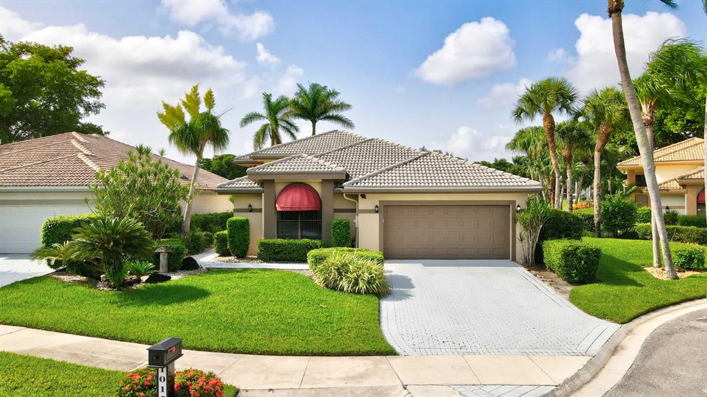 If you love watching the game of golf, you will love this view...perched right near the pin for the first hole of famous Stonebridge golf and country club... here is a home that you can make completely yours... Two on suite bedrooms/bathrooms and additional den offer a great use of space... A huge great room overlooks the patio pool area... The primary bedroom also has his and hers bath areas... Use your imagination and create a home of your dreams... Living the Stonebridge lifestyle offers golf, tennis, pickleball, fitness center, restaurant and much more...Come see, come experience this is living at it's best in Boca Raton.