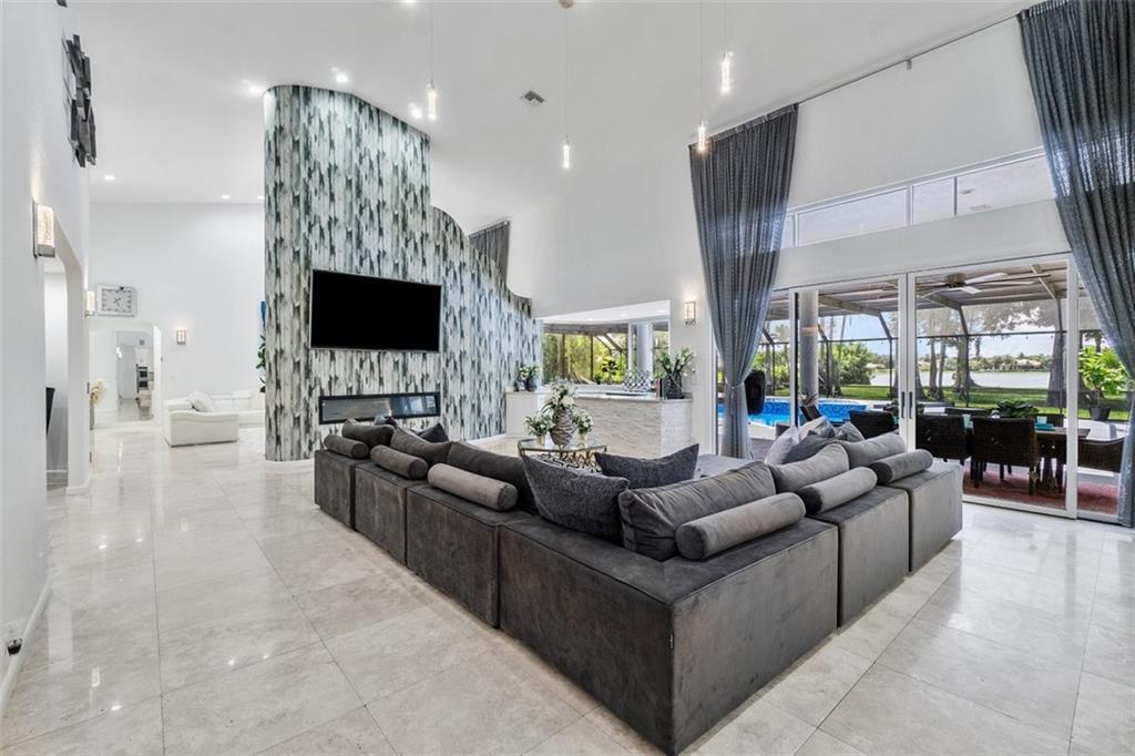 Sited within a breathtaking setting on a beautiful lakefront lot bordering a large green space. Panoramic long & wide water views can be enjoyed throughout via glorious walls of windows & glass doors. Light & airy interior w/Grand living areas & soaring 2 story ceilings! Crisp white kitchen with a large island, quartz countertops & SS appliances/huge family room/stack stone accents/fabulous lighting. The luxurious master suite features an additional room (perfect for a nursery, office, or gym), a spa-like bathroom with a freestanding tub, large steam shower with rain shower & spray jets. A spacious guest house has 2 bedrooms, a kitchenette & full bathroom. Gorgeous outdoor areas include an oversize pool/spa, summer kitchen, stunning sunsets & an Idyllic backyard.