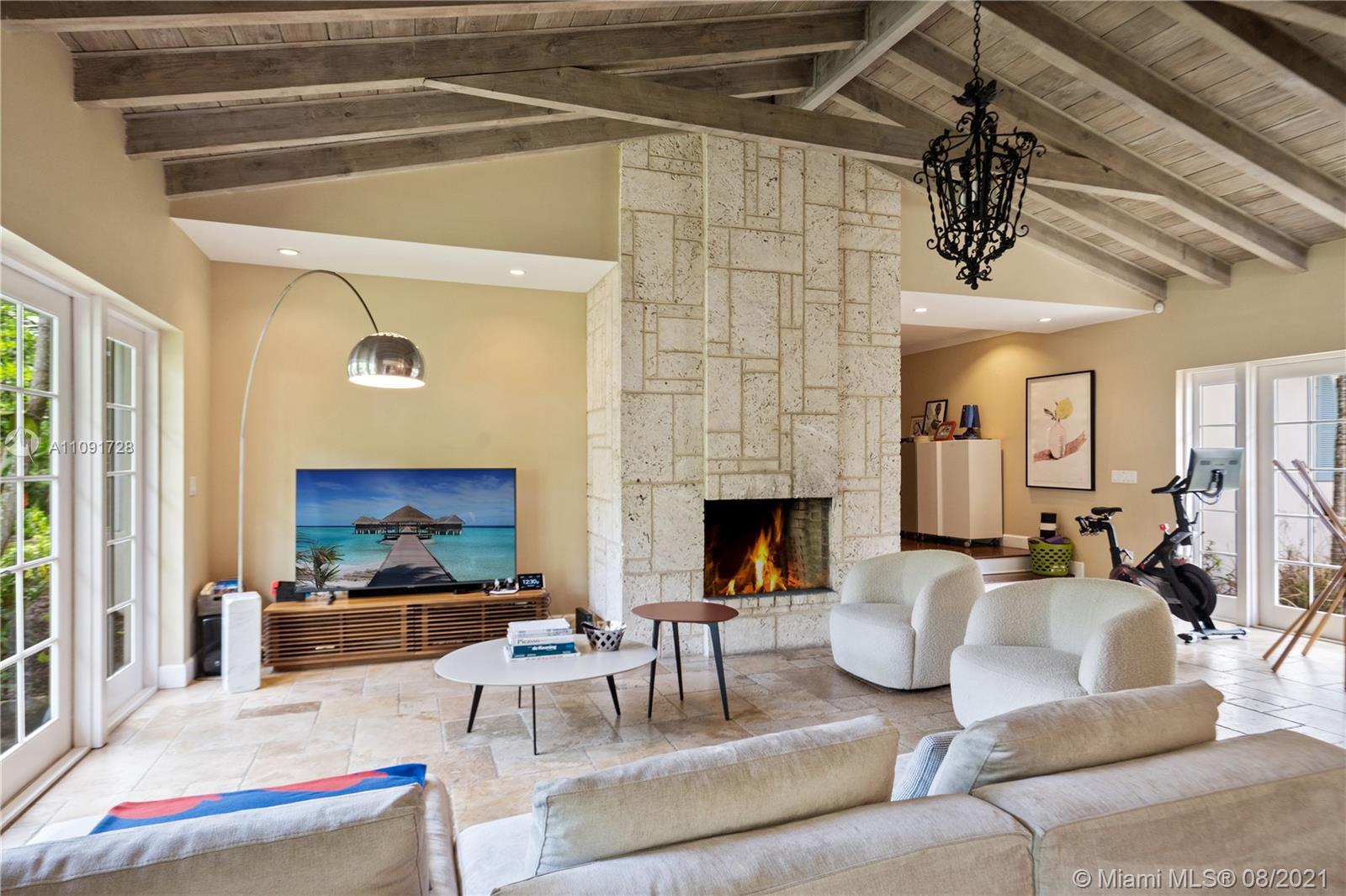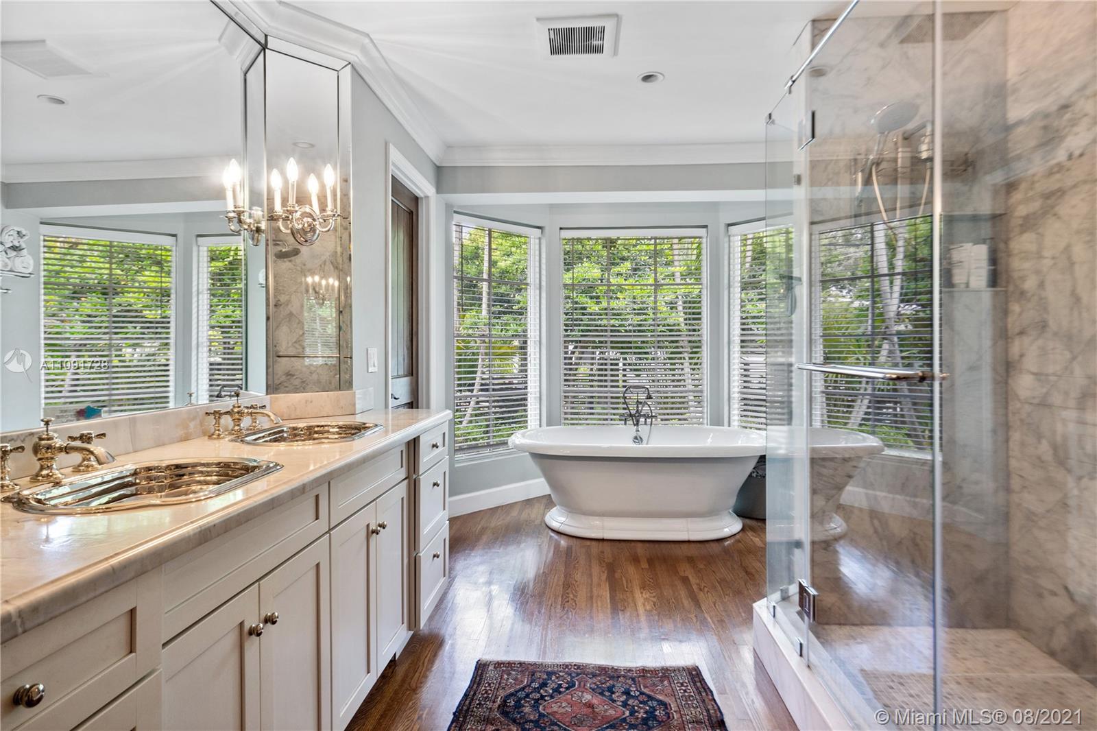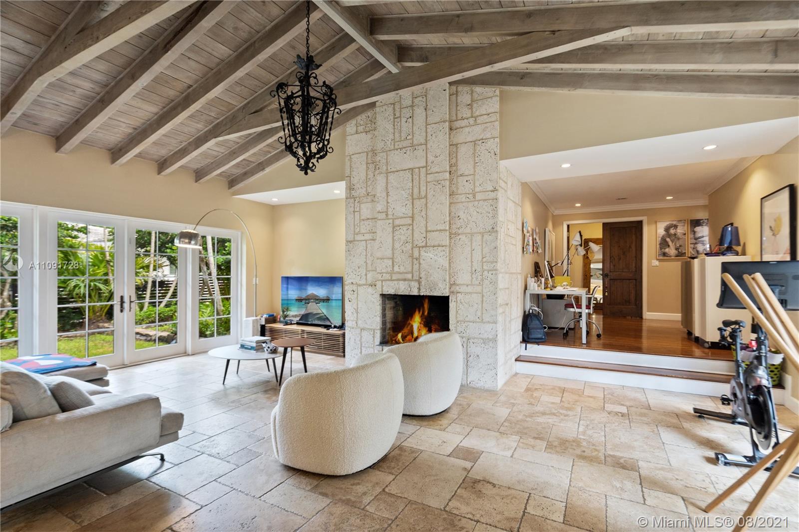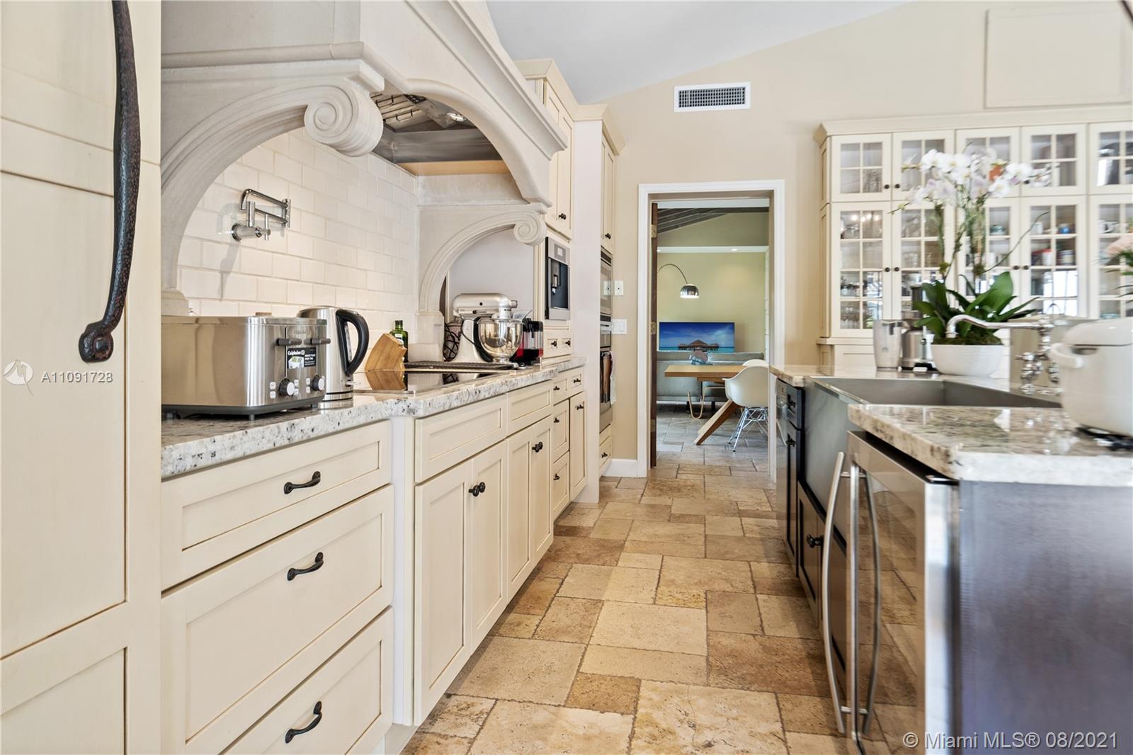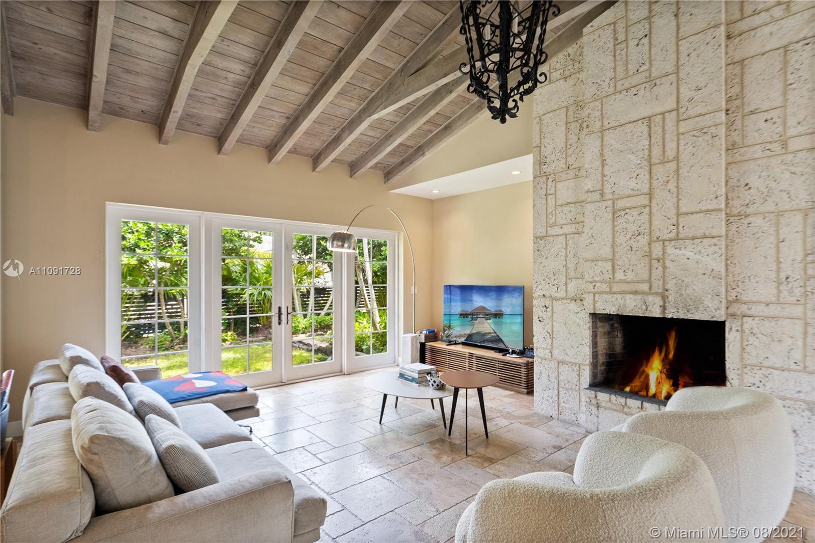 This stunning residence sits on a 15,000 Sq.Ft lot, rare to find in the Gables!! Beautifully designed with vaulted ceilings in the living room featuring a wood burning fire place. Tumbled Jerusalem Marble & hard wood floors. Open format kitchen with lots of cabinetry and storage space. Natural light in every room with impact glass windows, salt water pool. Great location on a beautiful tree lined street near Merrie Christmas Park!