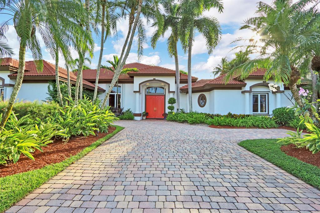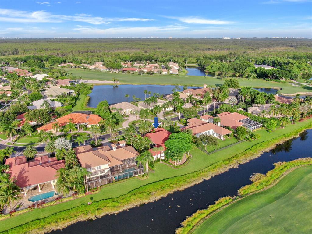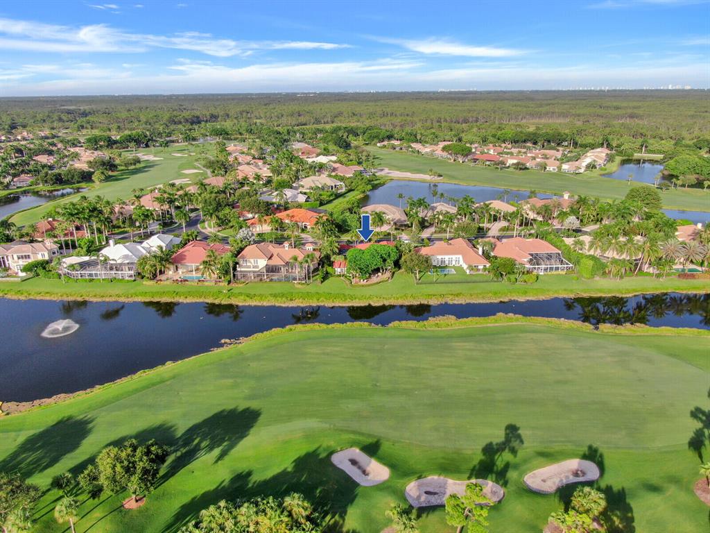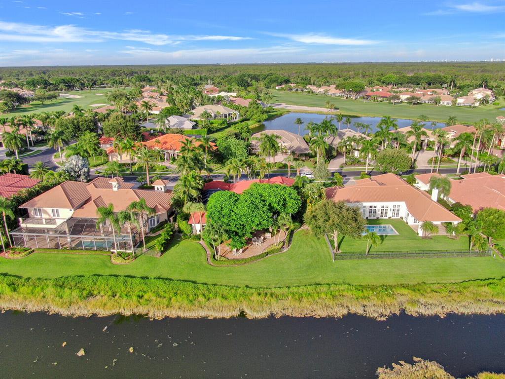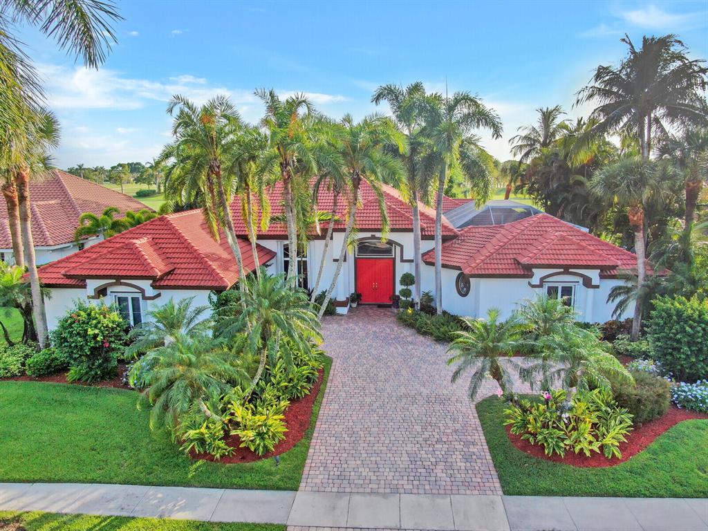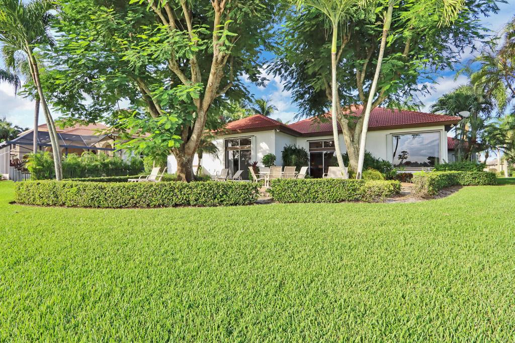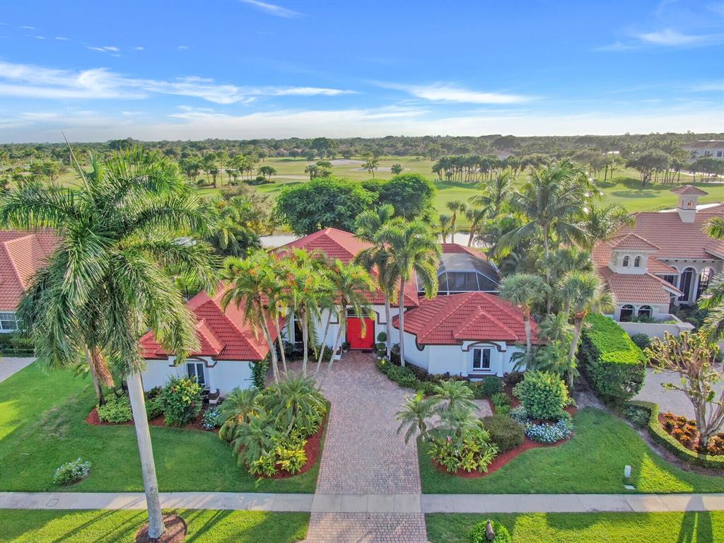 With over 100 feet of premium water frontage, this custom estate home offers a unique and rare configuration: A courtyard home with a great room floor plan. This 3BR/3.5BA+Den includes a PRIVATE GUEST HOUSE and is located on a premium water and golf lot in Herongate, Ibis's original premier builder's street. Overlooking the 18th hole of the Nicklaus-designed Heritage course, this home features the best of both worlds: Panoramic vistas of water and golf and the pool and spa within its own private oasis. The SW exposure in the rear allows you to enjoy fabulous sunset views from the oversized rear patio. Serene and tranquil, the separate, fully screened courtyard area houses a pool, spa and summer kitchen--opening up to the private guest house.