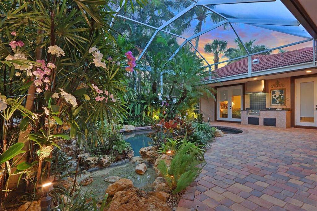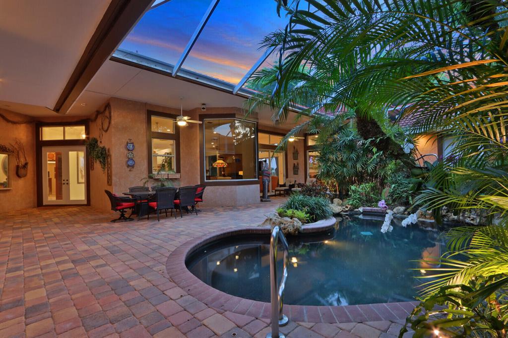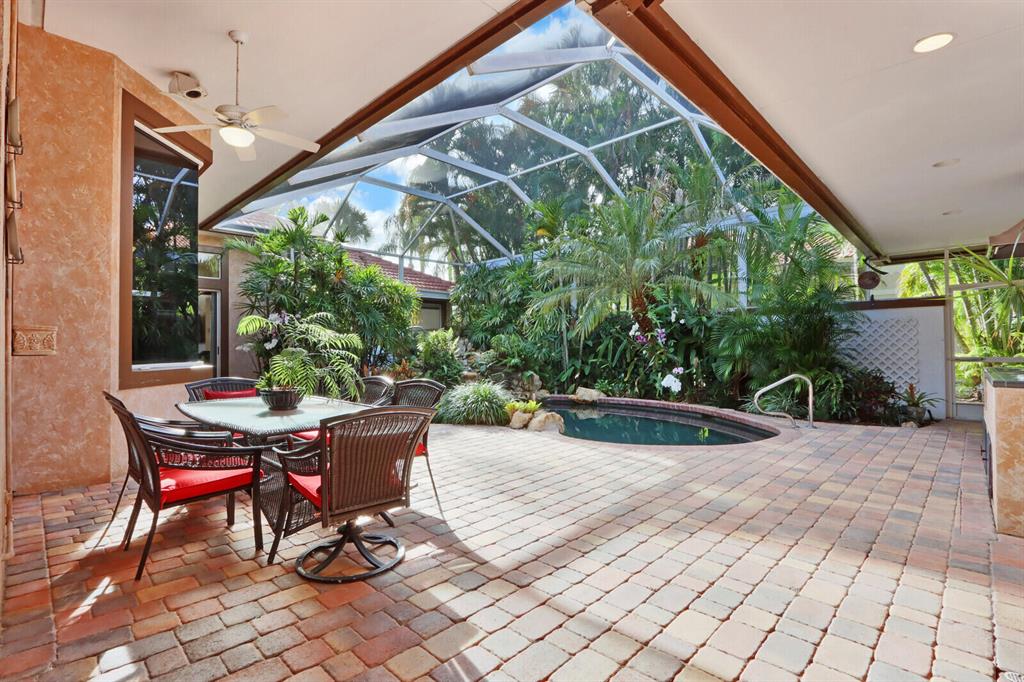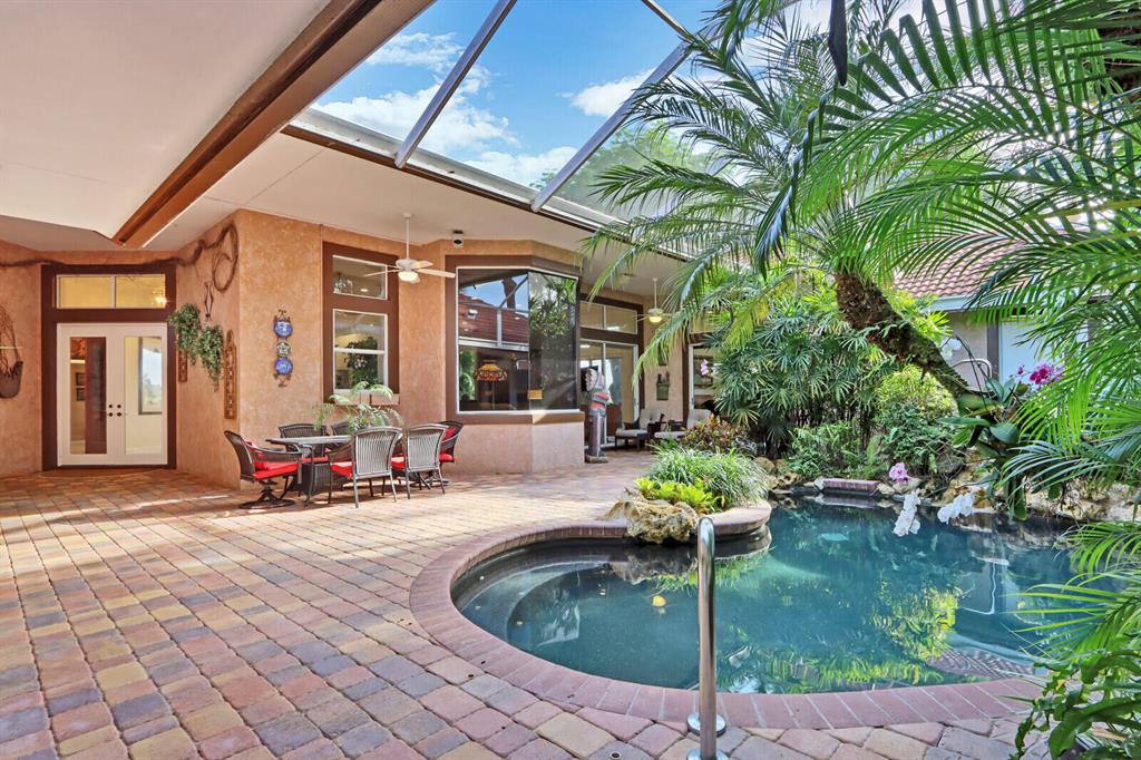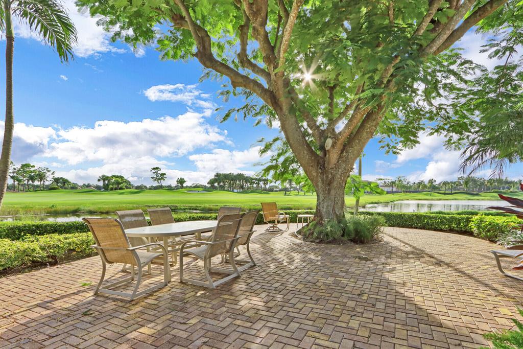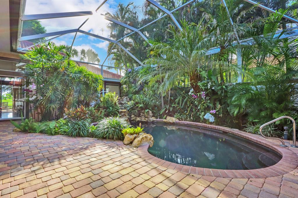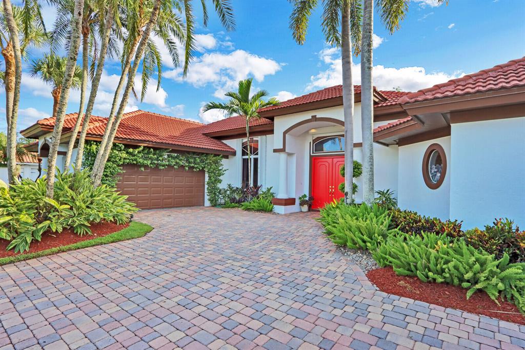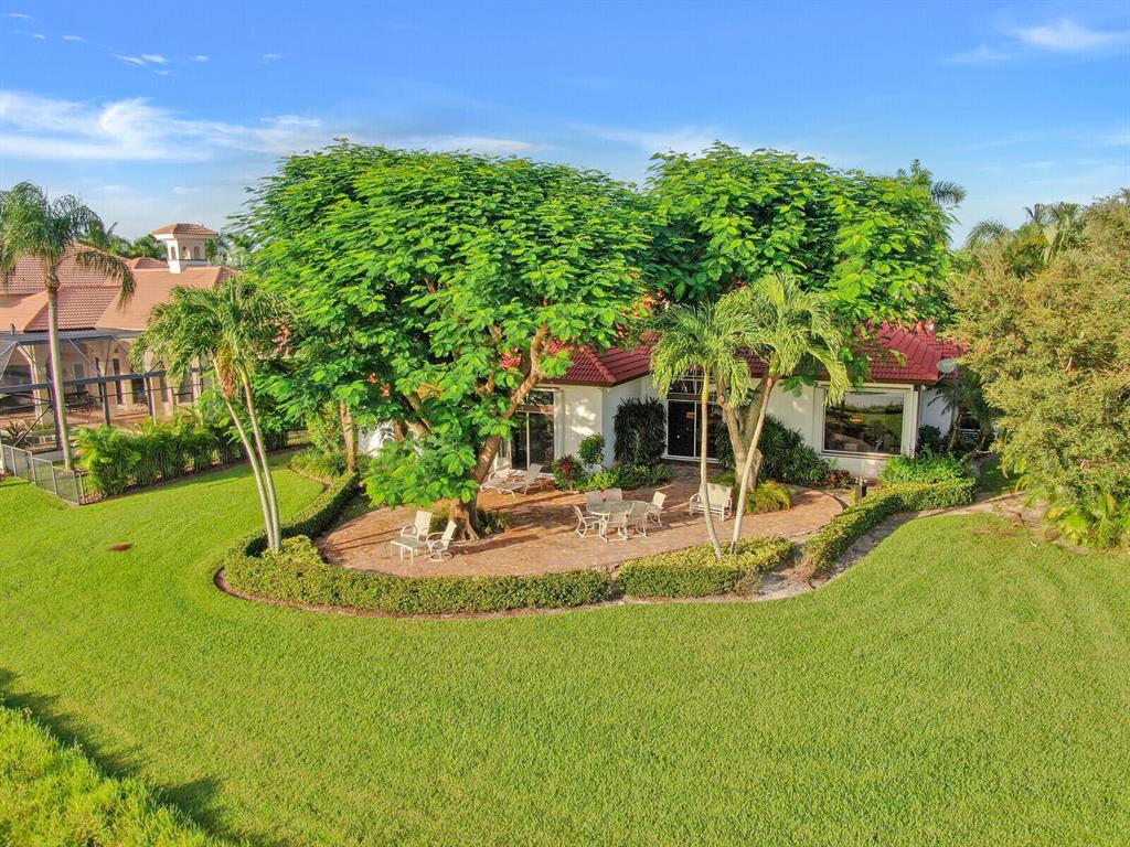 With over 100 feet of premium water frontage, this custom estate home offers a unique and rare configuration: A courtyard home with a great room floor plan. This 3BR/3.5BA+Den includes a PRIVATE GUEST HOUSE and is located on a premium water and golf lot in Herongate, Ibis's original premier builder's street. Overlooking the 18th hole of the Nicklaus-designed Heritage course, this home features the best of both worlds: Panoramic vistas of water and golf and the pool and spa within its own private oasis. The SW exposure in the rear allows you to enjoy fabulous sunset views from the oversized rear patio. Serene and tranquil, the separate, fully screened courtyard area houses a pool, spa and summer kitchen--opening up to the private guest house.