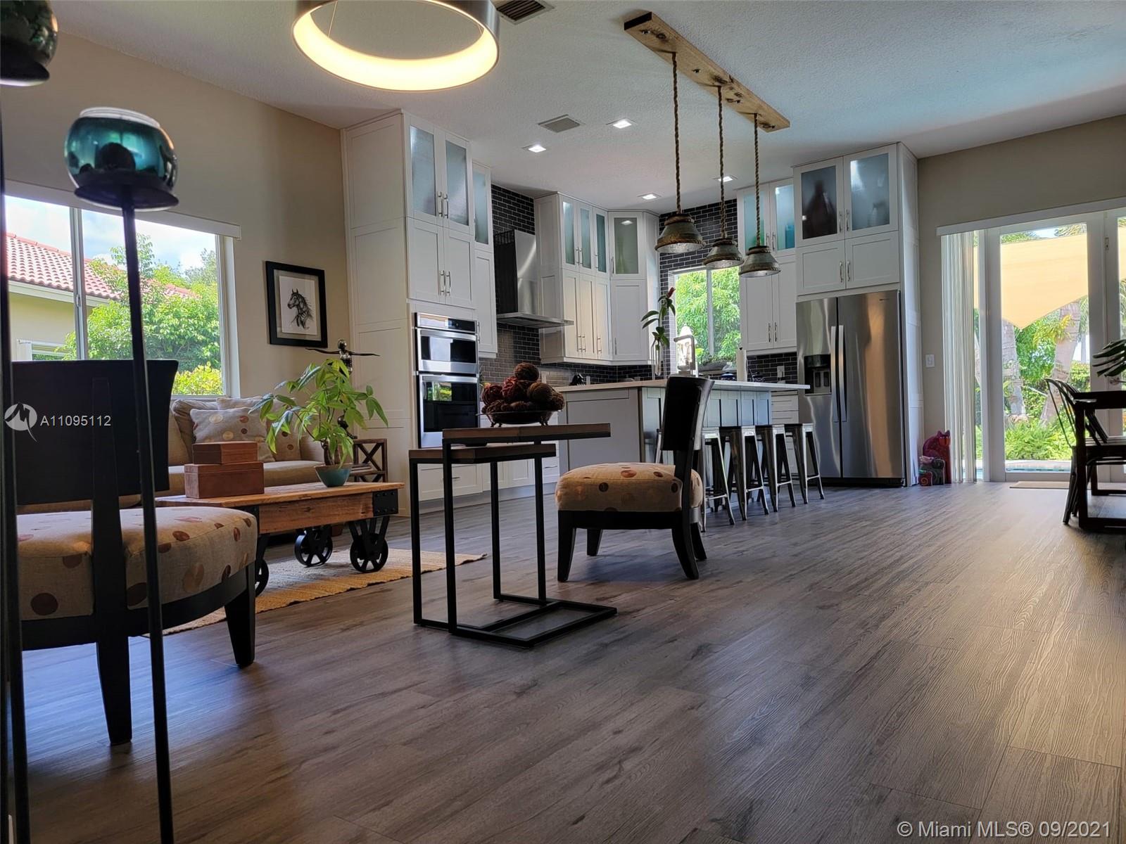 Beautiful home on a spacious lot in Monarch Lakes with an open floor plan with view from the front entrance to the yard and pool area. Waterfront & no rear neighbor, Newly re-surfaced pool w/ heater. Large paved patio with pavers extending out towards lake to a beautifully appointed gazebo. Solar w/ heater. AC unit w/ uv light. Air circulation system. Master has bamboo floors, walk in closet with built ins, dual vanity, jacuzzi tub and separate shower. Waterproof vinyl flooring throughout main areas. Master bedroom and living area open up to the pool with French doors. Ten foot ceilings. Separate laundry room. Keyless entry for front door and garage. Located in a cul-de-sac. Gated community. Conveniently located near elementary school, shopping and restaurants.