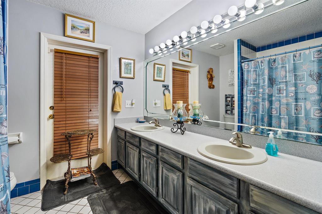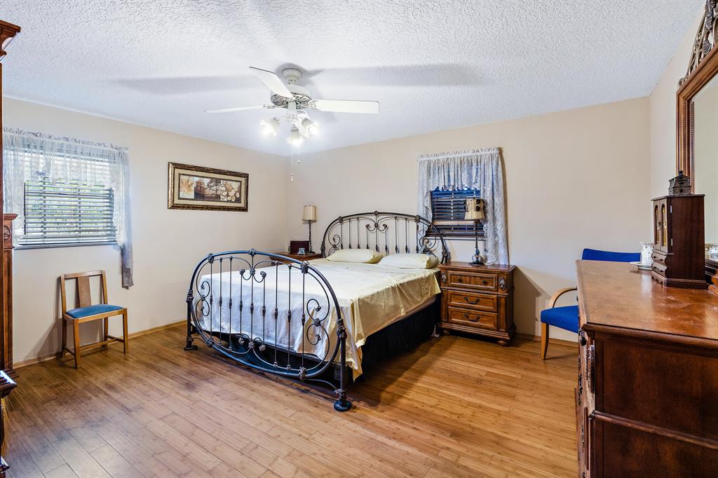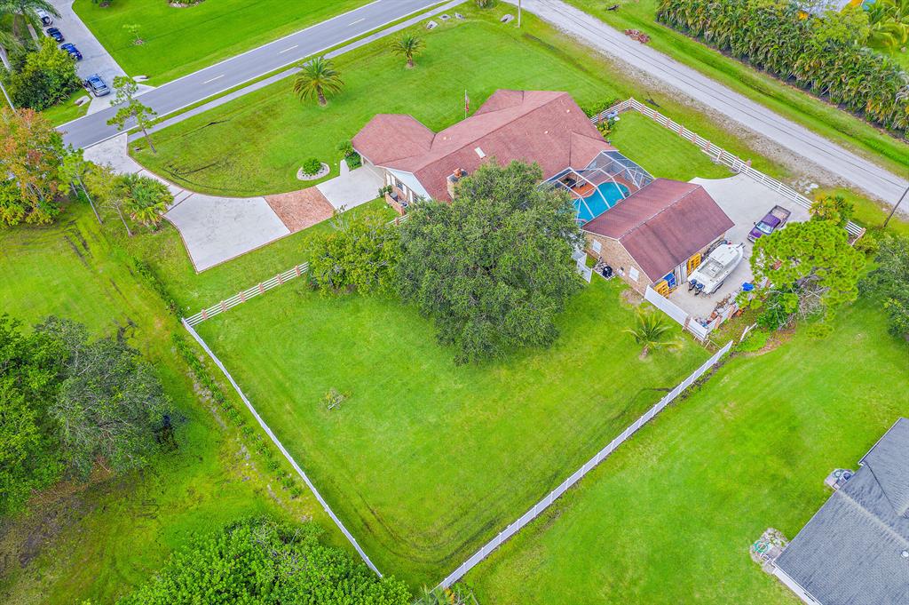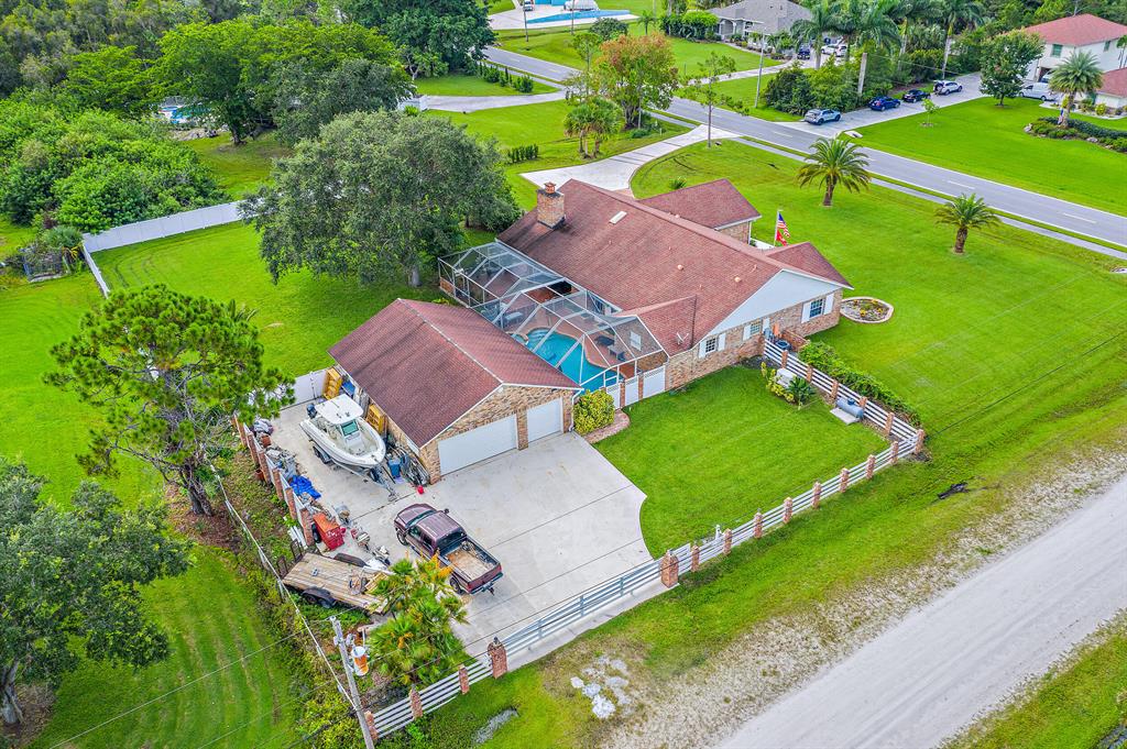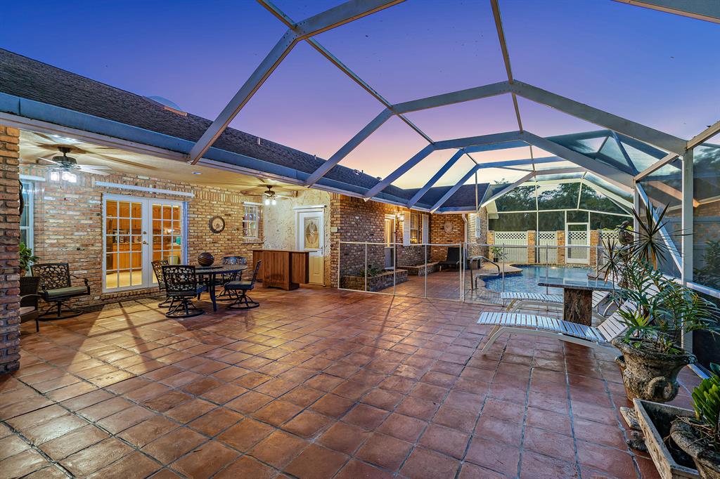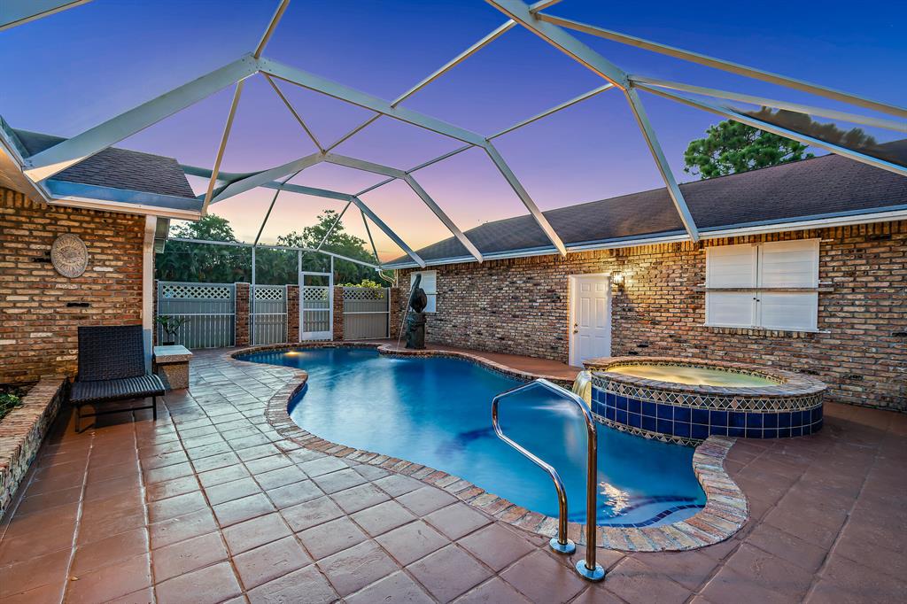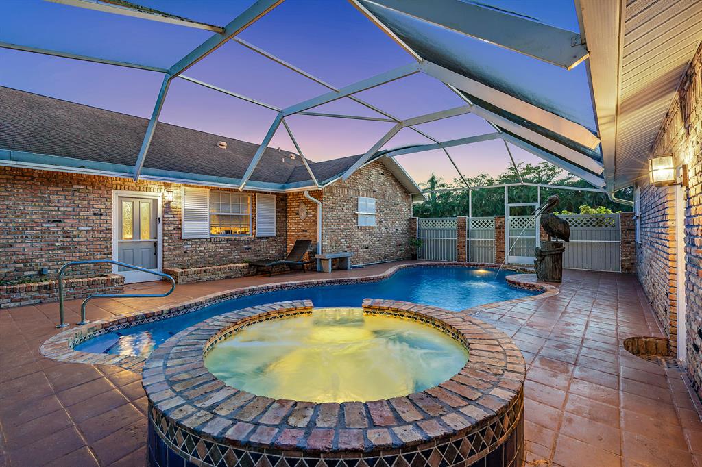 CBS home with Old Chicago brick, 4 bedrooms, + den and a 2-car garage. PLUS a 40x29 detached out building (built in 2004) which holds 6 cars and has electric. Whole house generator. Vaulted ceilings, coral stone wood burning fireplace, 20'' porcelain tile throughout and bamboo flooring in the bedrooms. Screened heated saltwater pool and spa with waterfall, (built in 2005) (heater 6 months old). Covered screened patio area (1440sf). Kitchen has solid wood cabinets, newer appliances (2016) and granite counters. Fenced corner lot with a new 35' gate and a concrete pad for an RV or boat. Roof 2004 (30 yr arch shingle), 2-A/C's (2015). 2 Water heaters. City water connected for drinking and a well for irrigation. Complete Plantation hurricane shutters and impact-front windows.