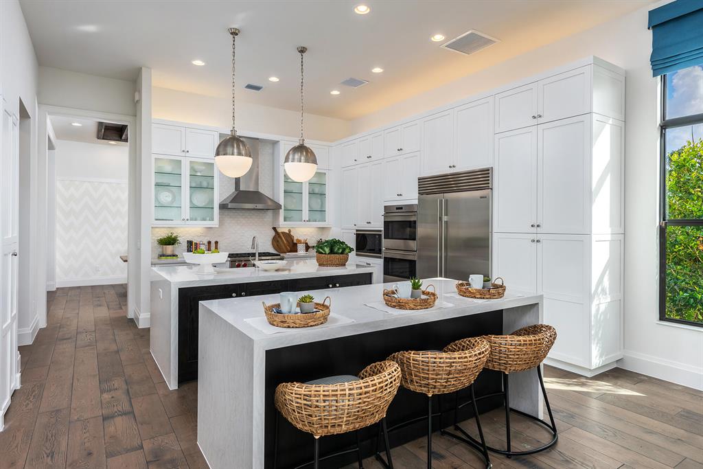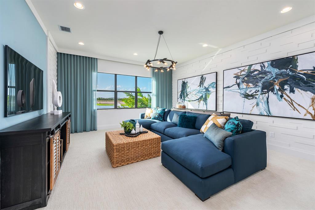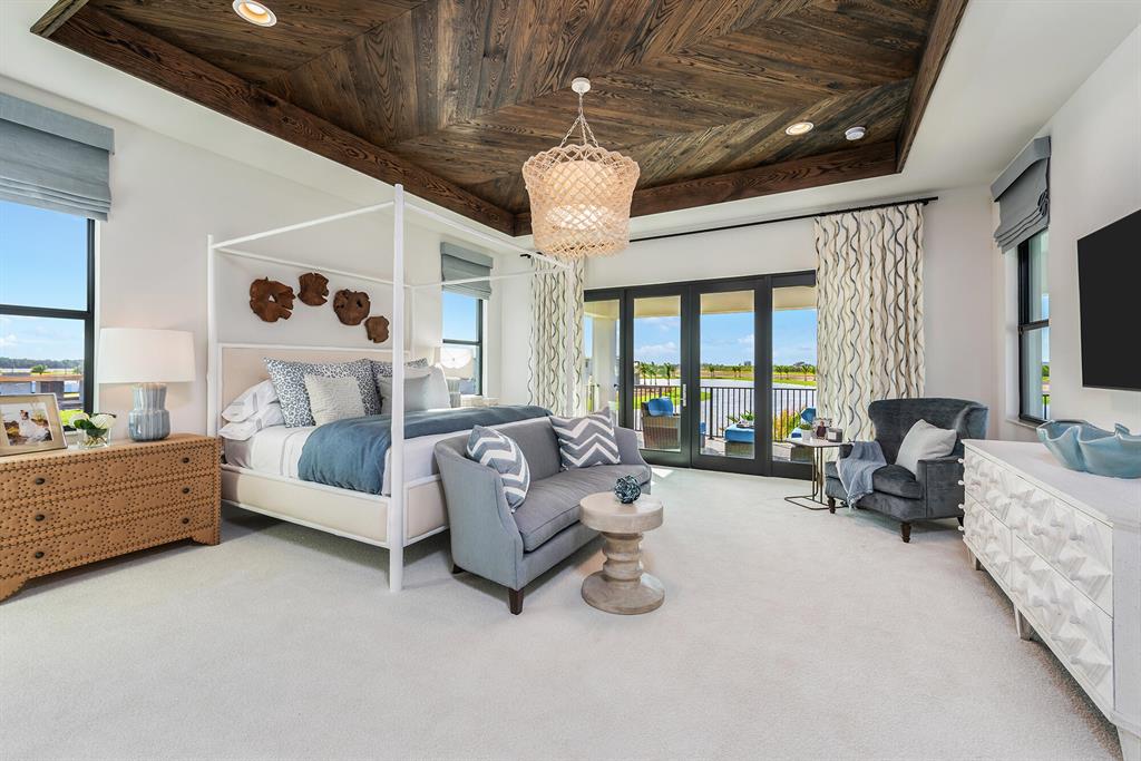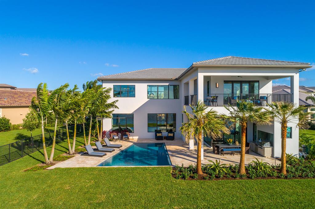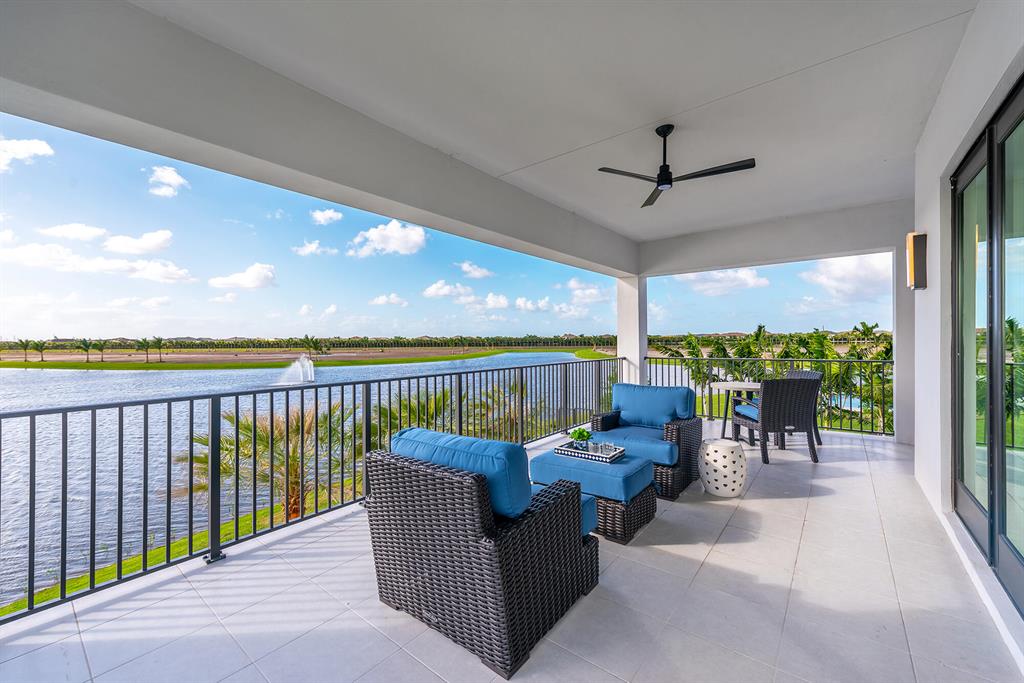 This 5 bedroom family home also boasts a club room, media room, loft, living room, family room and formal dining room. It has a gourmet kitchen open to the family dining and family room with access to the wet bar and coffee bar. The kitchen also has a walk-in pantry and double islands. There are zero-entry sliders off the family room bringing the outside inside when fully open. This house has a full cabana bath with a summer kitchen. The pool is a Contemporary Trapezoid Rim Flow pool sitting on an oversize pie shape lot. The master bedroom has an expansive covered verandah overlooking a magnificent fountain lakeview with beautiful western sunset views. Offers for the purchase of the Boca Bridges Model Homes will be in accordance with Seller's Model Home Sales Policies and Procedures