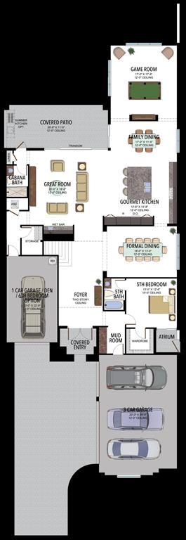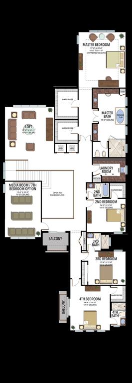 The Palma is one of our bestselling floorplans and this model sits on one of the most desirable lots in the cul-de-sac. This oversized pie shaped lot has some of the most beautiful views on model row. The home also features a covered verandah off the loft and the master bedroom overlooking these gorgeous water views. This amazing family house features a game room, great room, gourmet kitchen open to the great room, formal dining room, mud room, loft and media room in addition to 5 en-suite bedrooms. In addition to the covered verandah, this house features two additional balconies and an amazing covered patio overlooking a beautiful contemporary pool with raised sitting area, water features and planters.