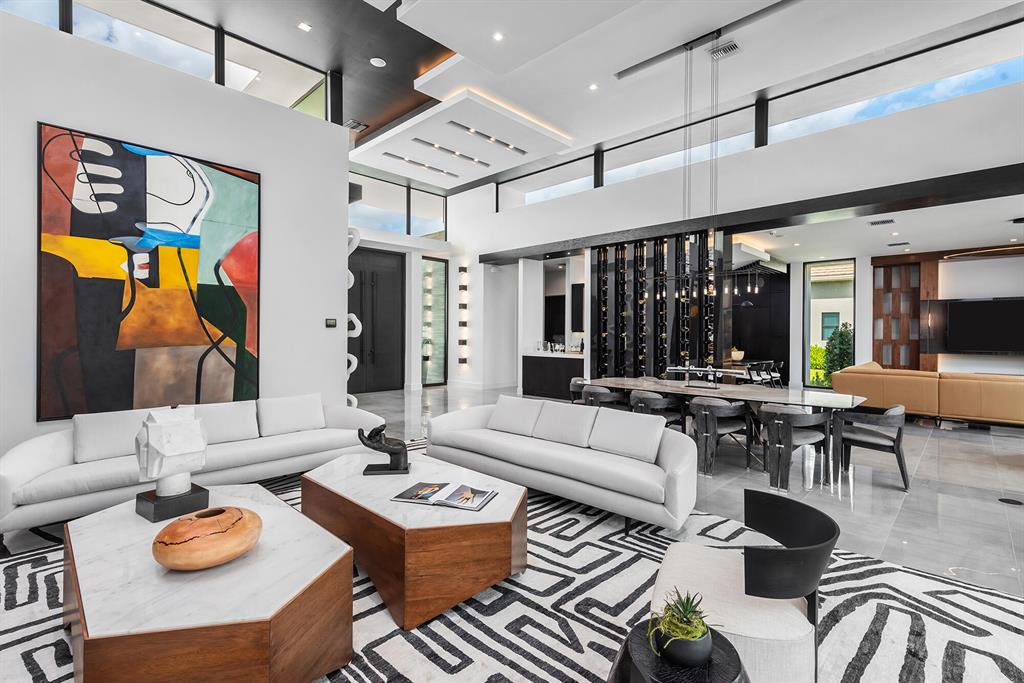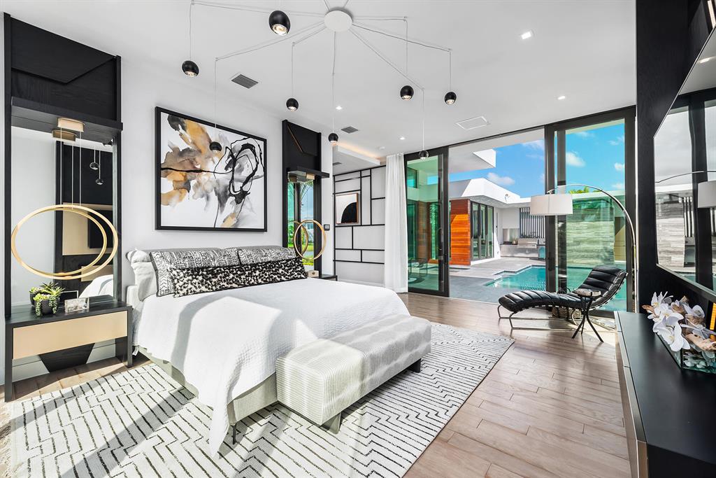 Modern one-story, open concept home with floor to ceiling windows/sliders throughout overlooking the stunning custom pool and beautiful lake. This home features a fabulous entertaining backyard with upgraded summer kitchen and custom pool with floating steps, water feature and bubblers. Some of the many highlights include: unique entry with water feature and 12' doors, 16' ceilings in living and dining areas, natural stone driveway/walkway, Ipe garage doors and extensive Ipe accents on exterior walls, modern gourmet kitchen with integrated appliances, spectacular modern master bath with floating vanities and walk-in integrated tub and shower overlooking the lanai.