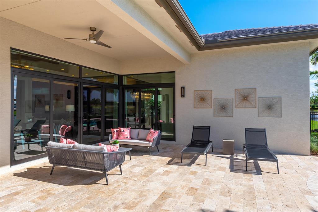 This 1 story great room floorplan is one of the most open floorplans in the Coastal Collection boasting a gourmet kitchen open to the great room, formal dining area and with only an open upgraded wet bar separating it from the club room. The great room has oversized sliders that open to a beautiful social pool with built-in bar top overlooking beautiful water view. Not only does this home have a 3 car garage, but it has the longest upgrade marble paver driveway in the cul-de-sac.