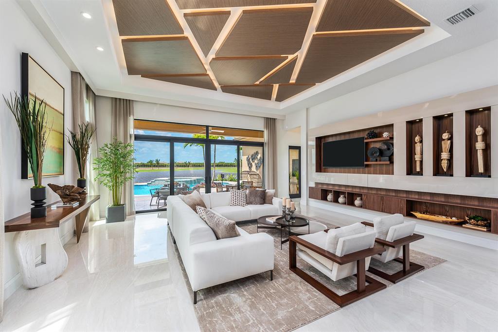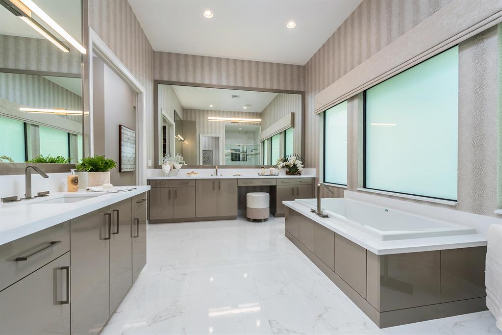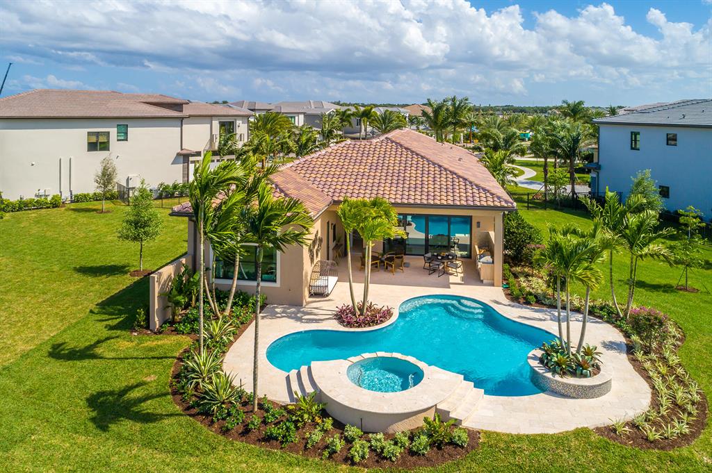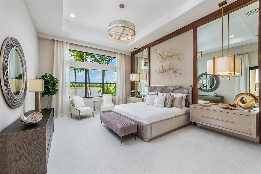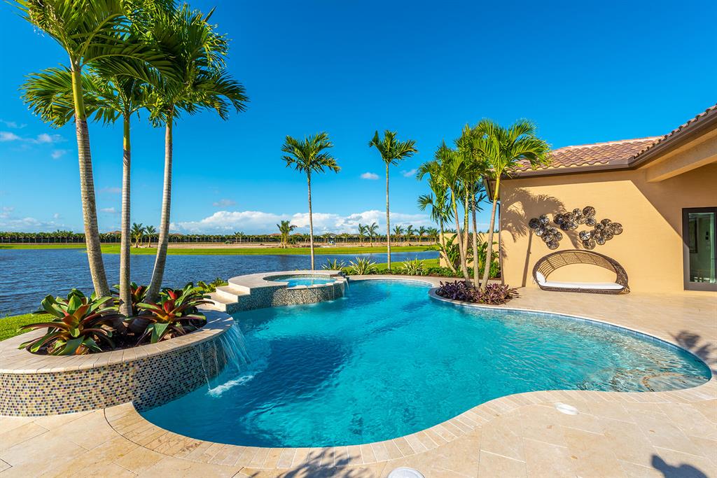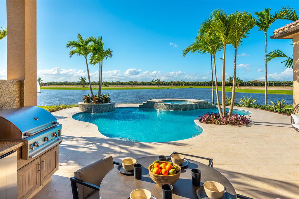 This model sits on an oversized cul-de-sac lot featuring the most breathtaking fountain lake views on the model row. This is a one story home featuring 3 bedrooms all en suite with walk-in closets and a den. There is an upgraded cabana bath with access to the covered patio. This is a great room floorplan with a formal dining room and open gourmet kitchen with 12 to 15 ft ceilings throughout. There is a beautiful upgraded summer kitchen in the covered patio overlooking a gorgeous lagoon style swimming pool with raised waterfall spa and planter with waterfall feature.
