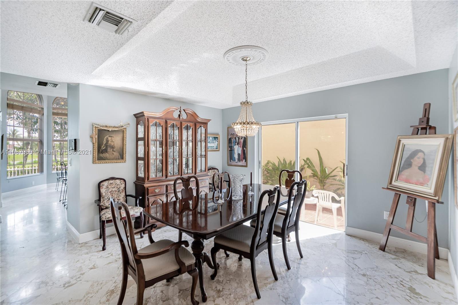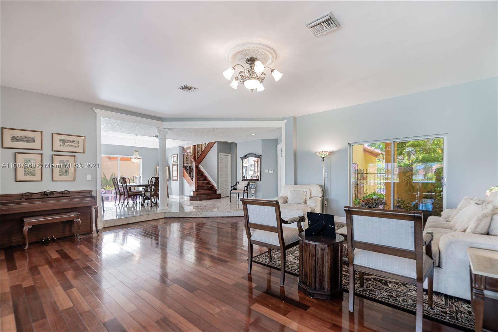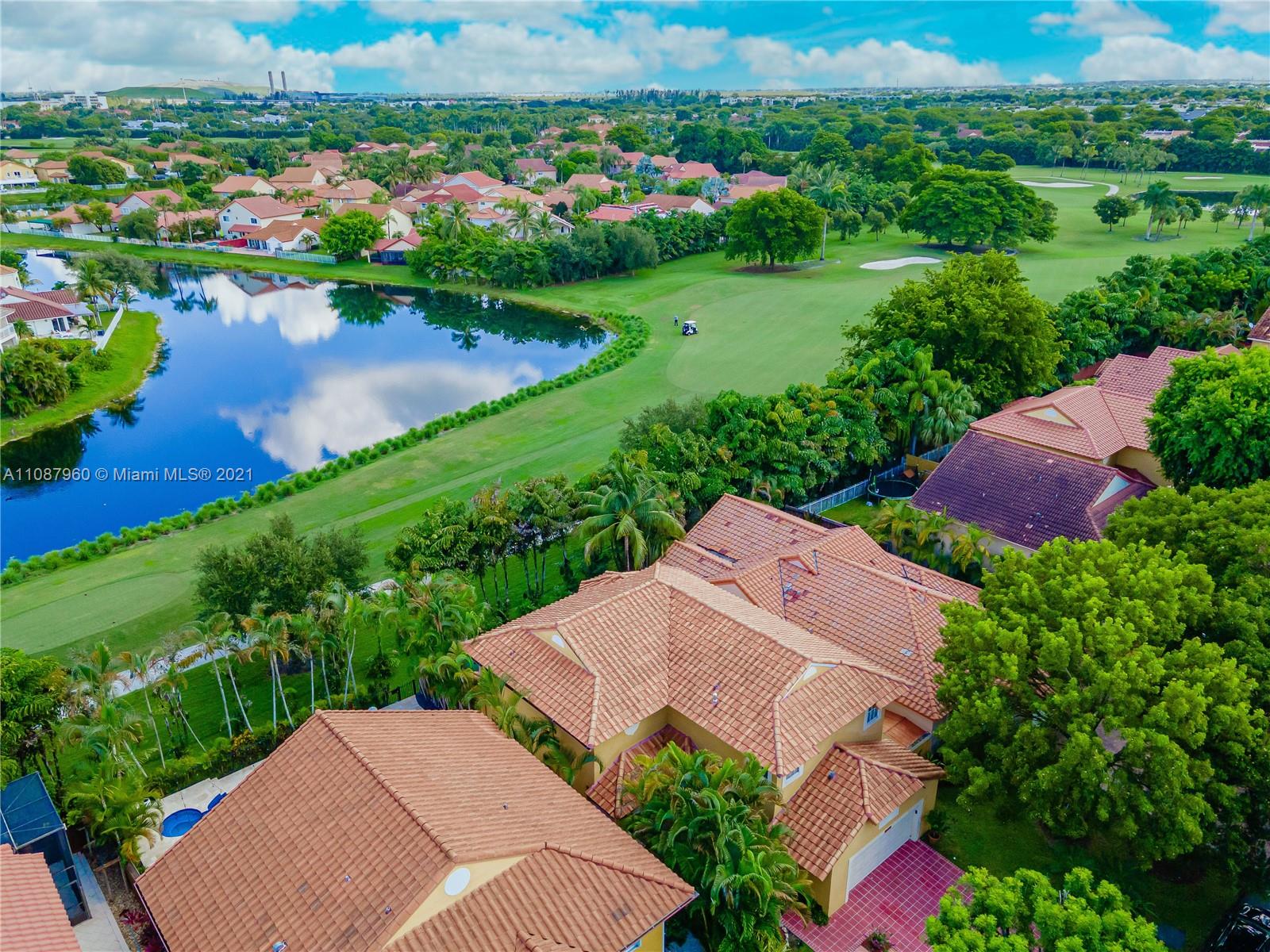 Outstanding 4/3 single family 2,967 sq ft home directly on Silver Fox Golf Course in prestigious Doral Dunes. Beautiful unobstructed golf/lake views. Very spacious formal living, dining, added family room and kitchen w/ tall bay windows, informal dining, island, wood cabinets, granite counters + SS appliances. Brazilian cherry wood and marble in first floor. Chicago bricks and canopy in relaxing patio. Wood/wrought iron stairs up to bedrooms. Huge master with terrace, marble bathroom (shower, jacuzzi, bidet). New roof under warranty till 2028. Brand new A/C. Gated community with 24hr guard. Access to Doral Park Country Club w/excellent amenities: pool, gym, tennis, basketball, volleyball, kid's playground, sauna, 2 restaurants, bar and more. Must see it! Call listing agent.