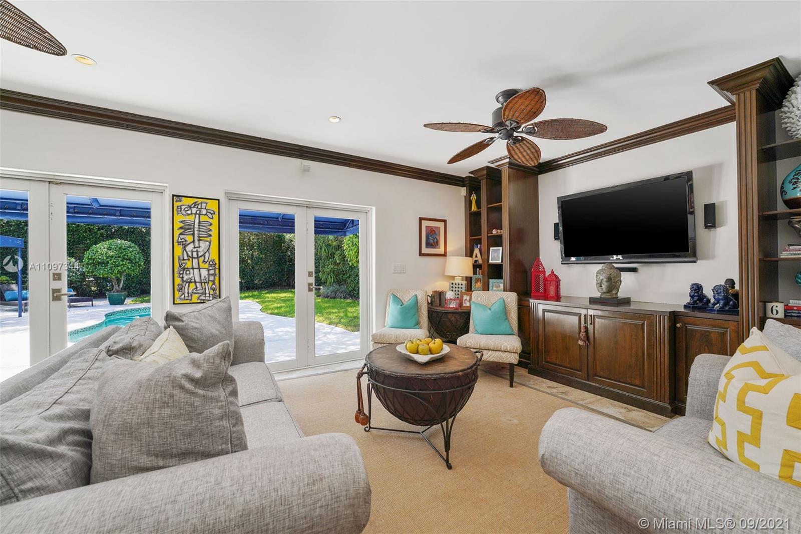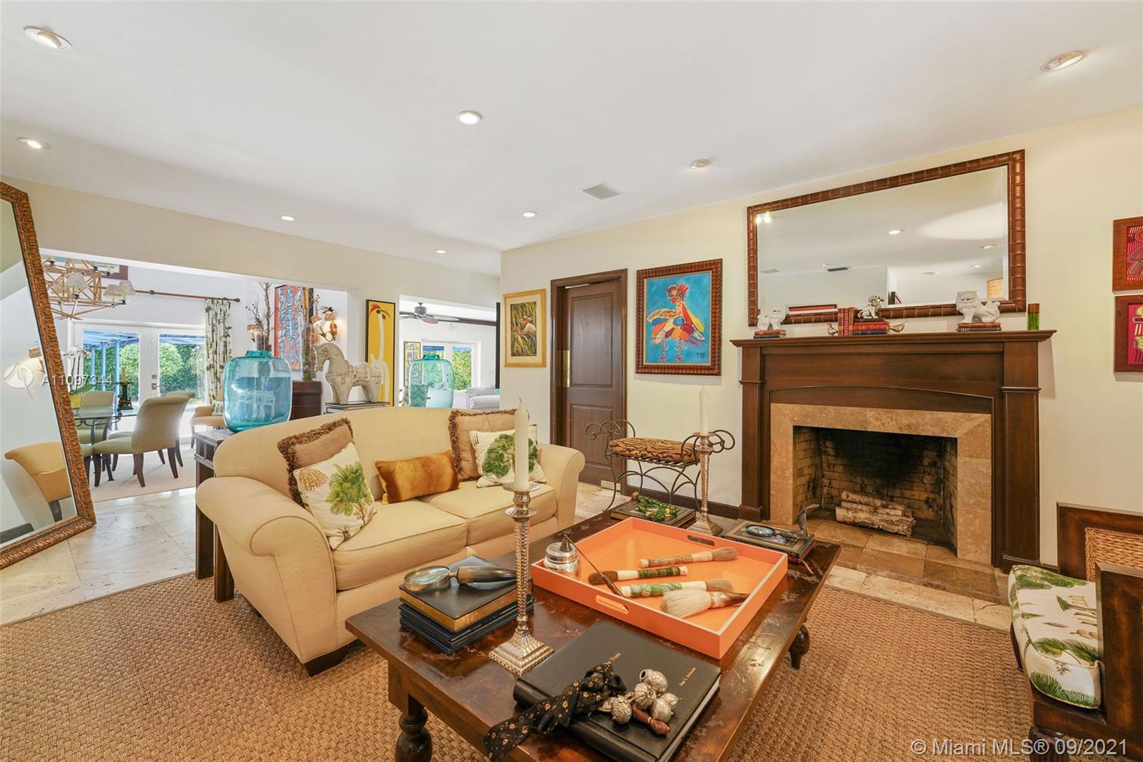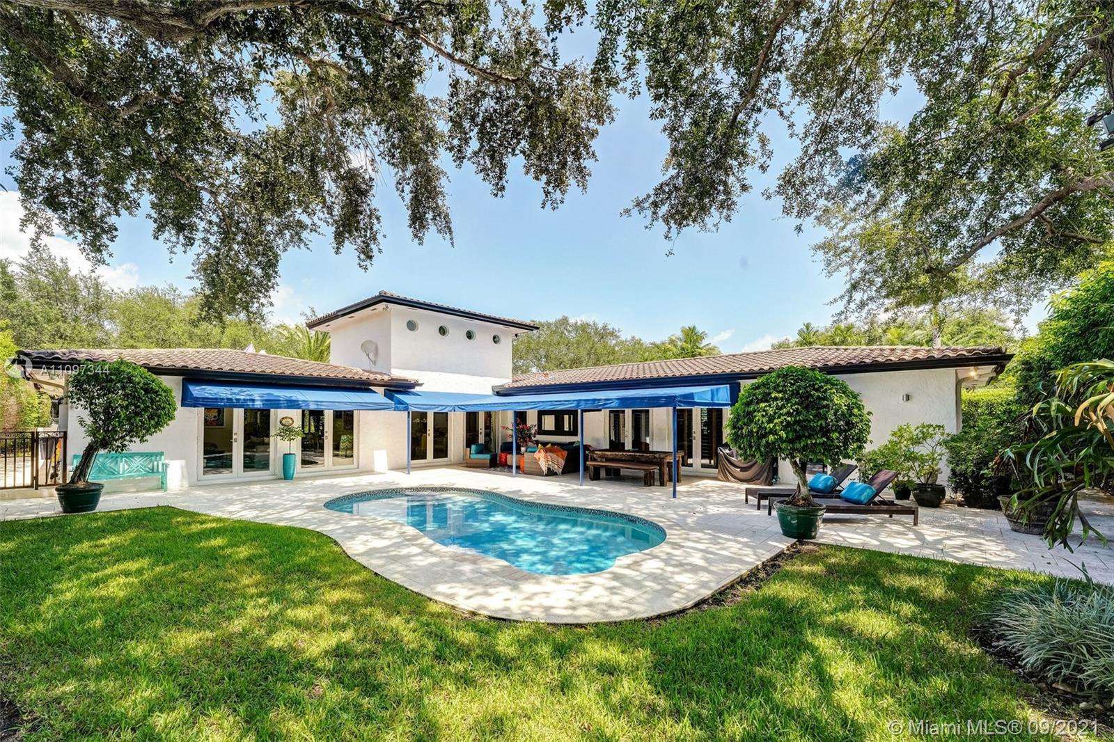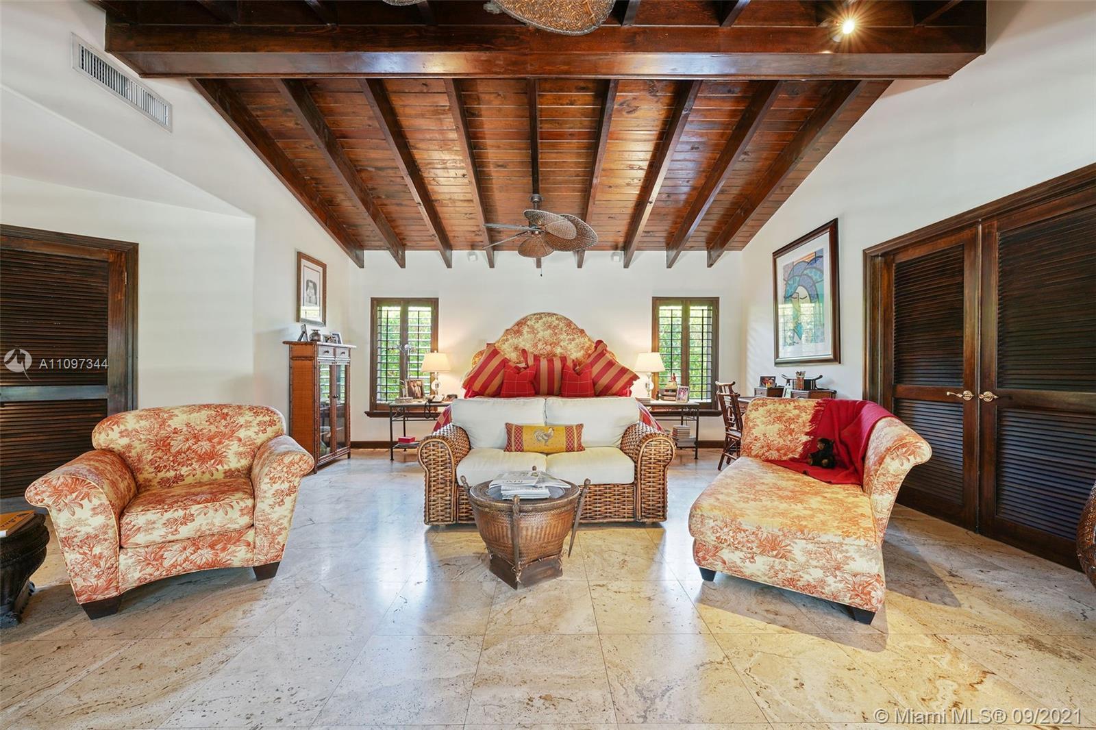 INVITING EXTERIOR WELCOMES YOU TO THIS IMPECCABLE SOUTH GABLES POOL HOME LOCATED ON QUIET STREET. CHARMING LIVING ROOM W/FIREPLACE, PLANTATION SHUTTERS & MARBLE FLOORS OPENS TO FORMAL DINING ROOM W/SOARING CEILING. WELL-EQUIPPED KITCHEN W/BISTRO DINETTE AREA, GENEROUS STORAGE & INTERIOR LAUNDRY NEARBY. LG FAMILY ROOM W/ACCESS TO FREE-FORM POOL & AWNING-PROTECTED PATIO OFFERING YEAR-AROUND GRACIOUS OUTDOOR ENTERTAINING. SPACIOUS & PRIVATE MASTER BEDROOM W/WOOD BEAM CATHEDRAL CEILING, GENEROUS CLOSETS INCLUDING LARGE WALK-IN, DIRECT ACCESS TO POOL/PATIO. LG MASTER BATH W/DUAL SINK VANITY, SEPARATE SPA TUB & SHOWER, ADD'L VANITY W/AMPLE STORAGE. EXTRA BONUS ROOM W/CLOSET OFFERING AREA FOR MEDIA, OFFICE, PLAYROOM, MAID'S QTRS, ETC. IMPACT GLASS, EXTERIOR LIGHTING & LUSH LANDSCAPING!