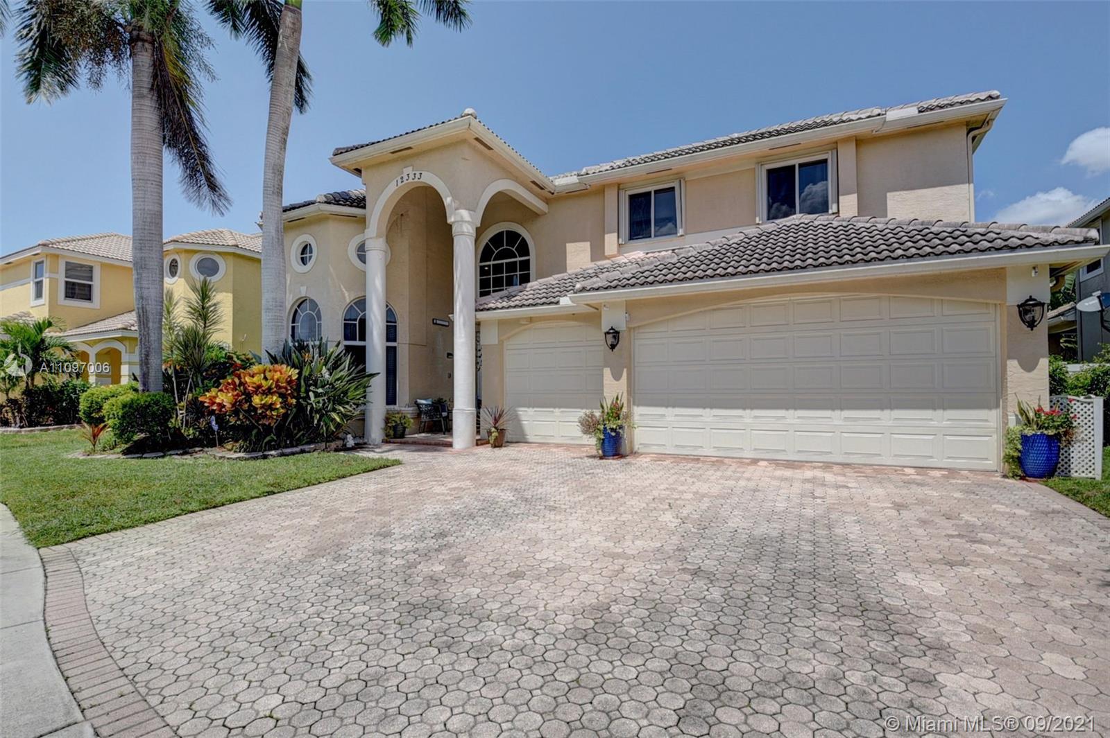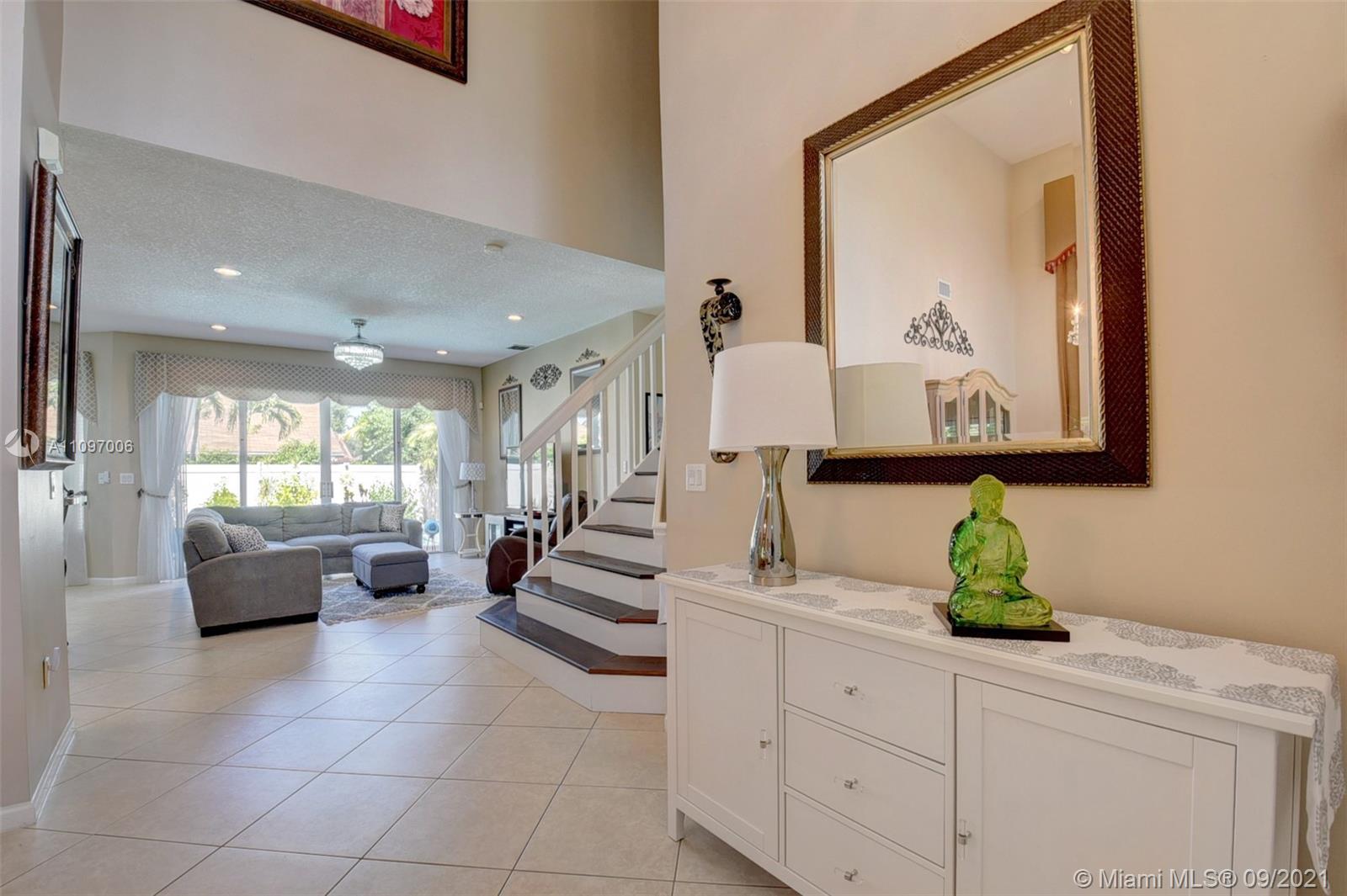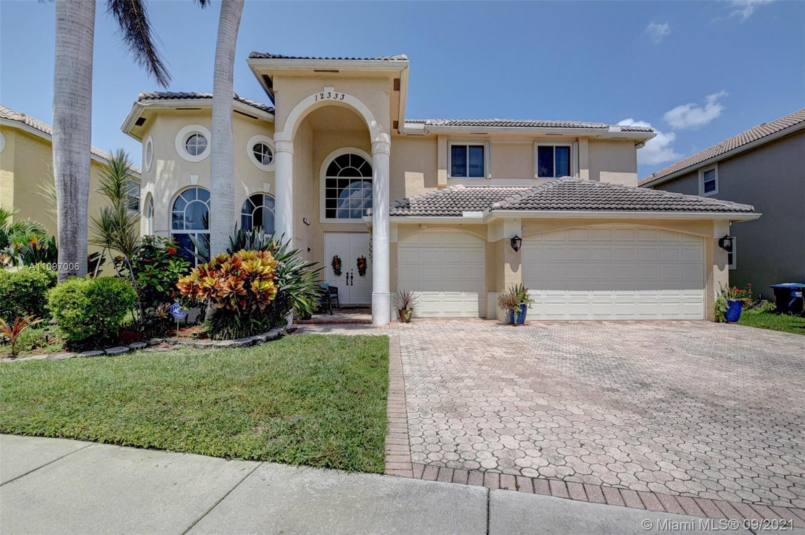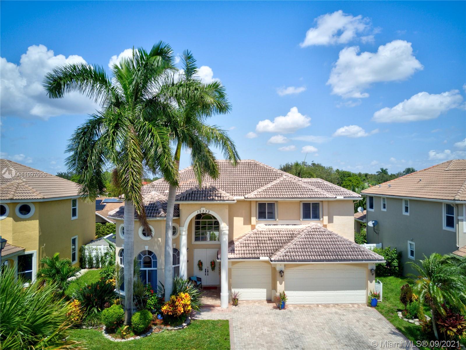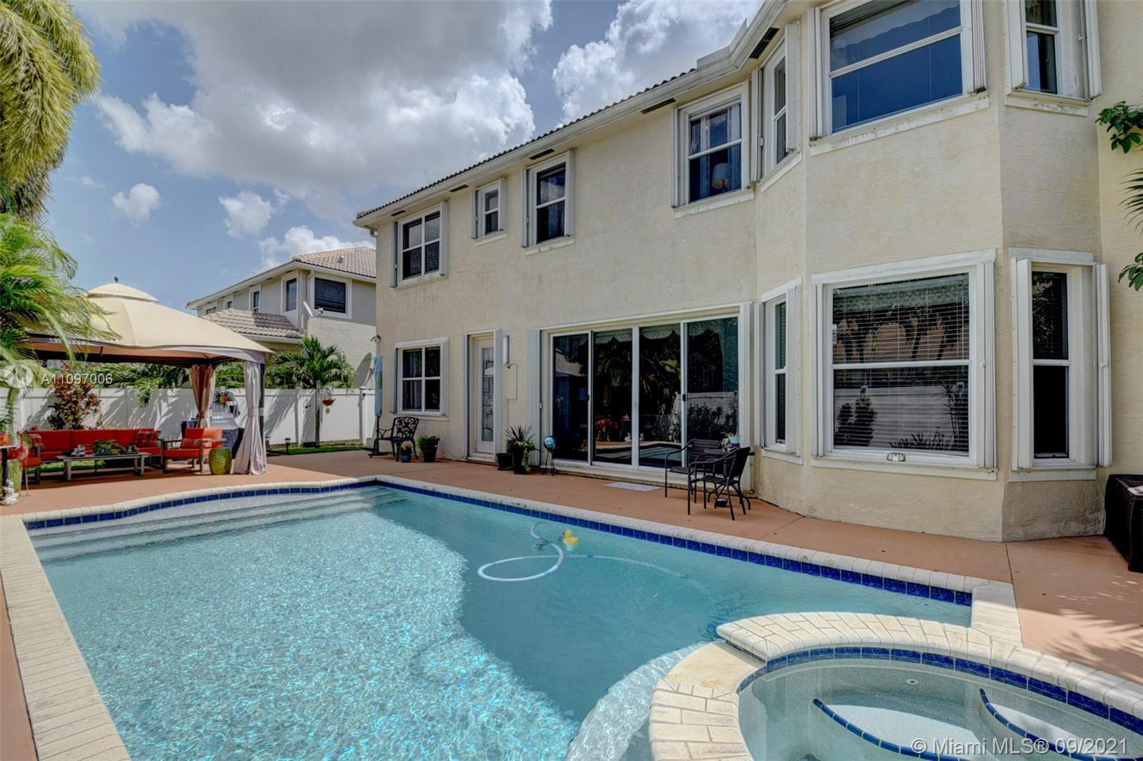 Eagle Lakes in Coral Springs. This gorgeous, spacious 5 bedroom/ 3 bathroom, 3 car garage with one car converted for storage but easily converted back, 20' volume ceilings, single family pool home. Community is gated for security, low HOA. Master bedroom is upstairs and boasts separate tub and shower, dual sinks and ample walk in closet. One bedroom and full bath on main level. Kitchen has upgraded white cabinetry, stainless appliances and looks out to the spacious and private backyard with fully fenced yard. Neutral tile downstairs, upgraded laminate throughout 2nd floor. All bathrooms updated, Accordion shutters, roof 2003, A/C outside 2019, inside upstairs 2018 and inside downstairs 2012, water heater 2019.