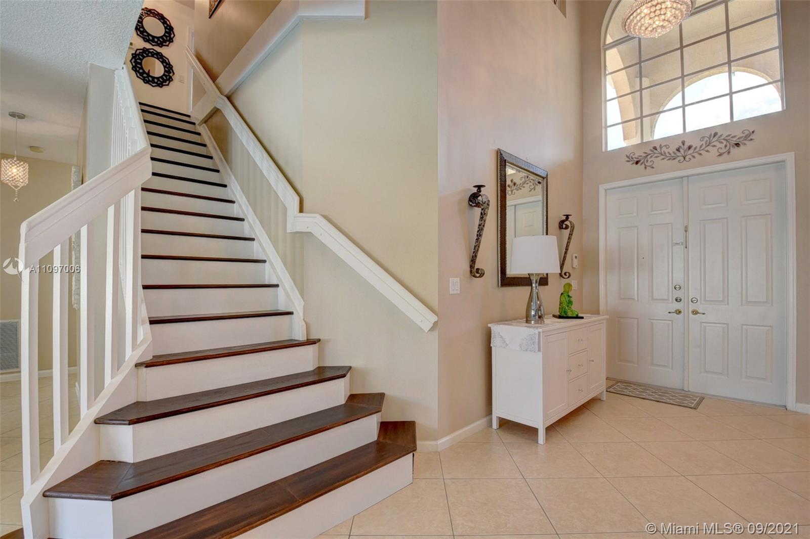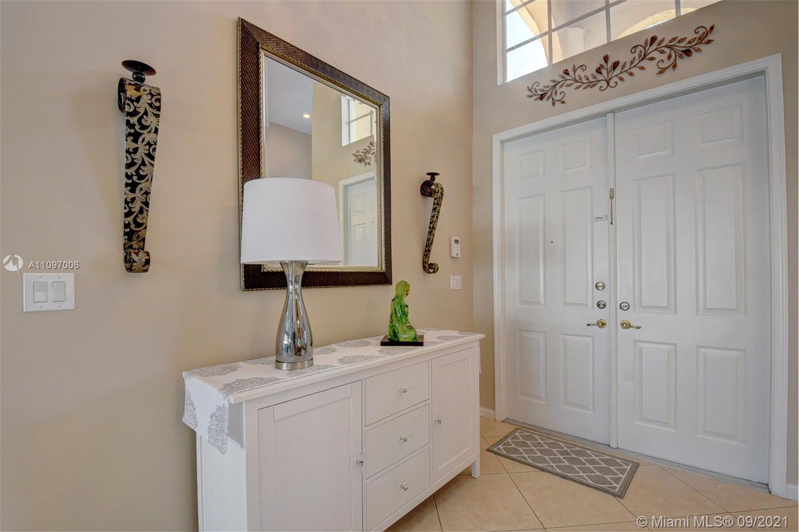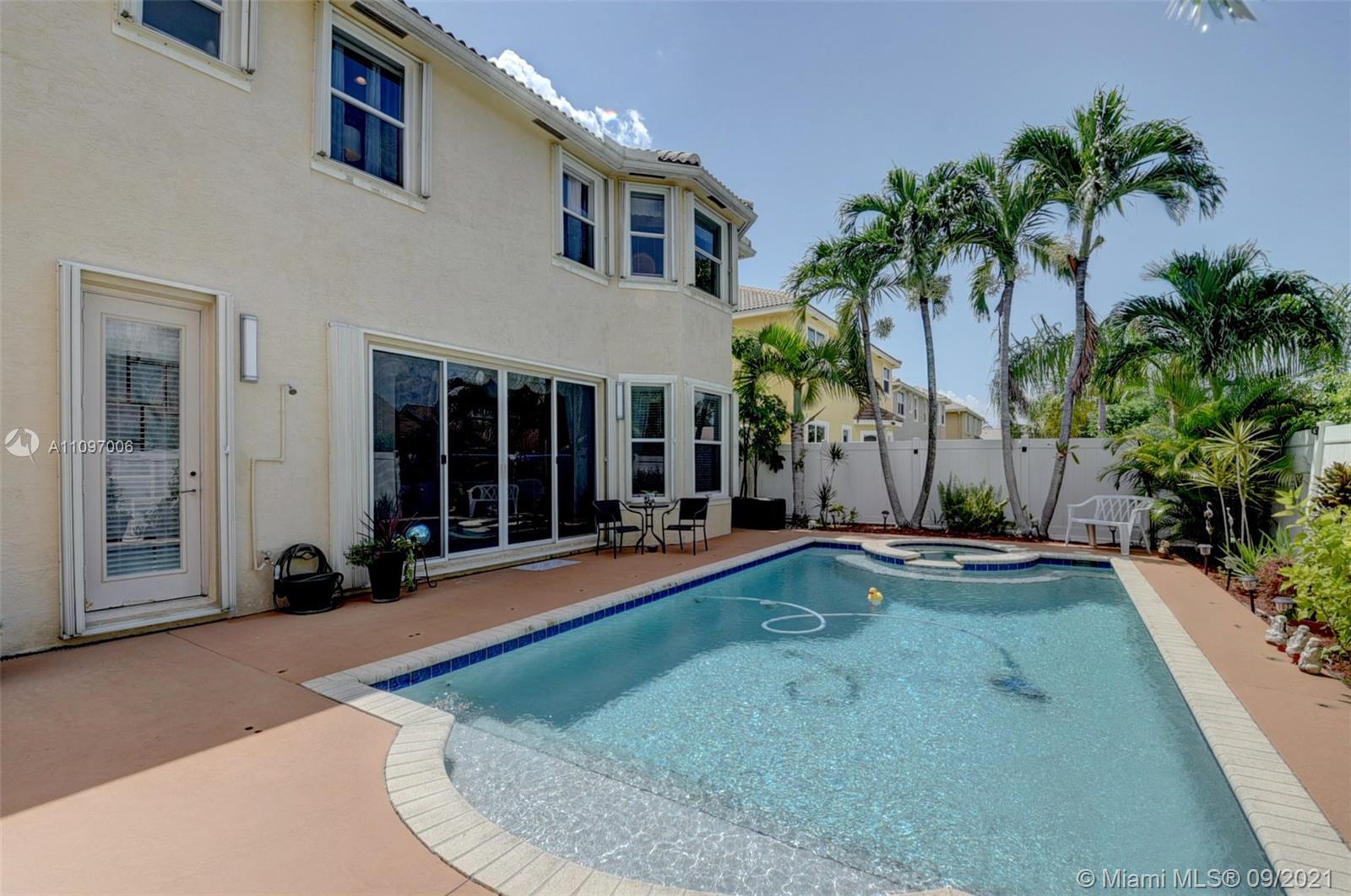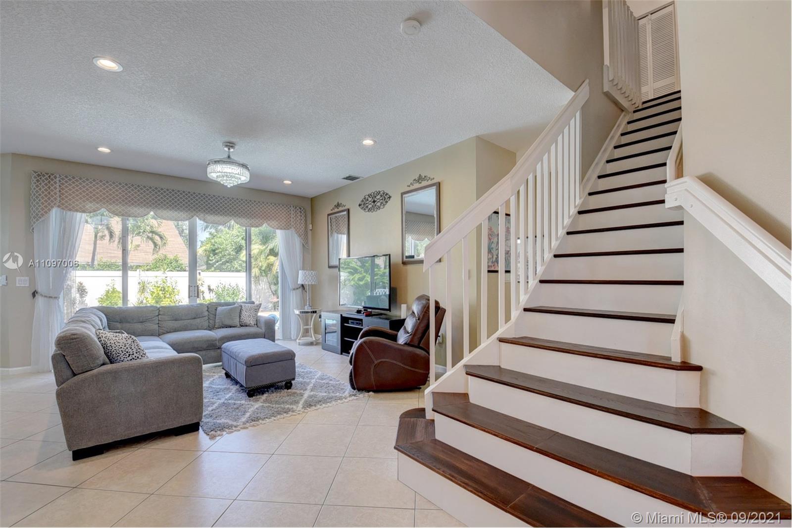 Eagle Lakes in Coral Springs. This gorgeous, spacious 5 bedroom/ 3 bathroom, 3 car garage with one car converted for storage but easily converted back, 20' volume ceilings, single family pool home. Community is gated for security, low HOA. Master bedroom is upstairs and boasts separate tub and shower, dual sinks and ample walk in closet. One bedroom and full bath on main level. Kitchen has upgraded white cabinetry, stainless appliances and looks out to the spacious and private backyard with fully fenced yard. Neutral tile downstairs, upgraded laminate throughout 2nd floor. All bathrooms updated, Accordion shutters, roof 2003, A/C outside 2019, inside upstairs 2018 and inside downstairs 2012, water heater 2019.