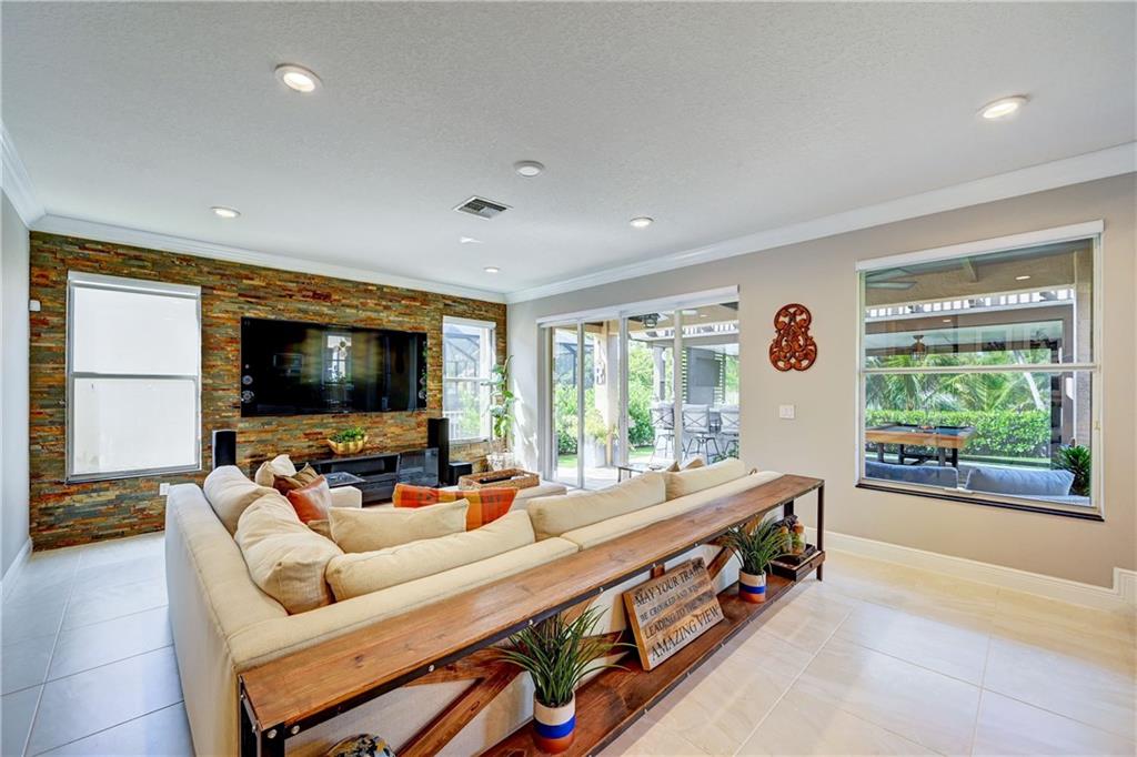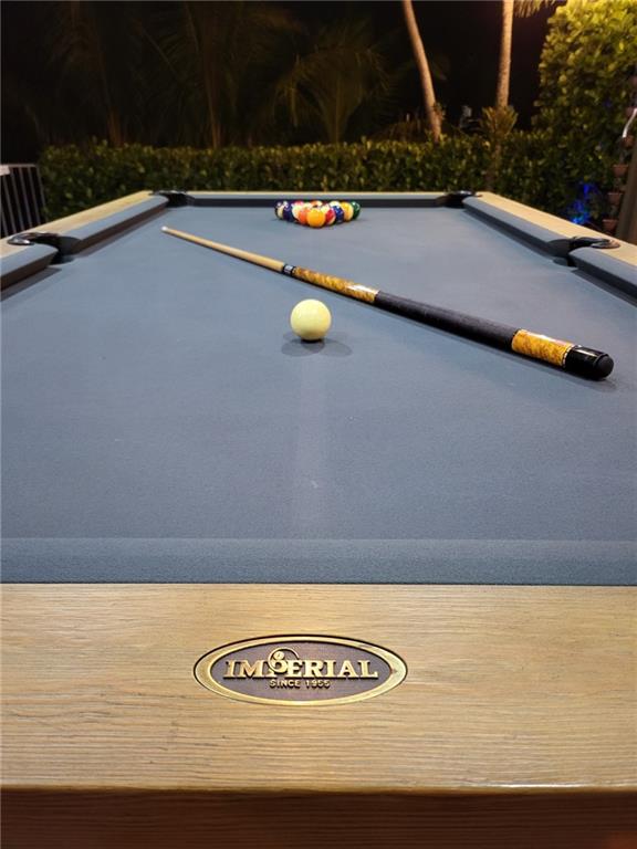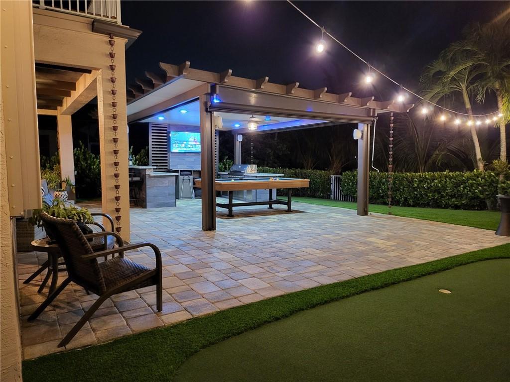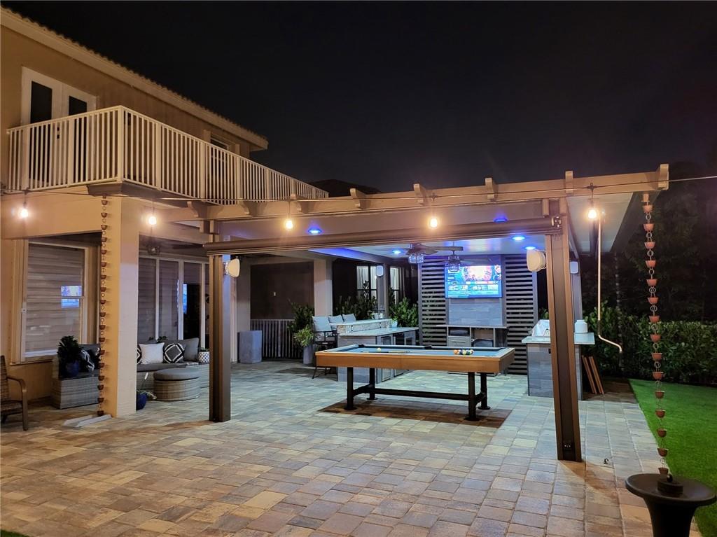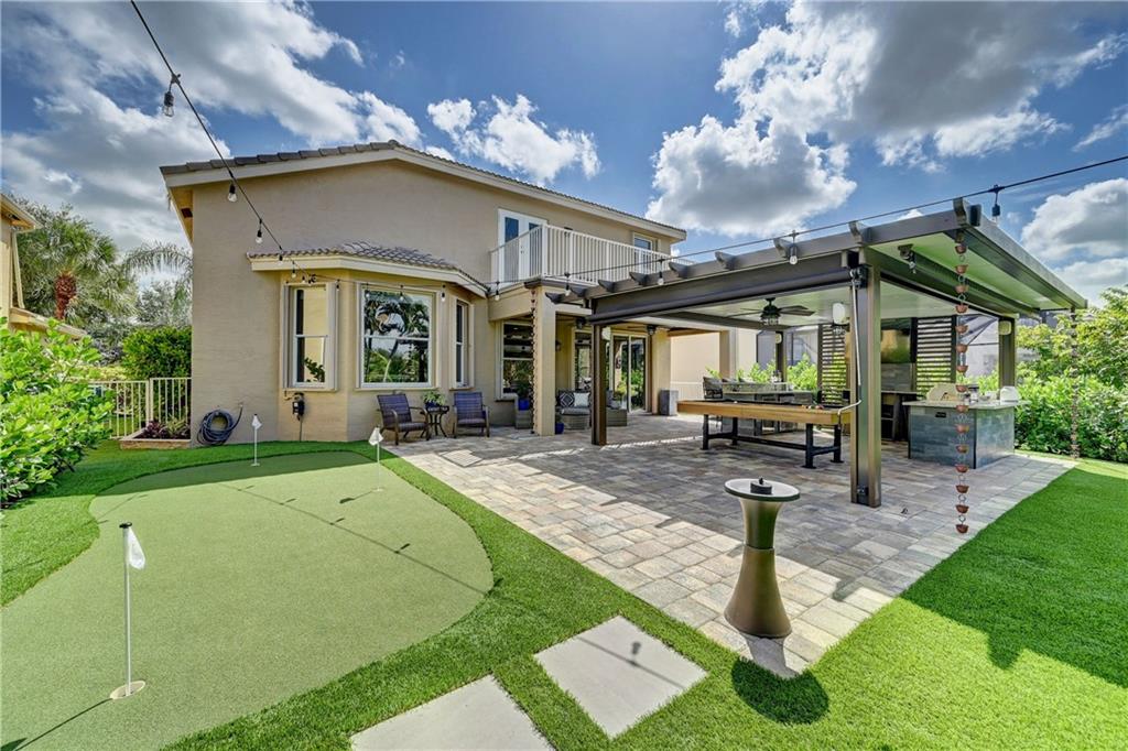 2978 sq ft home in gated community with natural light and custom upgrades throughout that include Cat5 cable and hurricane shutters. Modern floor plan with large living spaces and vaulted ceilings. Kitchen has granite counters, stainless 3-door fridge (Samsung), dishwasher, built in oven, stove and microwave (LG). 2 new central A/C units (Carrier) with Smart Thermostats. New exterior paint. Master bed has his/her bathrooms with shared shower, his/her walk in closets that measure 10'x5' and 7'x5' and French doors onto a balcony. Entertainer's paradise with privacy landscaping, putting green, Pergola with shade screens (can be lowered/raised), recessed lighting, TV, grill, fridge and pool table with table top/ping pong. Low HOA fee @ 145/mo (includes internet, pool, gym, 24hr security)