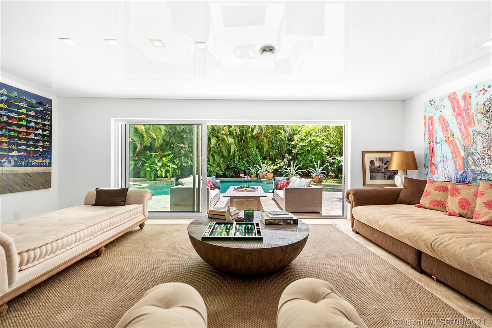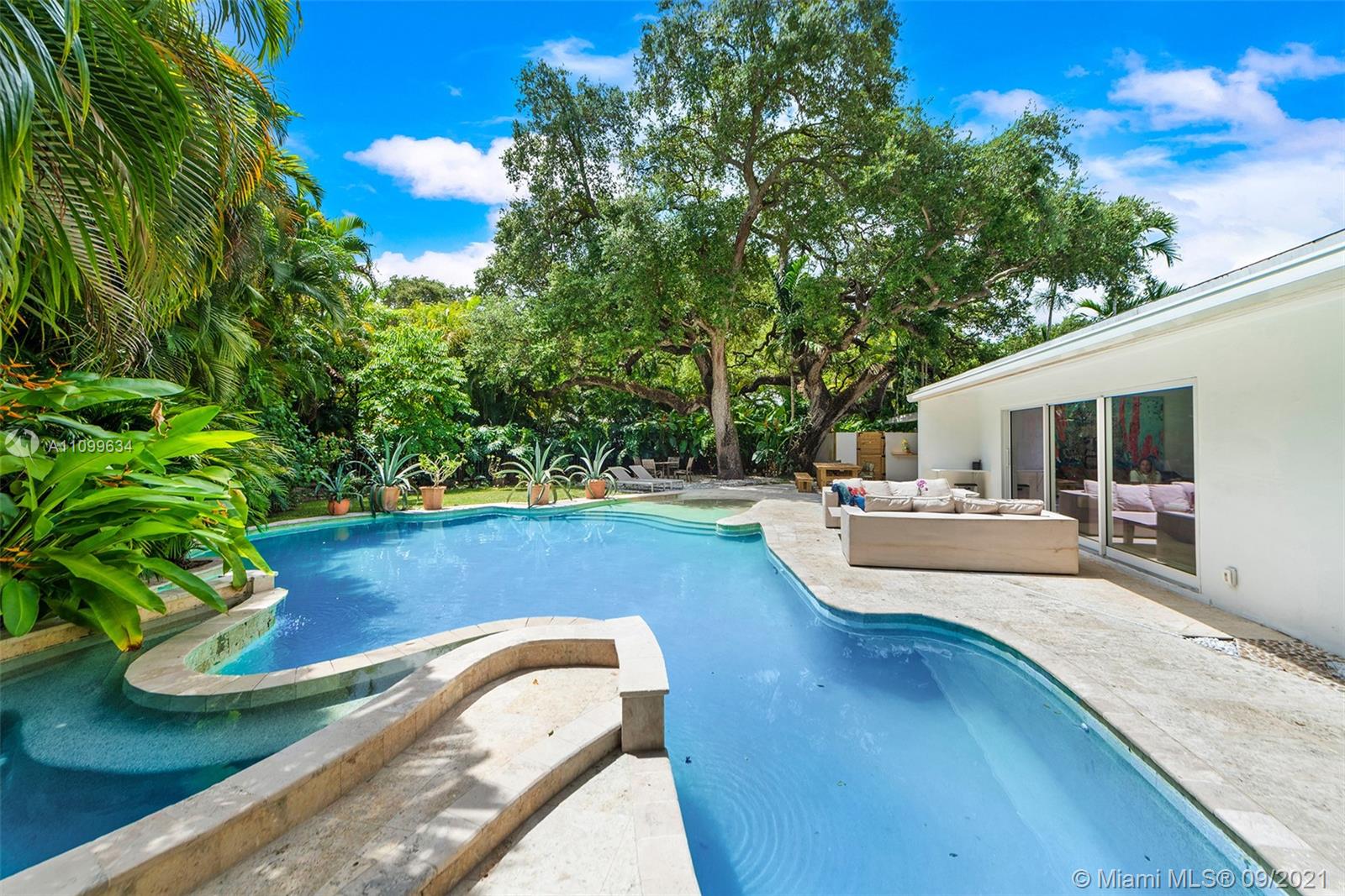 Once in lifetime Miami Shores opportunity to live in a private, tropical oasis under majestic oaks overlooking a stunning, free form pool with beach, jacuzzi, and waterfall! This beautifully updated 4 bed 3 bath, midcentury modern residence offers 4 distinct outdoor living areas for your daytime and evening enjoyment. The open floor plan features large rooms with floor to ceiling impact sliding doors throughout that exaggerate the lush greenery that surrounds the residence for a true indoor / outdoor living experience. Gourmet kitchen with quartz counter tops and VIKING gas stove. Brand new master wing features luxurious walk-thru closet, custom dual sink vanity, oversized shower, and separate extra large soaking tub with a view of your private tropical oasis! 2 A/C units Gas water heater!
