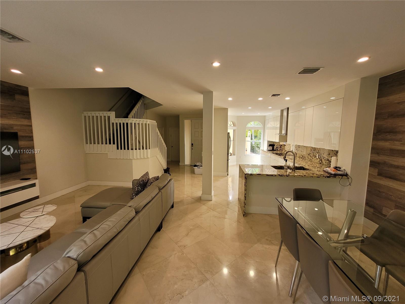 Beautifully renovated gated townhouse tucked away in the prestigious neighborhood of Aventura. This meticulously maintained property is a must see! Elegant details and amenities throughout! The fully equipped chefs kitchen includes top of the line appliances. Modern white lacquered cabinets with striking granite waterfall countertop. Newly polished marble floors throughout the first floor. Backyard has brand new flooring which gives it a fresh clean look. A laundry nook conveniently located on the first floor. Large open living room and dining room complete the first floor. The second floor offers a spacious master suite with bamboo flooring a large walk in closet and large private full bath with relaxing spa like tub and shower. 3 other bedrooms and full bath complete with second floor.