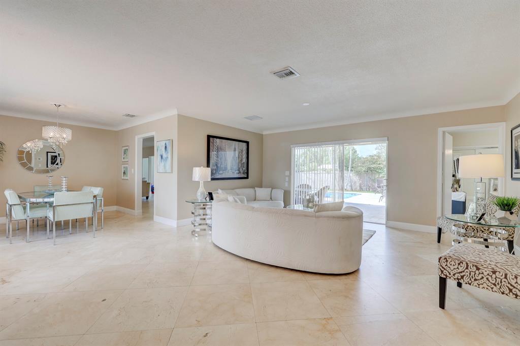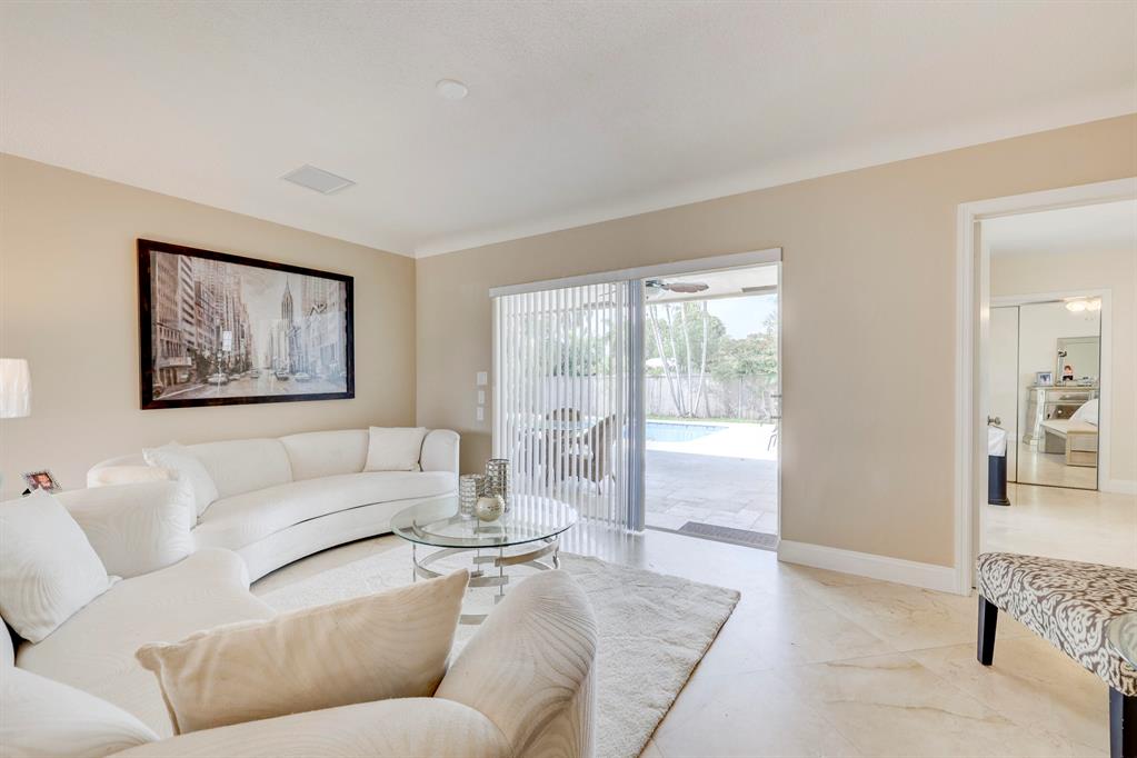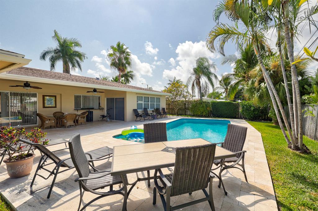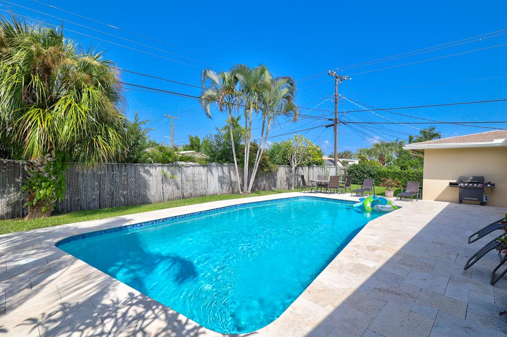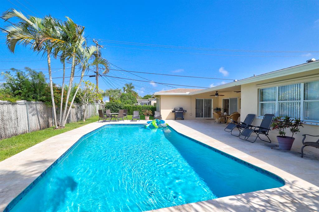 This beautiful updated well-maintained 3/2 pool home with a bonus room to use as an office, playroom or 4th bedroom is situated in a desirable area on a quiet low traffic street. Enjoy the ambiance of the front of this home with little gated front patio and a huge circle drive that fits 7 cars, or boat, RV, jet skis, etc and 2 car garage. The features include an awesome 1500' marble paver patio with covered area. Refinished diamond brite pool with new glass tile. Great for entertaining and BBQ's. Nice lawn area is all privacy fenced. The rooms are freshly painted with ceiling fans in every room. Granite kitchen stainless appliances. Conveniently located less than 2 miles to beaches & nearby shops, grocery, and restaurants. NO HOA, no monthly fees, NO Restrictions.