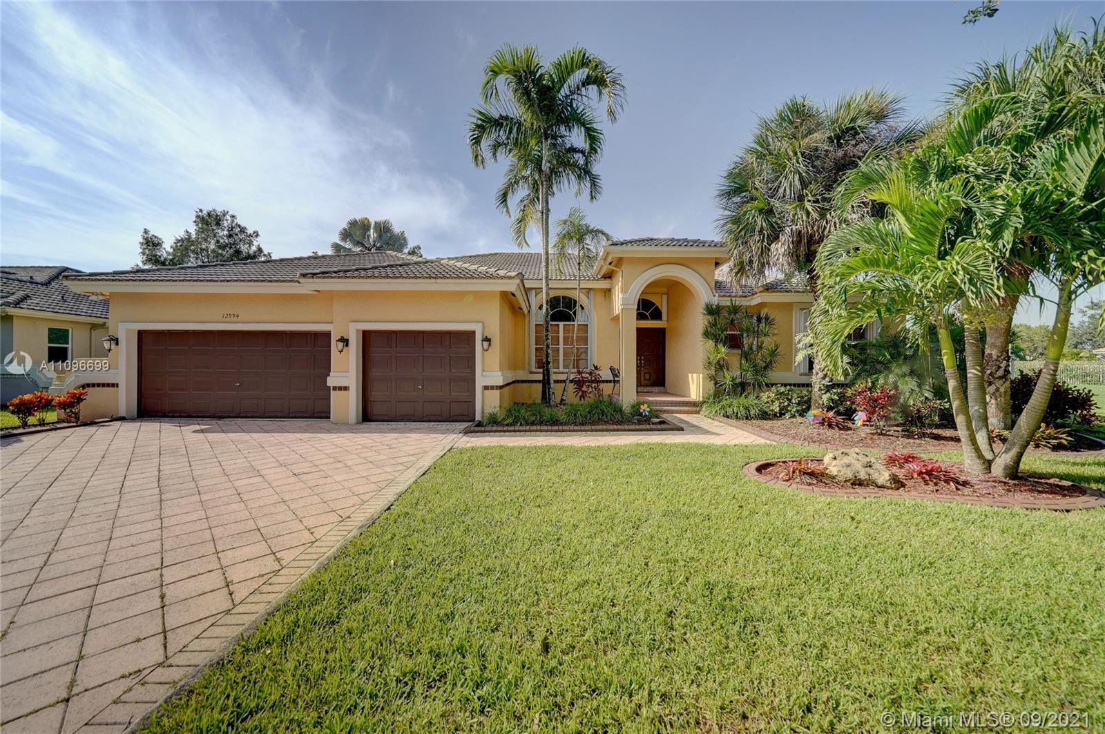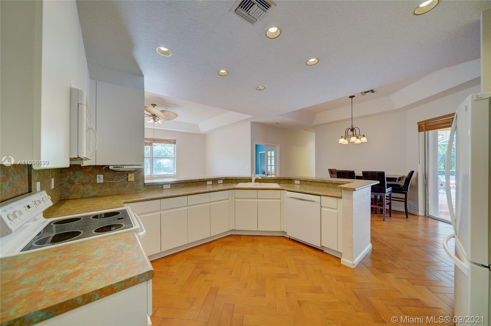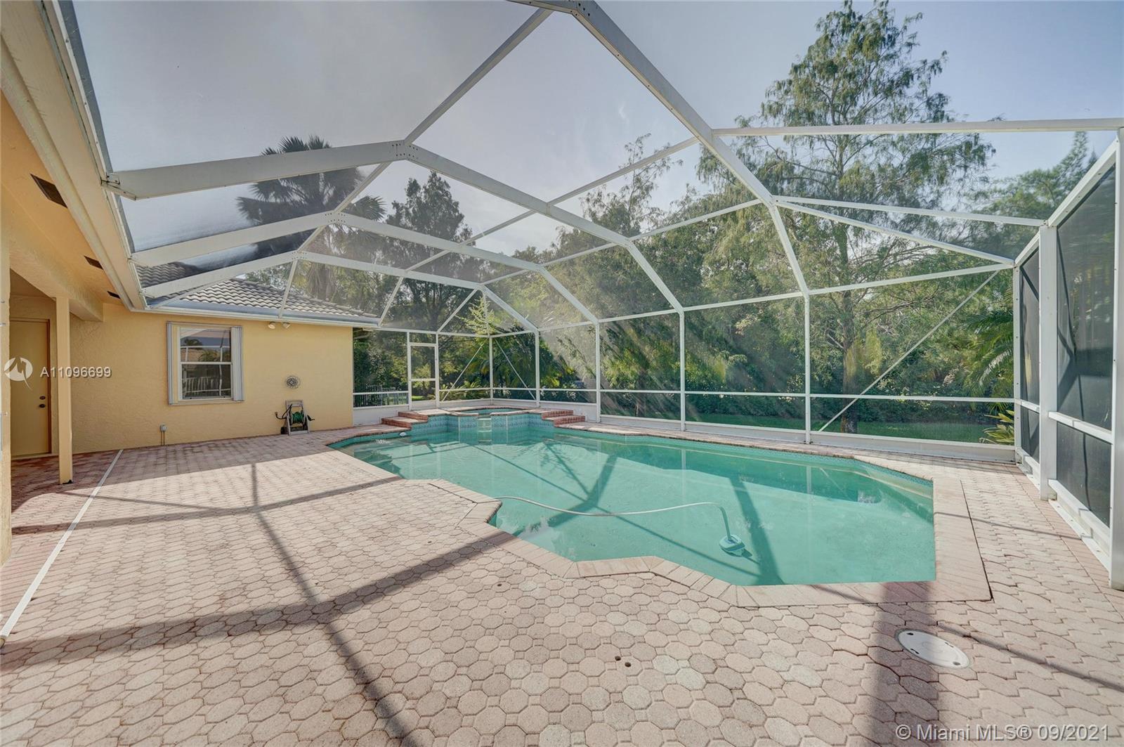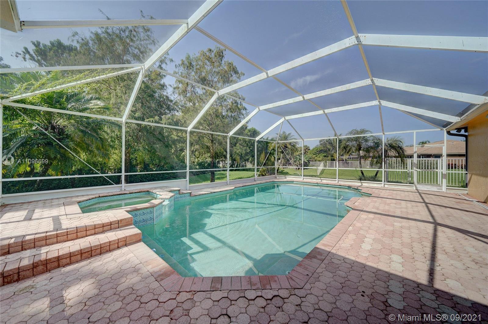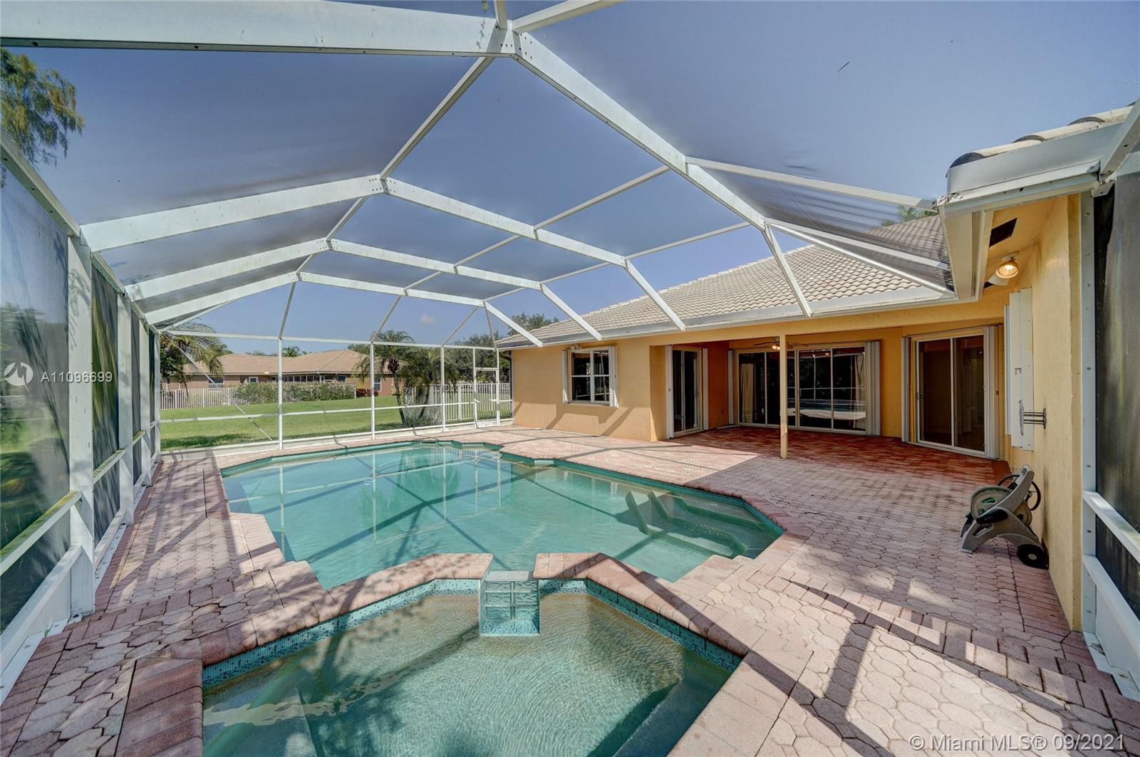 Rarely available home in the guard gated community of Country Glen. Sought after split floor plan in this 5 bedroom 3 bathroom home on over a quarter acre of land. Gorgeous neutral herringbone tile floors in all main living areas, and 5th bedroom. Soaring ceilings in the living and dining room. Oversized master suite with tile flooring, and dual closets including large walk-in. Master bath features dual sinks, and separate tub and shower. Open kitchen overlooks the spacious family room. Big secondary bedrooms with laminate flooring, and one with en-suite. Expansive covered patio overlooking the screened in pool, and canal. Accordion shutters, and plenty of amenities in the community including child playground, tennis courts and basketball.