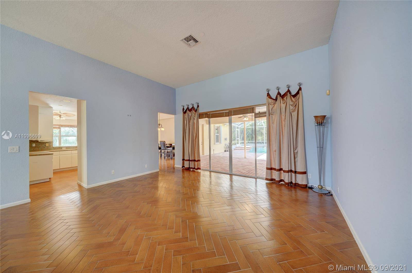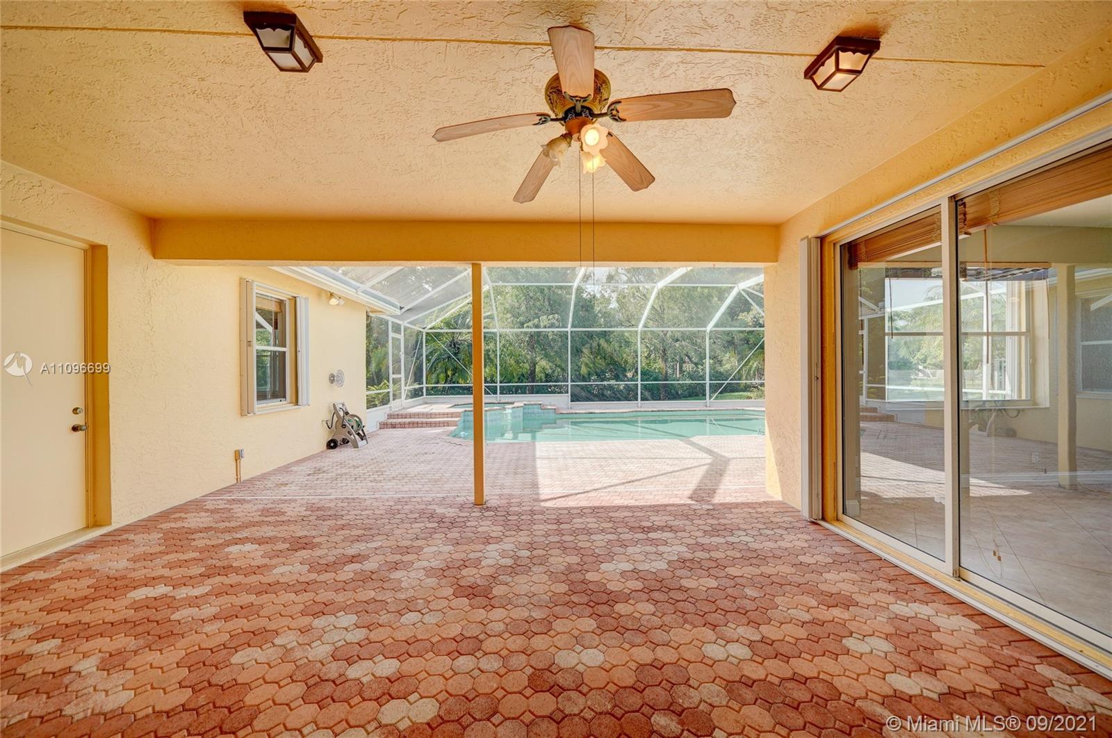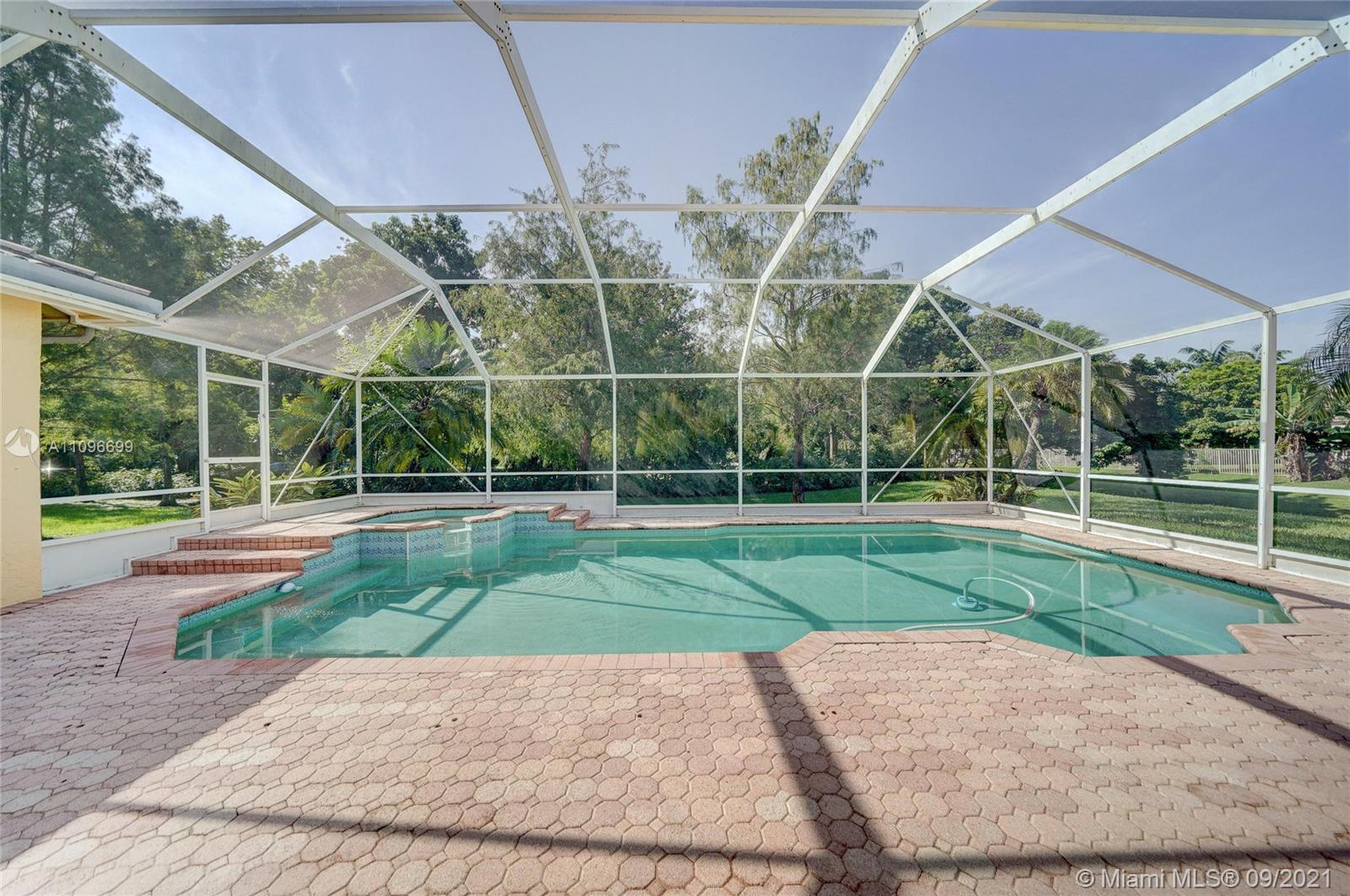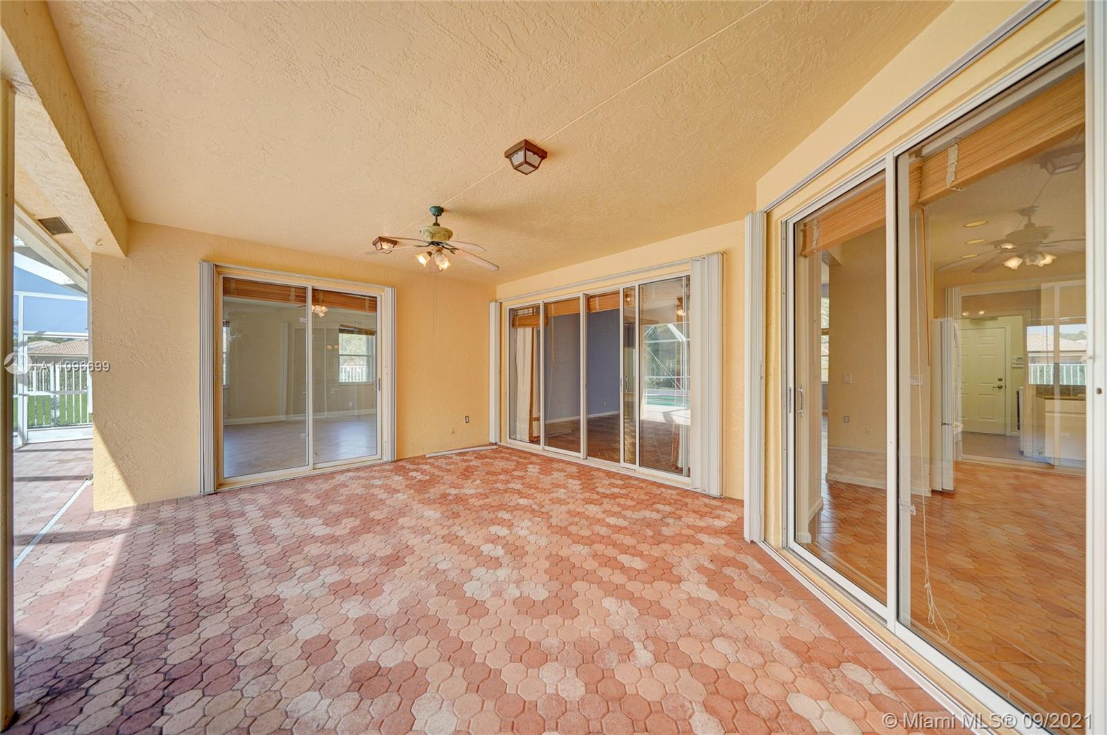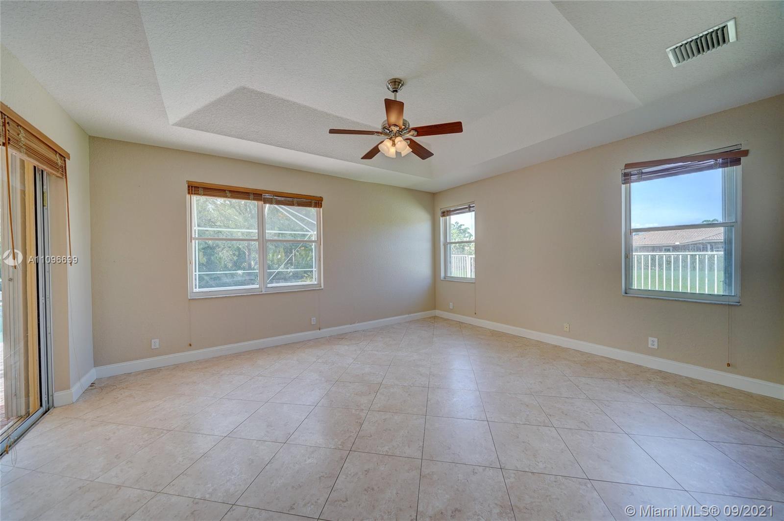 Rarely available home in the guard gated community of Country Glen. Sought after split floor plan in this 5 bedroom 3 bathroom home on over a quarter acre of land. Gorgeous neutral herringbone tile floors in all main living areas, and 5th bedroom. Soaring ceilings in the living and dining room. Oversized master suite with tile flooring, and dual closets including large walk-in. Master bath features dual sinks, and separate tub and shower. Open kitchen overlooks the spacious family room. Big secondary bedrooms with laminate flooring, and one with en-suite. Expansive covered patio overlooking the screened in pool, and canal. Accordion shutters, and plenty of amenities in the community including child playground, tennis courts and basketball.