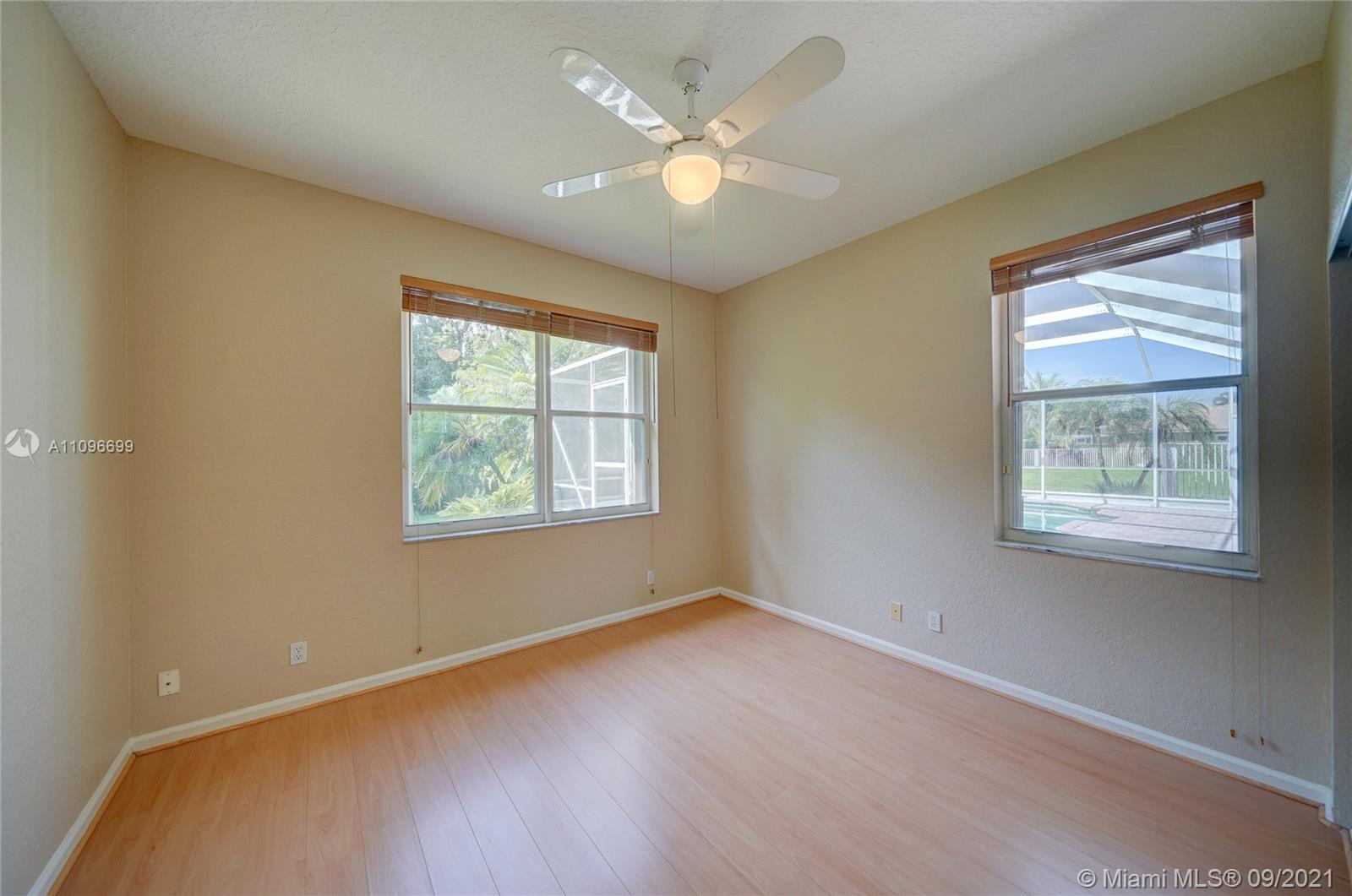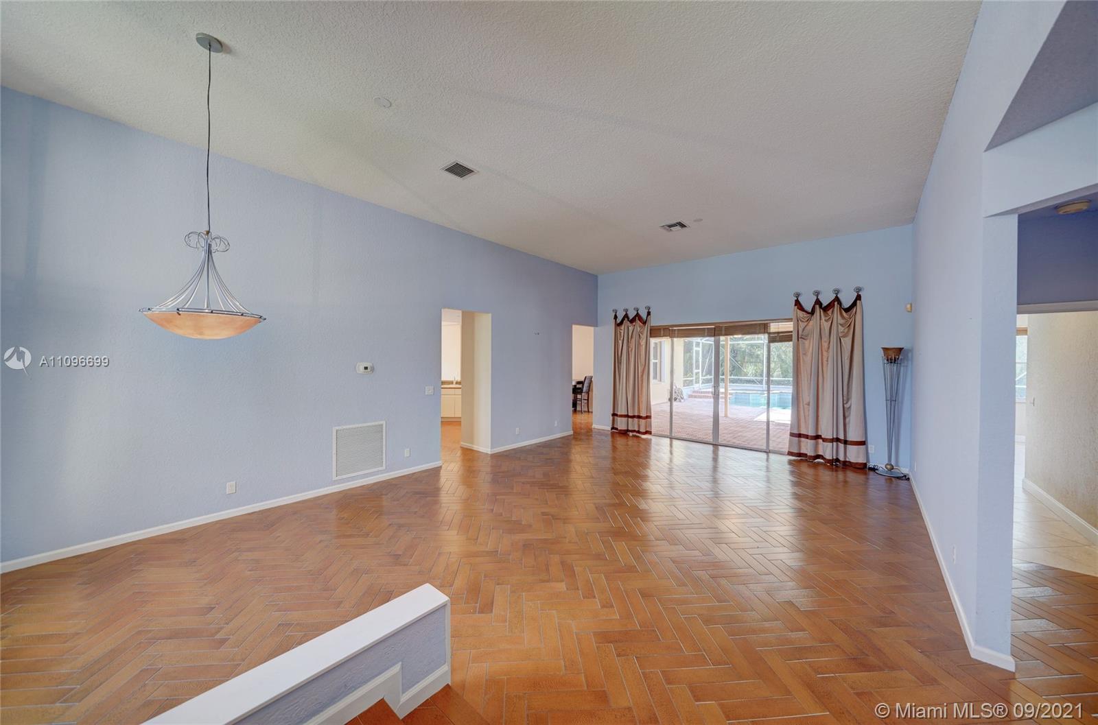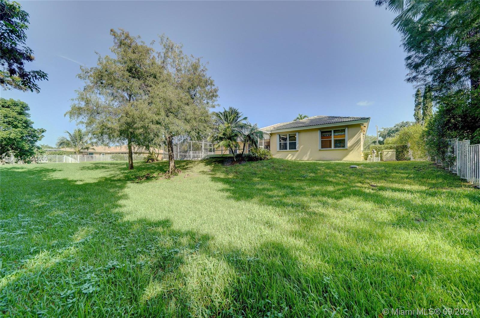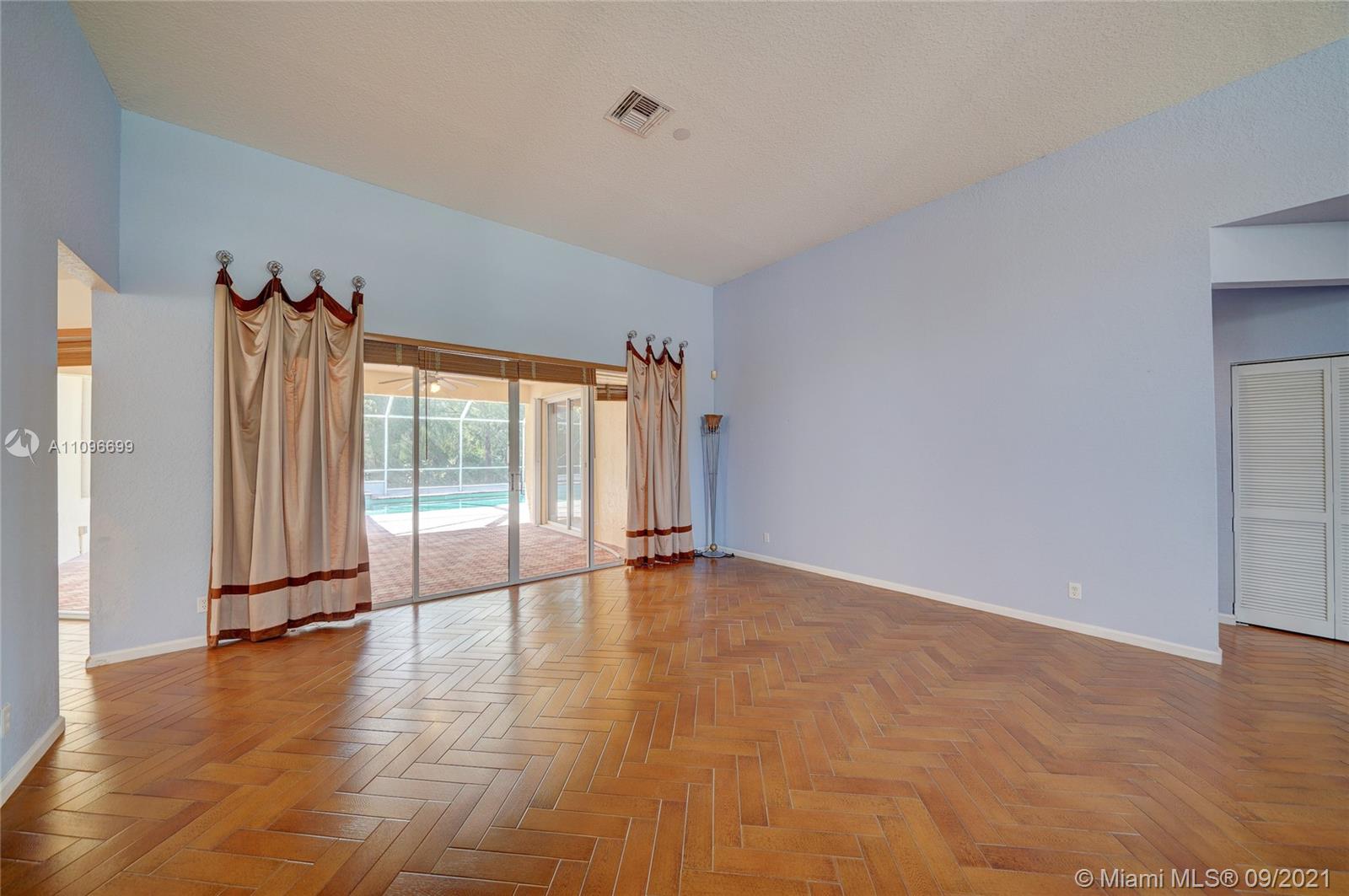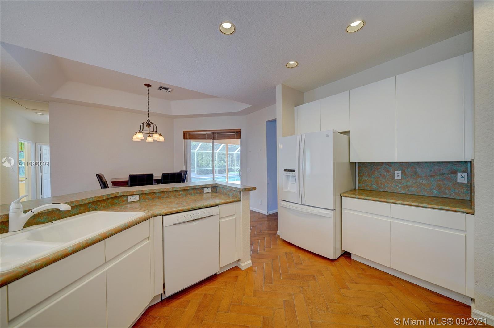 Rarely available home in the guard gated community of Country Glen. Sought after split floor plan in this 5 bedroom 3 bathroom home on over a quarter acre of land. Gorgeous neutral herringbone tile floors in all main living areas, and 5th bedroom. Soaring ceilings in the living and dining room. Oversized master suite with tile flooring, and dual closets including large walk-in. Master bath features dual sinks, and separate tub and shower. Open kitchen overlooks the spacious family room. Big secondary bedrooms with laminate flooring, and one with en-suite. Expansive covered patio overlooking the screened in pool, and canal. Accordion shutters, and plenty of amenities in the community including child playground, tennis courts and basketball.
