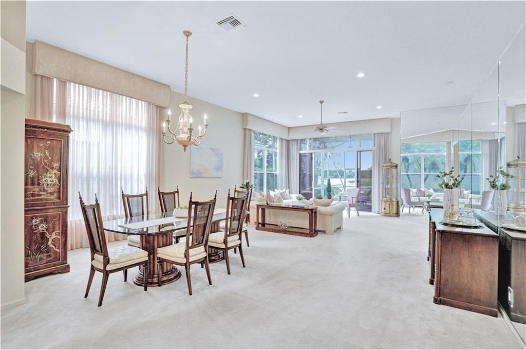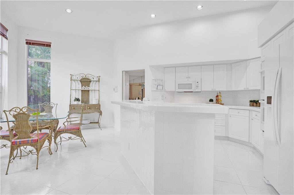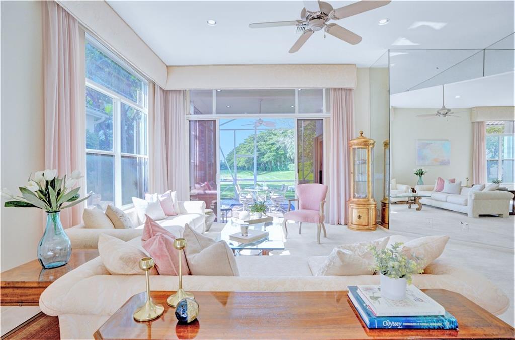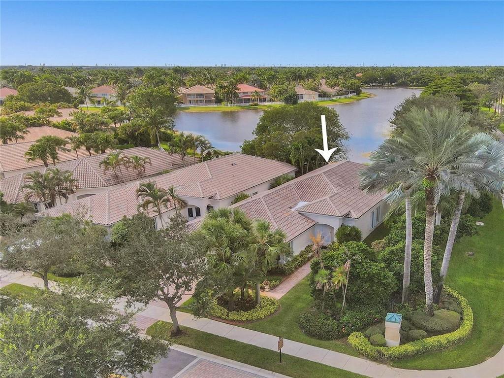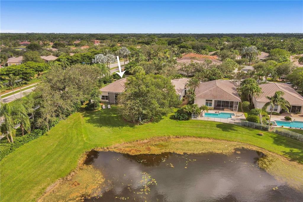 Nestled against a lush green berm on almost quarter acre with an expansive lawn that extends to the waters edge, this meticulously maintained 3/3/2CG single story LAKEFRONT home offers a maintenance-free lifestyle. Soothing shades of cream & soft pink tones exude a comfortable calm elegance. High ceilings & walls of glass create a light, bright, airy feel to the spacious great room, w/glass doors that open to the huge covered tiled patio, screened for year-round enjoyment! Huge master suite w/double walk-in custom closets & large master bath; 2nd Bed w/bathroom ensuite; 3rd Bed used as den. White-on-white kitchen w/double ovens & breakfast area. Designer chandeliers, new LED lights, accordions, plenty storage. Room for pool; golf up the road. Welcome to Weston Hills country club lifestyle!