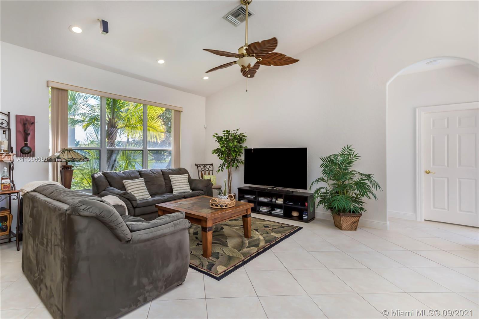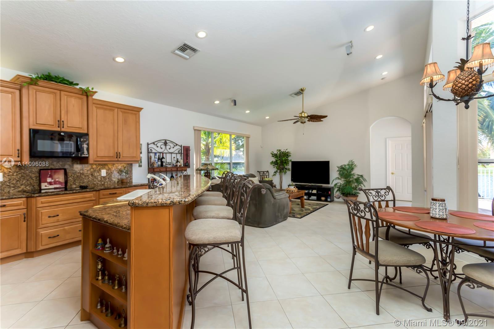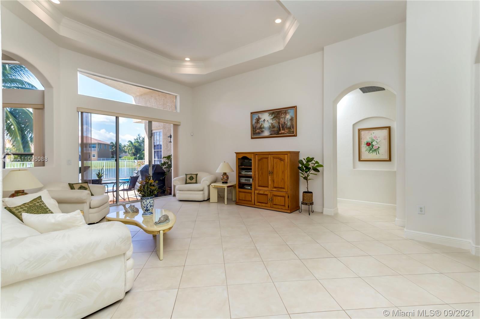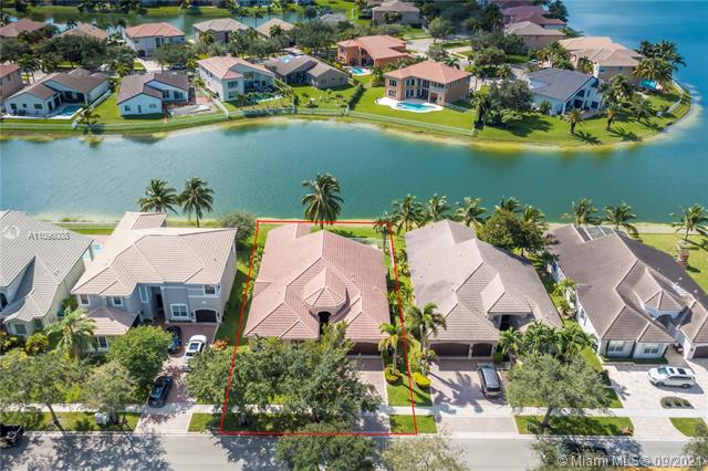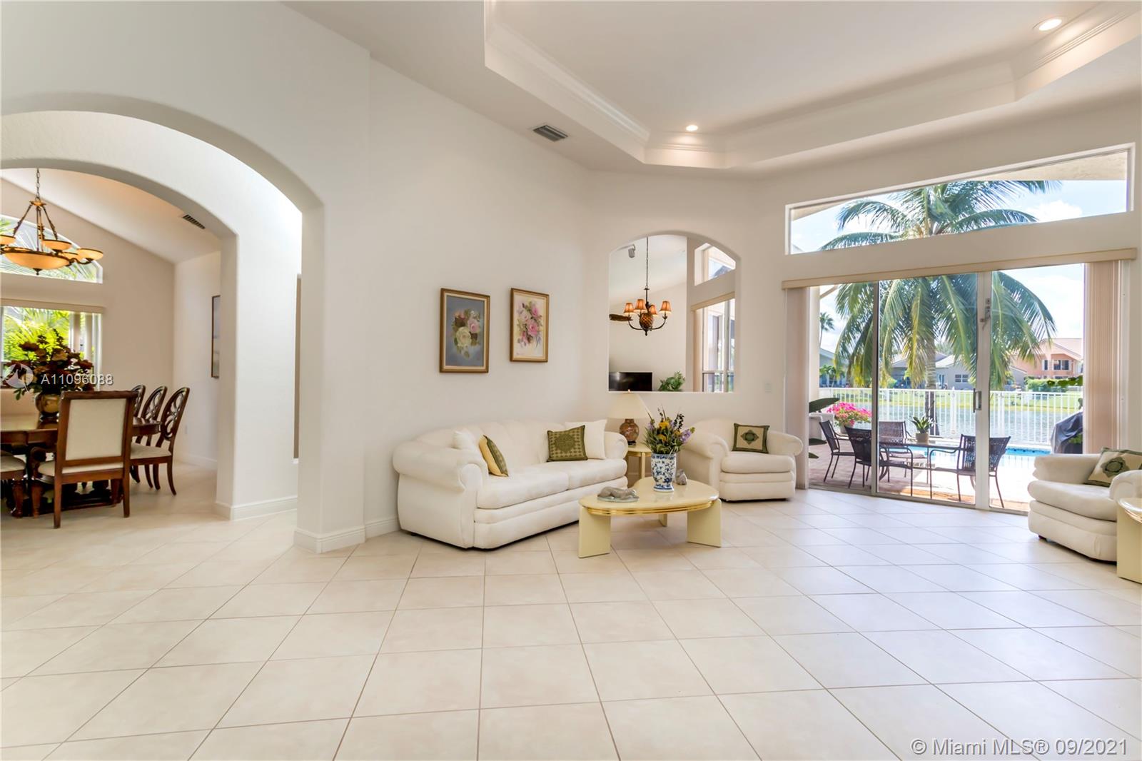 Welcome to the Sofia model, a sought after one-story home in the stunning resort community- Sunset Lakes. Upon entering, you're embraced by the sunlight shining throughout, center of the home features an elegant living room w/patio doors leading to the patio & pool area. Walking thru you'll notice dramatic coffered ceilings, inviting arched doorways w tasteful architectural accents. A warm inviting upgraded kitchen w adjacent breakfast nook are equipped w/extra storage, double oven, custom wood cabinetry, & granite counters. A true 5 bedroom w/a triple split plan, gives everyone private space to enjoy. Master suite is located on the west side of the home, w stunning pool & lake views. The custom oversized pool was recently resurface. Freshly painted exterior. This home is not one to miss!