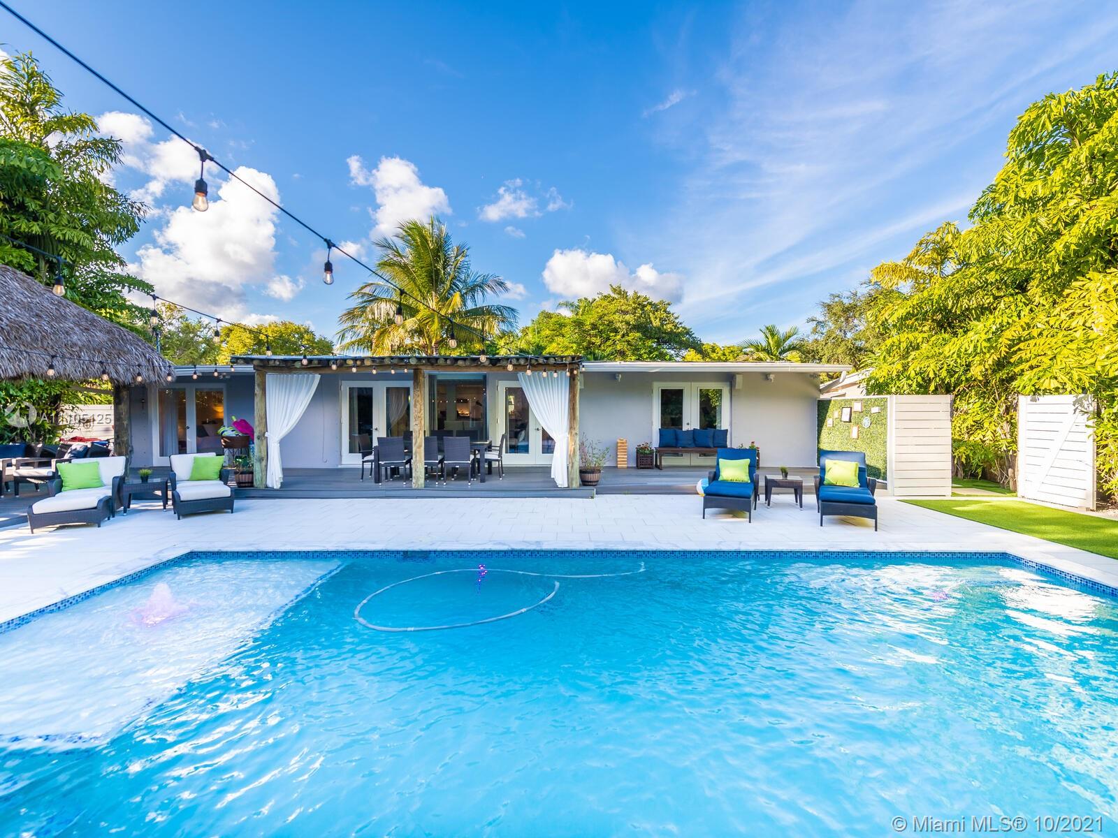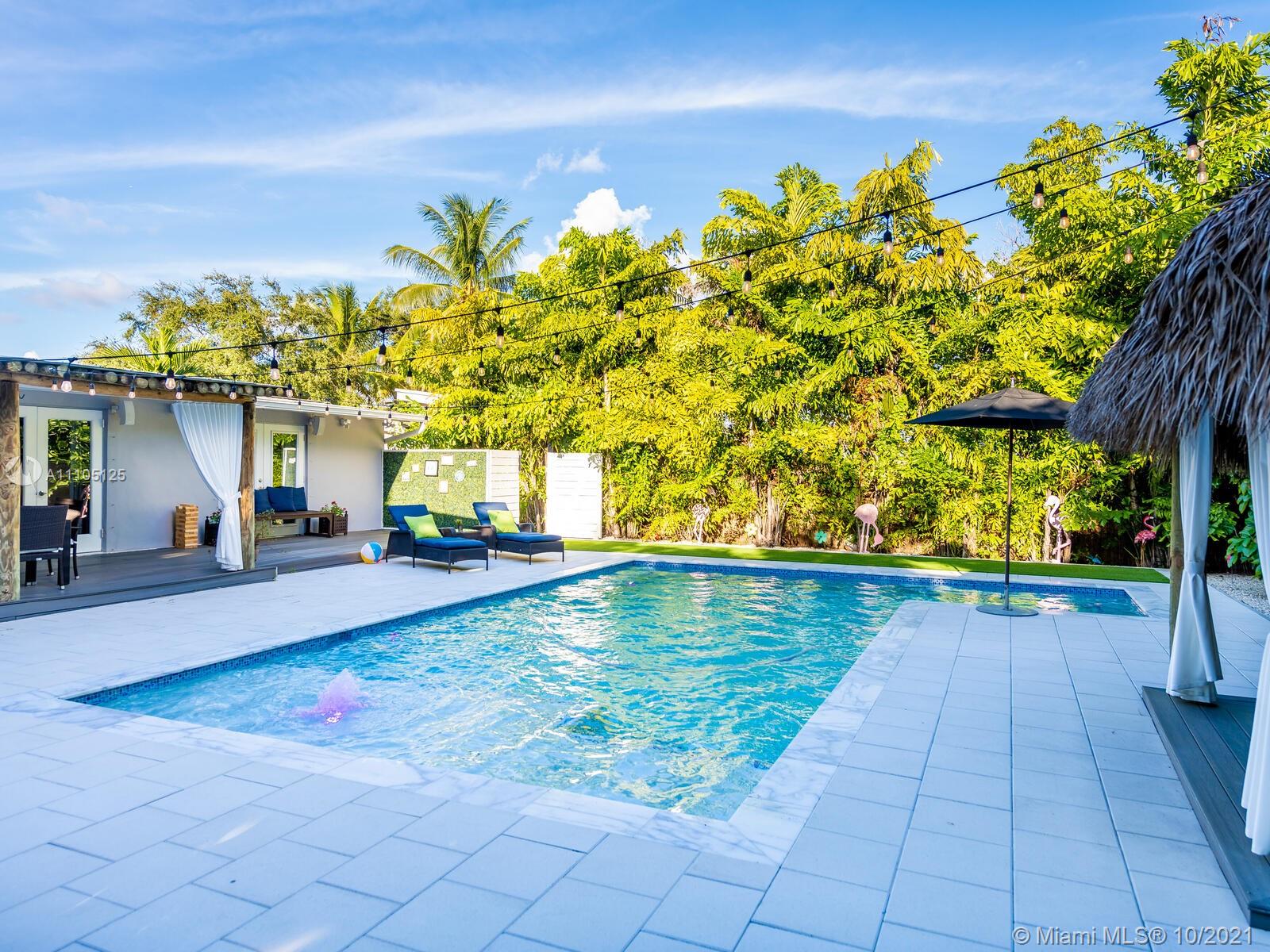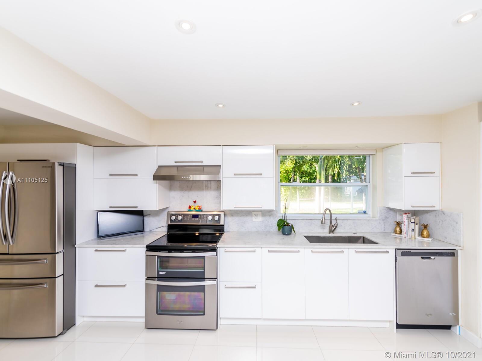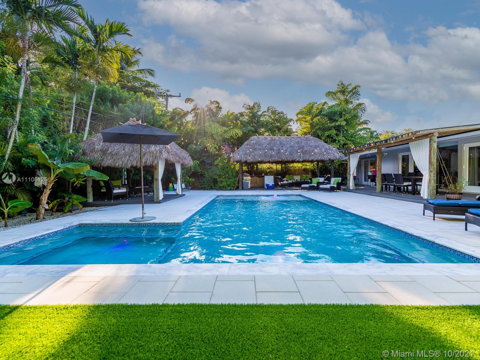 Stunning 3 bedrooms and 2 bathrooms completely remodeled with plenty of custom closets. The home boasts a large living space with plenty of natural light, white porcelain tile throughout, motorized shades, Italian style kitchen cabinets with quartz countertops. Master bedroom with sitting area to enjoy book reading or the captive view of your private oasis backyard. This is the perfect place for your staycation plans, as you can be entertained by the brand new resort style pool that can be used all year round! The pool features a gas heated system which will keep it warm. Also, enjoy the outdoor TVs and speakers , two tiki huts, BBQ , bar area and Astro turf. You can save money on insurance as the roof is 3 years old. Act now before this opportunity is missed!!!