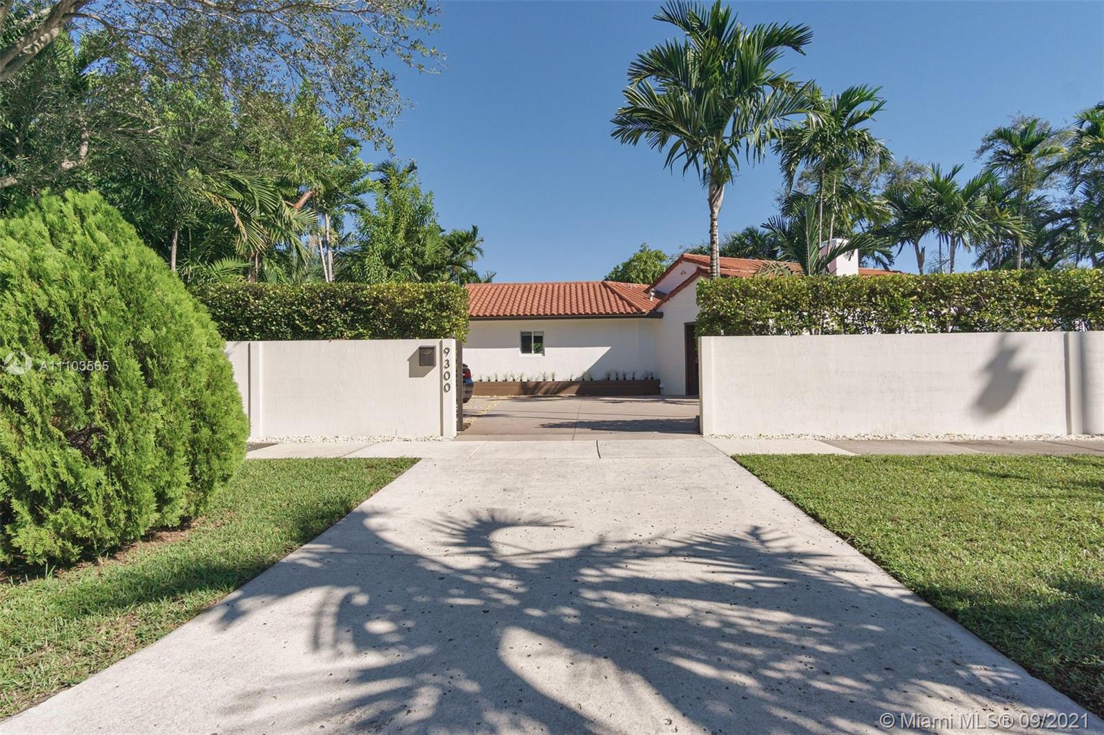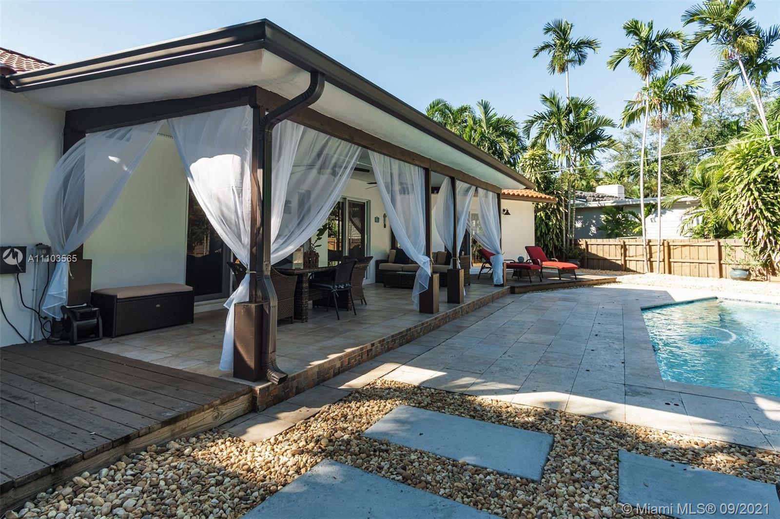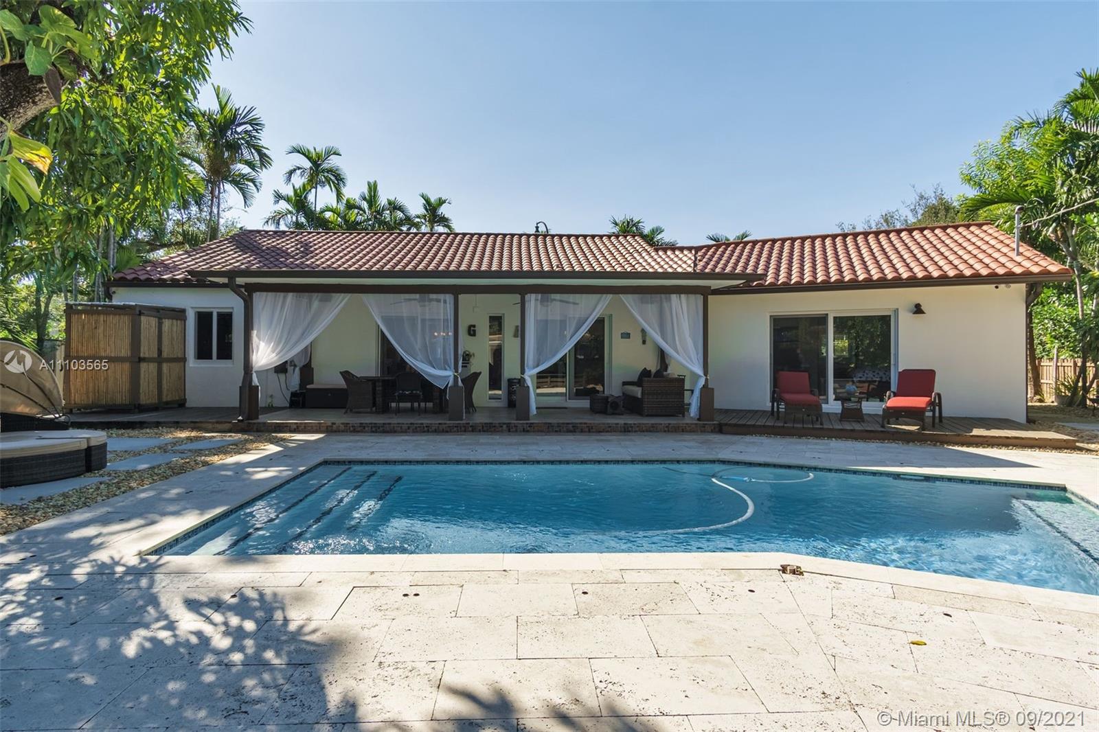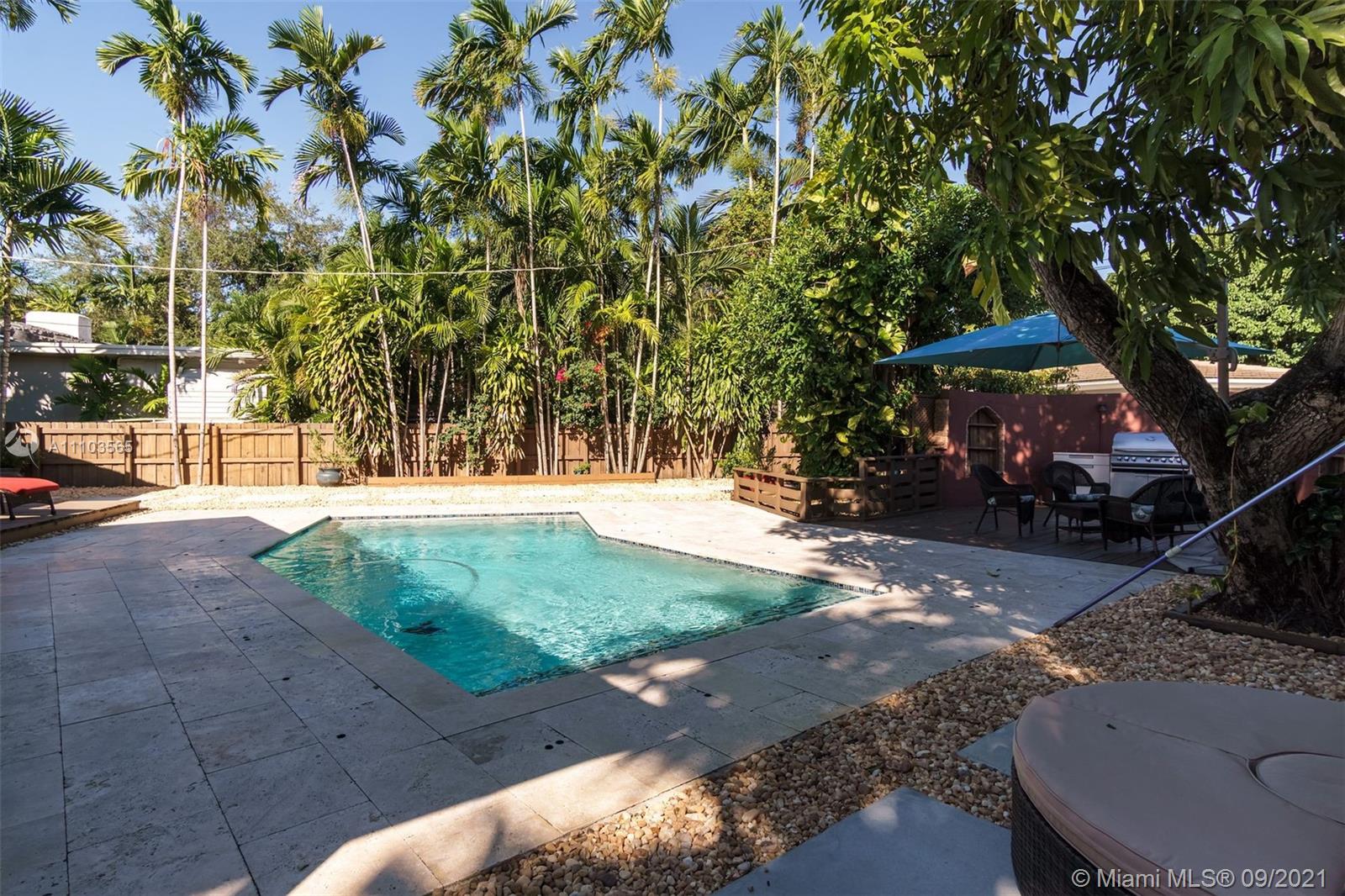 MIAMI SHORES OASIS, COMPLETELY WALLED AND FENCED.....LARGE LOT, VERY PRIVATE. BEAUTIFUL POOL AND OUTSIDE ENTERTAINING AREA, VERY TROPICAL. 3 BEDS AND 2 FULL BATHS, ATTACHED ONE CAR GARAGE. TOTALLY UPDATED, TOP TO BOTTOM. COVERED FRONT PORCH AREA, GREAT FOR RELAXING. SUPER OPEN FLOORPLAN WITH GREAT VIEWS OF THE GARDEN AND POOL AREA. ORIGINAL WOOD-BURNING FIREPLACE IN THE LIVING ROOM. BIG UPDATED AND OPEN KITCHEN WITH EATING BAR AND ROOM FOR STOOLS. GREAT BEDROOM SPLIT. MASTER BEDROOM IS GIGANTIC WITH TWO WALK-IN CLOSETS AND A SPA-LIKE BATH. MASTER BEDROOM HAS ACCESS TO THE POOL. NEWER ROOF, PLUMBING, AND ELECTRIC, A/C. IMPACT WINDOWS, SECURITY SYSTEM, IRRIGATION SYSTEM. VERY CONVENIENT LOCATION, SUPER CLOSE TO EVERYTHING.