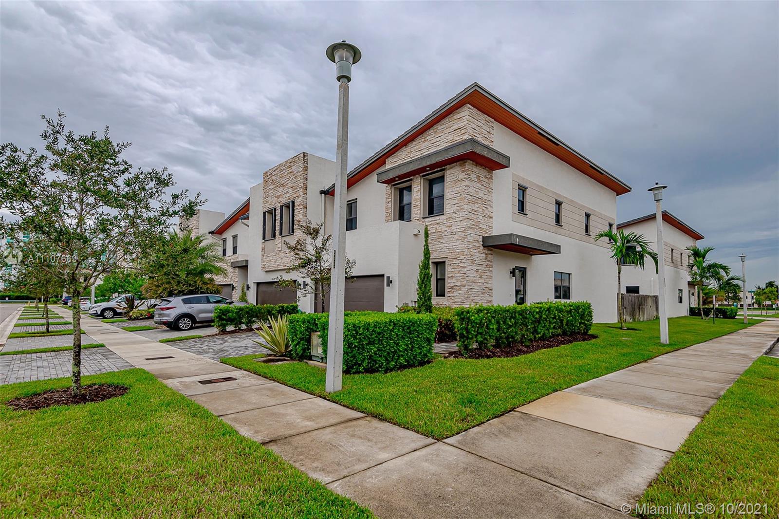 Beautiful and Modern CORNER lot townhome in prestigious community in Doral. Features include, stainless steel appliances, ice maker refrigerator, dishwasher, disposal, large pantry, storage room, carpet only in bedrooms, the rest of the space is tiled, 2 car garage, Impact windows/doors, plus fenced in the back yard. Luxury Clubhouse includes a resort-like pool with a child play area and a fitness room with showers, sauna truly the biggest Clubhouse in the area. The unit is close to shopping centers, restaurants with easy access to expressways.