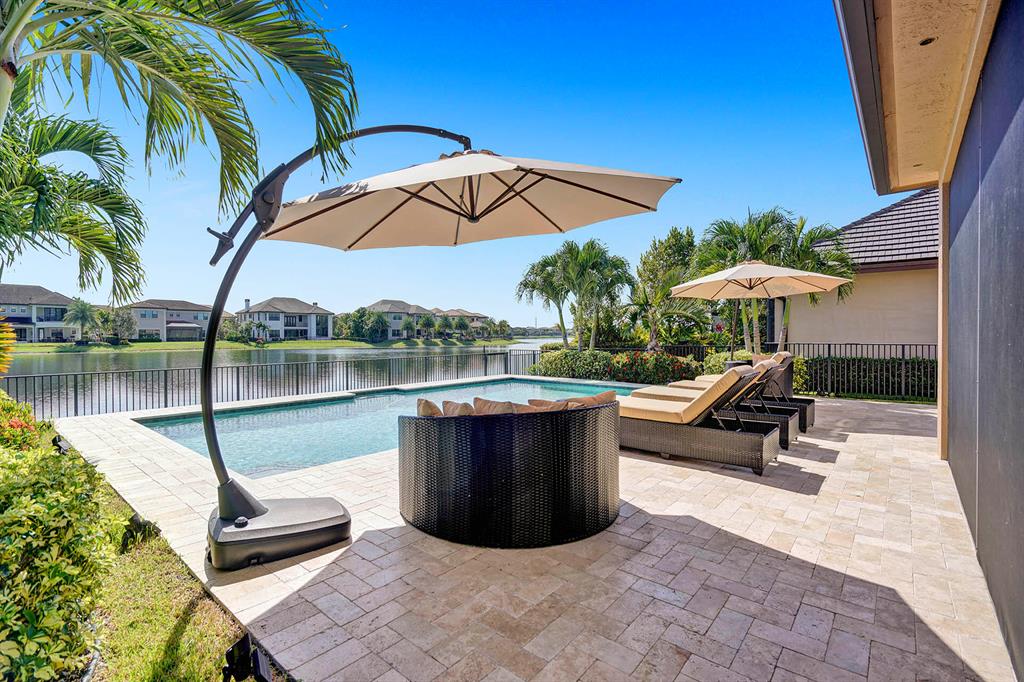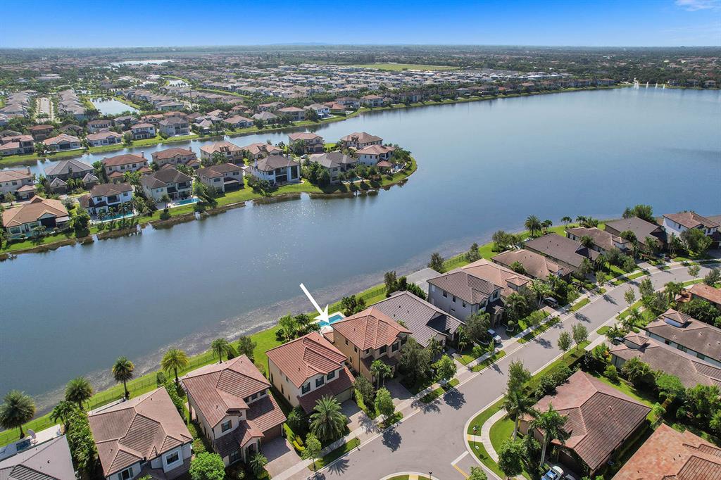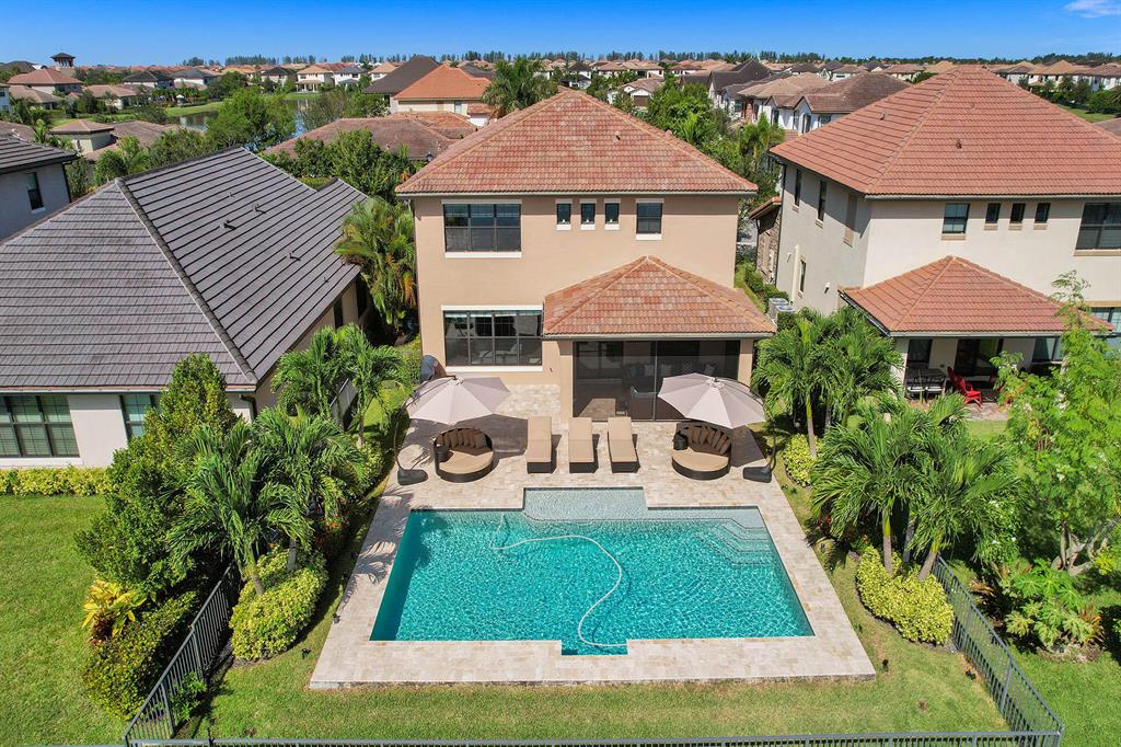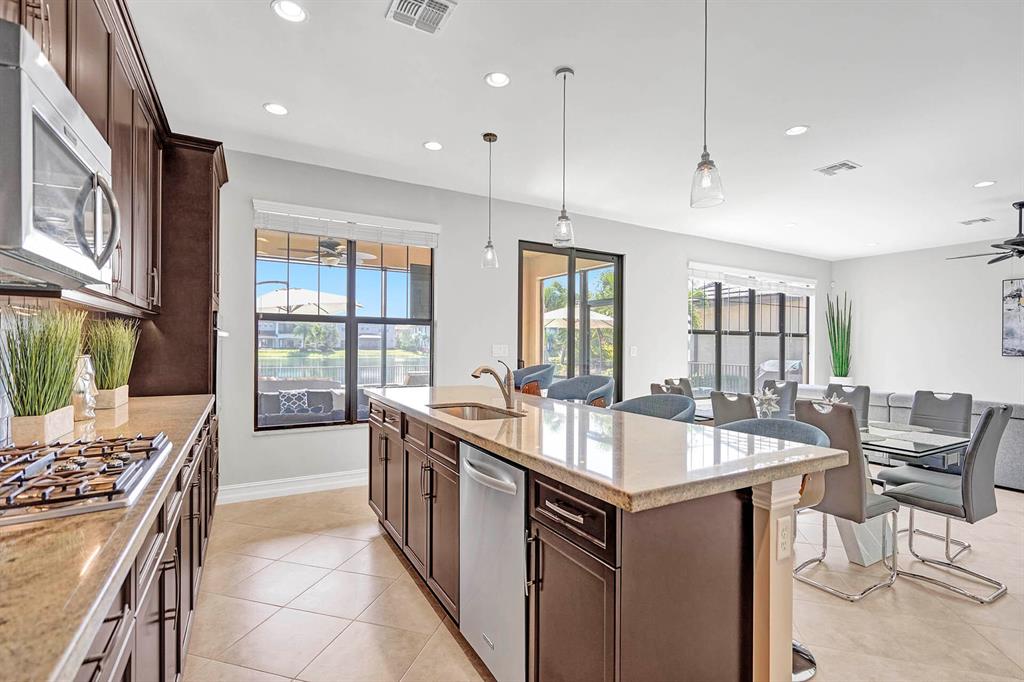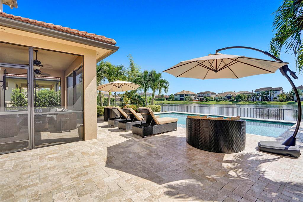 Popular lakeview Somerset model offering 5 beds & 3 baths. in 2,988 SF/AC. Bask in the 20,000 gallon gas heated & East facing salt filtrated & lighted pool, Luxurious travertine pavers & lush illuminated tropical landscaping adds to ever present warm tropical breezes. All can be enjoyed from the under roof screened patio as well. An open concept kitchen & great room offers soaring 10 FT ceilings, rich mahogany cabinets, stainless KitchenAid appliances, natural gas cooktop/range. Granite counters & grand island for casual dining & entertaining. Main level features full tile flooring & bedroom/office. Level 2 offers 3 bedrooms plus a grand owner suite w/tray ceilings, luxurious bath & fabulous lake/pool view. Security camera system, alarm & full impact windows for owner comfort.