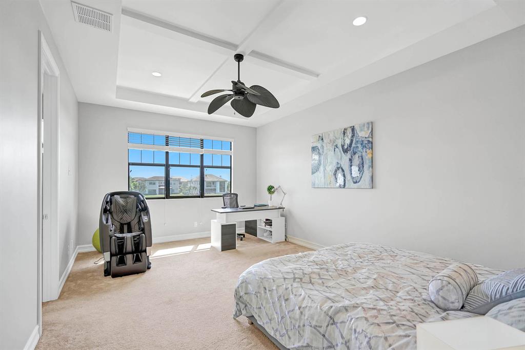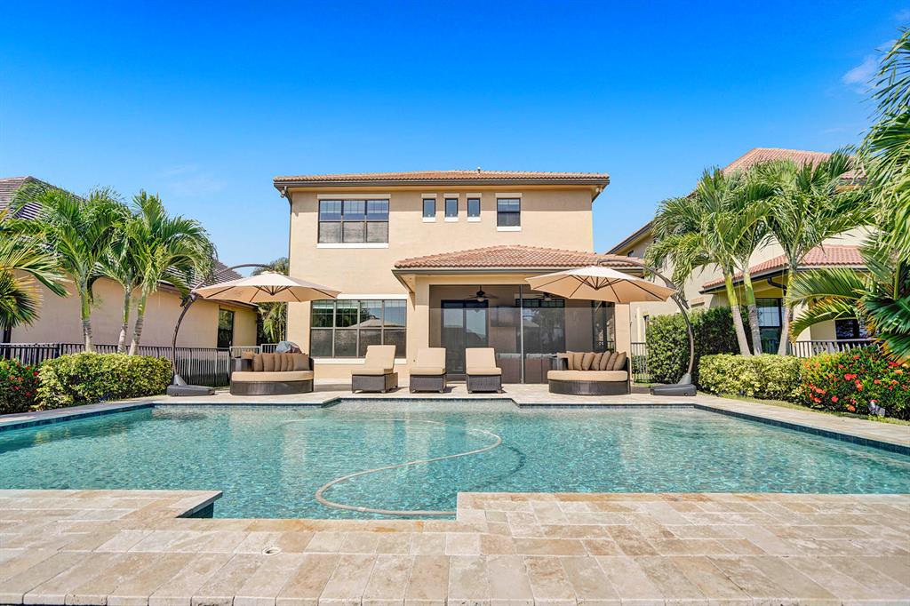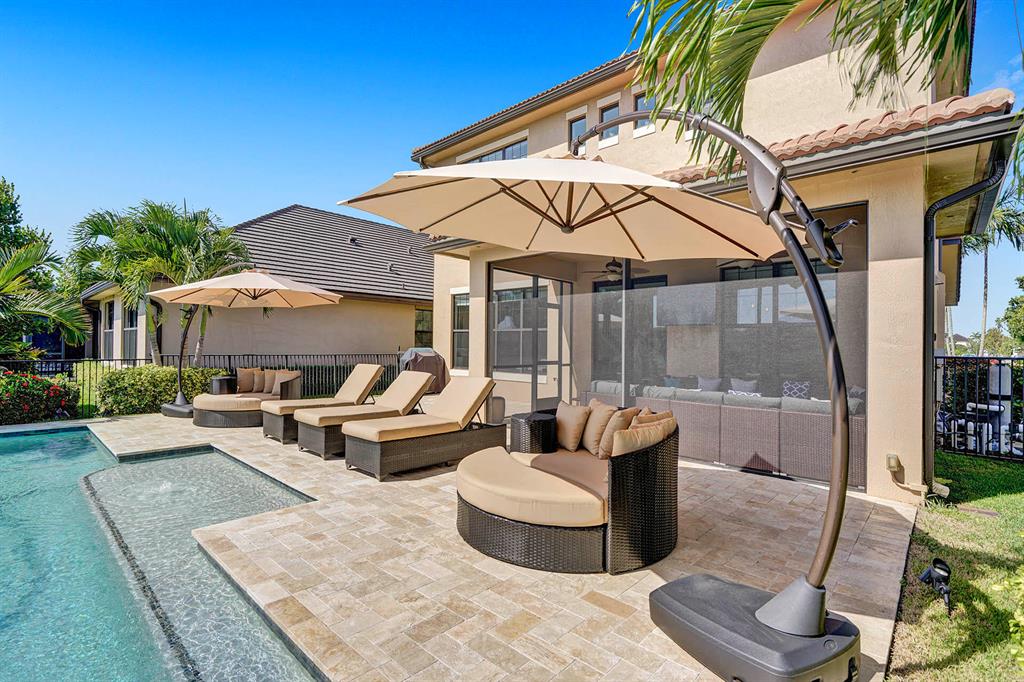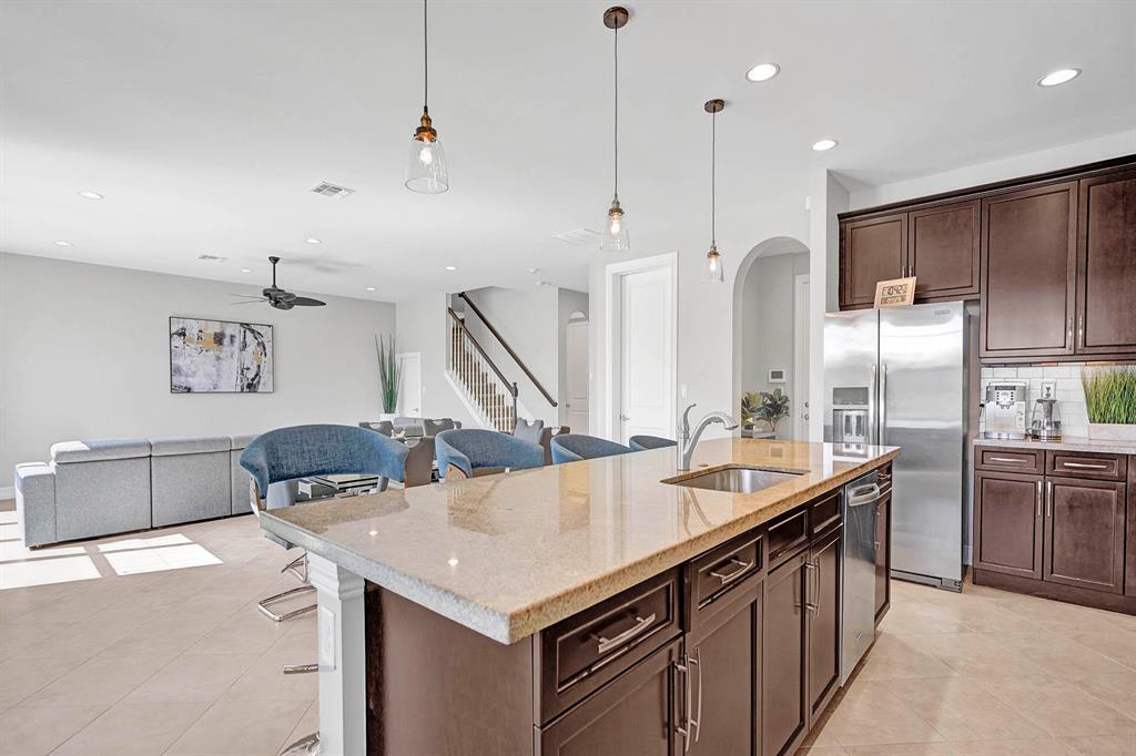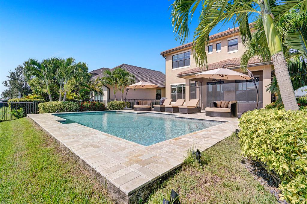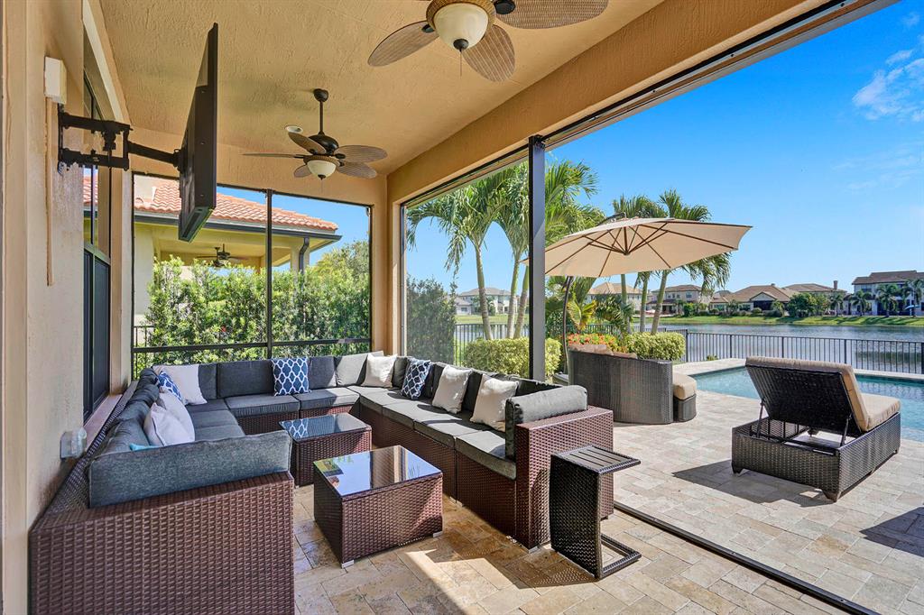 Popular lakeview Somerset model offering 5 beds & 3 baths. in 2,988 SF/AC. Bask in the 20,000 gallon gas heated & East facing salt filtrated & lighted pool, Luxurious travertine pavers & lush illuminated tropical landscaping adds to ever present warm tropical breezes. All can be enjoyed from the under roof screened patio as well. An open concept kitchen & great room offers soaring 10 FT ceilings, rich mahogany cabinets, stainless KitchenAid appliances, natural gas cooktop/range. Granite counters & grand island for casual dining & entertaining. Main level features full tile flooring & bedroom/office. Level 2 offers 3 bedrooms plus a grand owner suite w/tray ceilings, luxurious bath & fabulous lake/pool view. Security camera system, alarm & full impact windows for owner comfort.