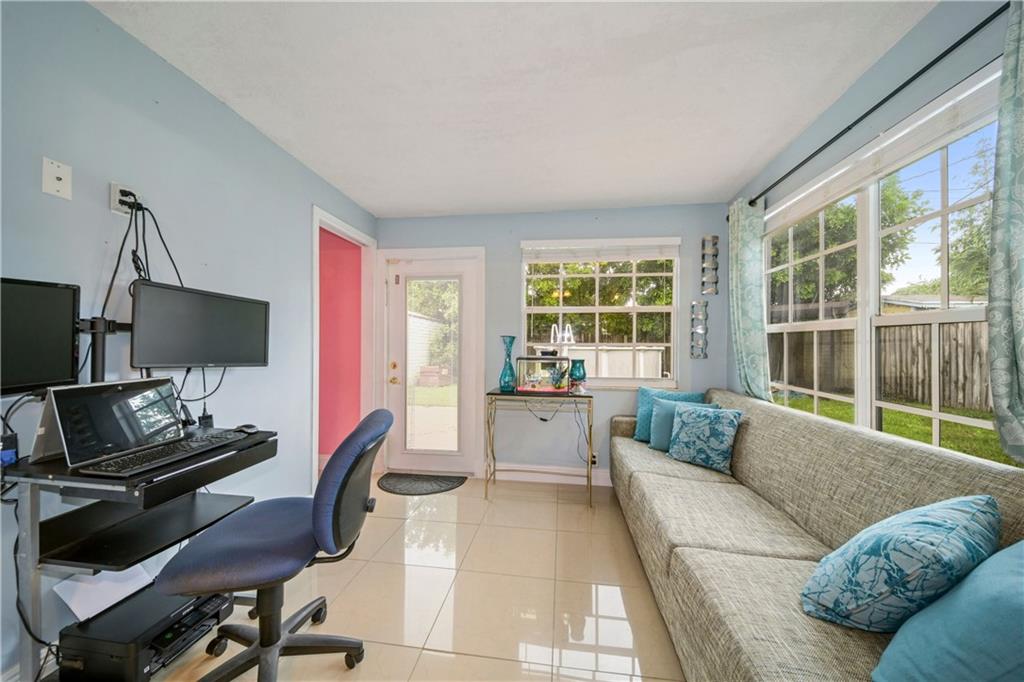 Beautifully updated home with pool in a quiet and family-oriented neighborhood. Renovated bathroom, porcelain floors, and new kitchen with stainless steel, high-end, Samsung appliances. Tankless water heater for great energy savings and a large and completely fenced-in backyard with a amazing above ground pool and legal outdoor shed. New pump and fully-functioning sprinkler system. Florida room was partly used as a third bedroom.