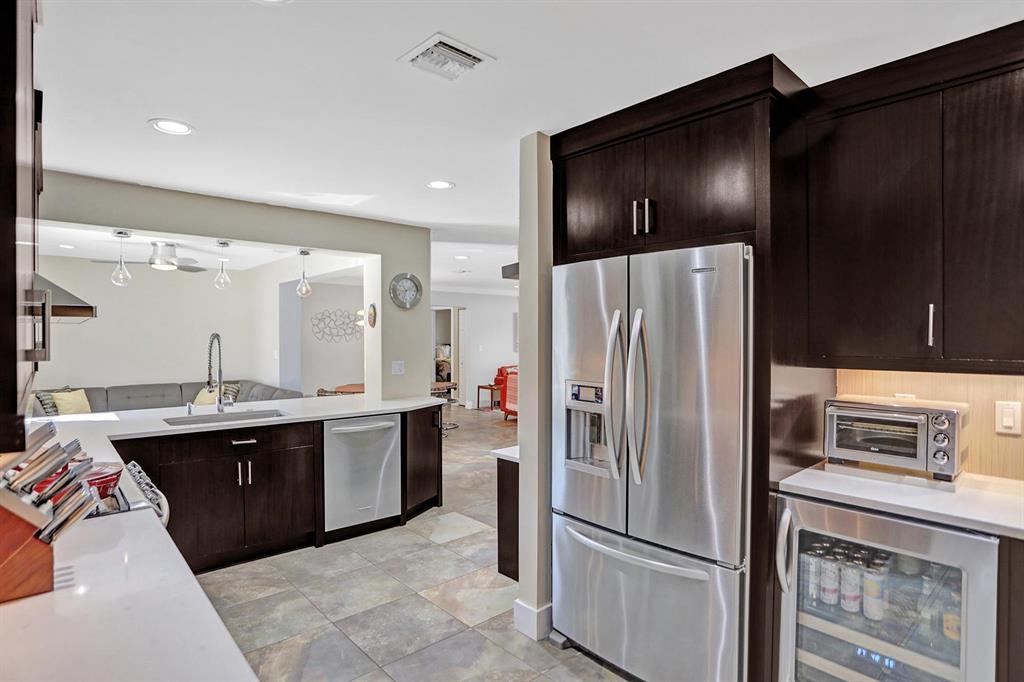 Your vacation awaits at this historic Hollywood Lakes neighborhood. Home was fully rebuilt in 2011 with updated plumbing and electrical meeting current building code standards. Features noted on separate document. This open 1890 sq. ft. open concept home has Mid Century charm with modern new construction amenities and design. Enjoy the tranquil, resort style backyard, travertine patio and large salt water pool. Dream kitchen for cooks and entertaining with gorgeous wood veneer cabinets providing plenty of storage. Countertops and bar of durable Caesarstone. Modern stainless steel appliances including gas range, wine fridge. Under cabinet lighting and tiled backsplash.Spacious layout boasts 3 bedrooms including an office/den bonus space, and built-closets. 2 large custom baths