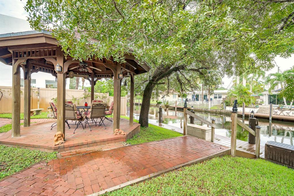 This charming and meticulously maintained 3/2 home is on a deep water ocean access canal with no fixed bridges. This property has the ideal backyard exposure facing east. Keep your boat parked in your backyard on a new 45 foot Trex composite dock with electric that can hold up to a 60 foot boat. Enjoy your breakfast or evenings underneath the Gazebo overlooking the water or sit in your roofed screened patio or even take a dip in the spa. This stunning property offers an open floor plan with cathedral beamed ceilings, wood burning brick fireplace; upgraded kitchen with solid cherry wood cabinets with maple interior shelving and granite counter tops. The master bathroom has an upgraded walk in shower with beautiful Italian porcelain tile, double shower fixtures on each end and a custom bench