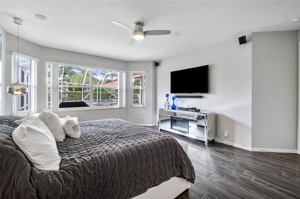Perfection! Impeccable updates & upgrades have created a sophisticated & HGTV worthy home. Light & airy interior showcases a chic glass & metal staircase/soaring 2 story ceilings & expansive impact windows & glass doors. The large Kitchen/Family Room area is sublime & offers a crisp white kitchen/island/soft close cabinetry/stunning counters/top of the line SS appliances/sub-zero beverage station with refrigerated drawers. Spacious Master Suite with spa-like bathroom & gorgeous porcelain wood-like floors. Upstairs is a huge media/entertainment area with a bar. The seamless free-flowing design lends for indoor/outdoor enjoyment. The renovated pool area offers a heated saltwater pool/spa & travertine pavers. Jaw-dropping light fixtures/wood-like vinyl floors add to the home's splendor.