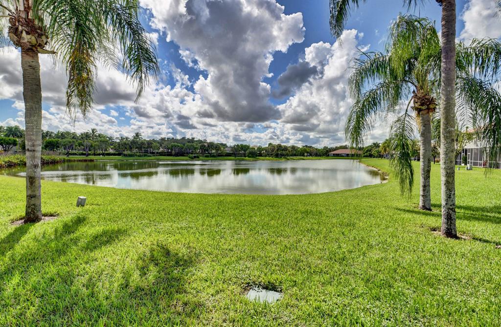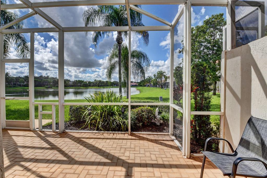 Beautiful lake views from this fabulous townhouse in Mizner Pointe. Tiled throughout the first floor with pass through in kitchen to dining area, screened in patio to enjoy the beautiful sunsets.Kitchen has stainless appliances, crown molding, custom blinds and mounted TV and recessed lighting. Double door entry into Large master suite with custom closets and sitting area. Master bath has separate tub and shower and double sinks. Speakers throughout the home.Upgraded landscaping, Accordion shutters and Decorative double driveway. Mizner pointe has recently renovated club house, tennis, play area, fitness center, resort size pool, billiards, and man gated. lawn service , basic cable and alarm included in HOA fee along with painting outside.
