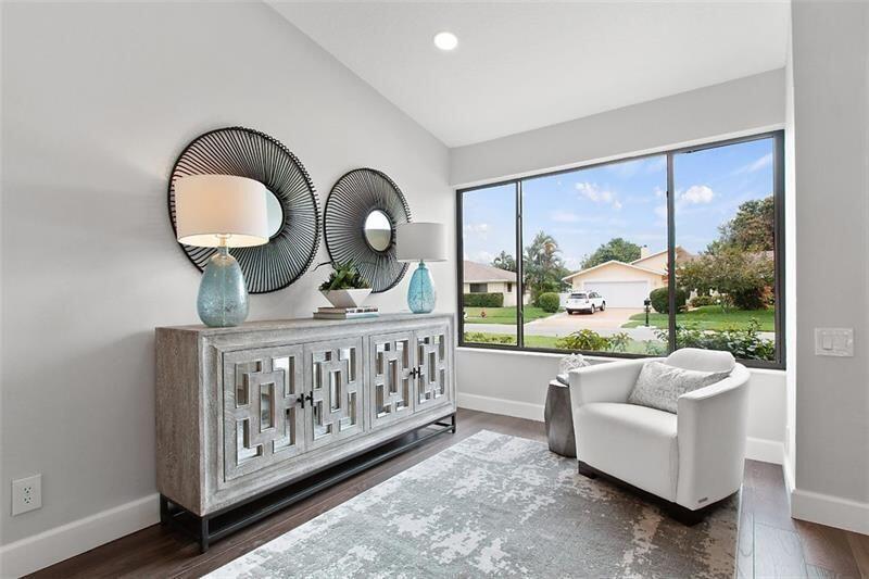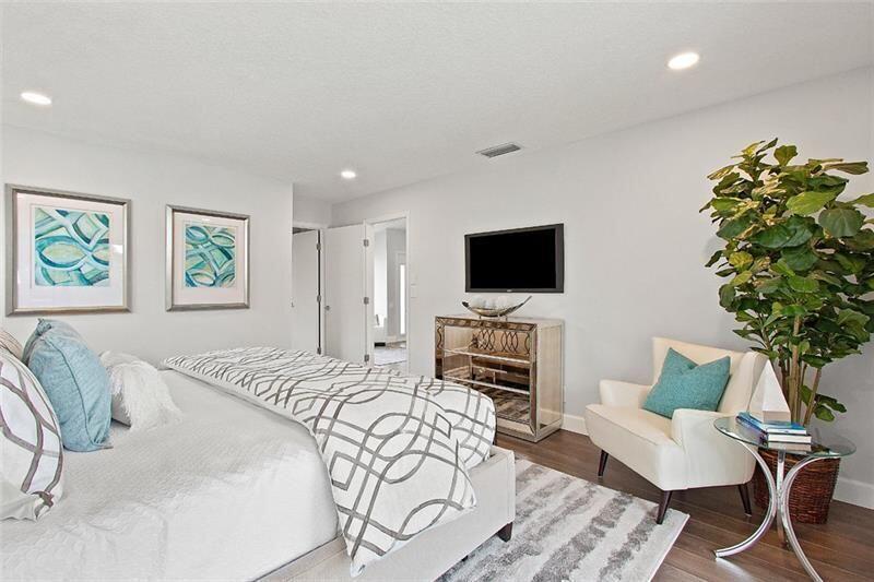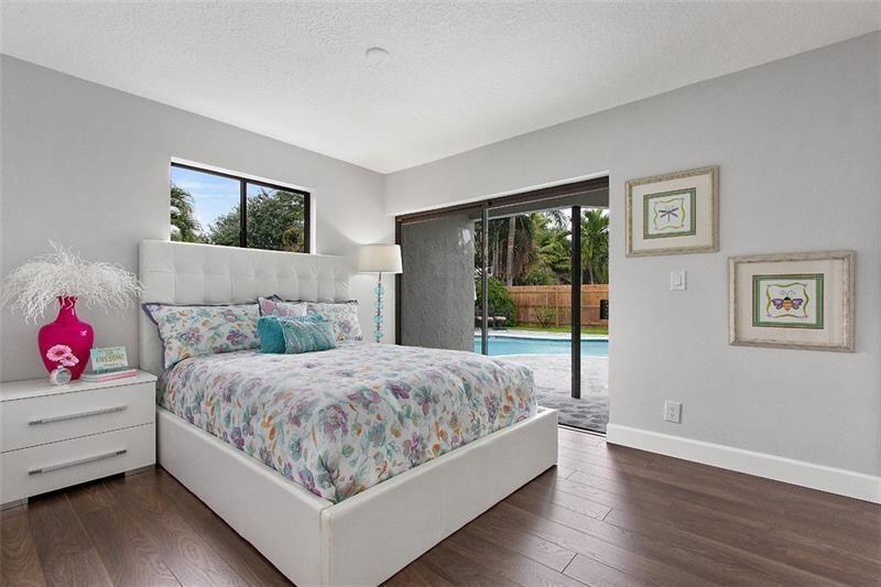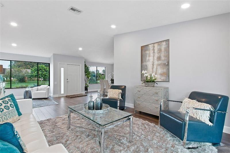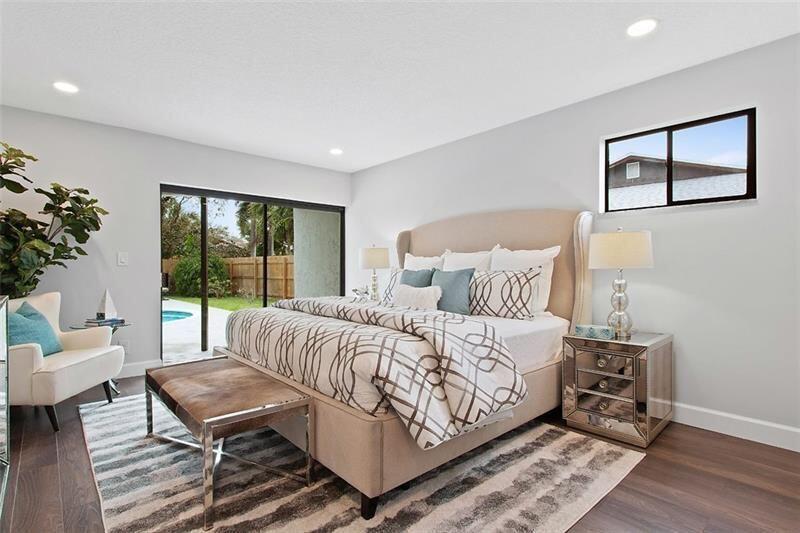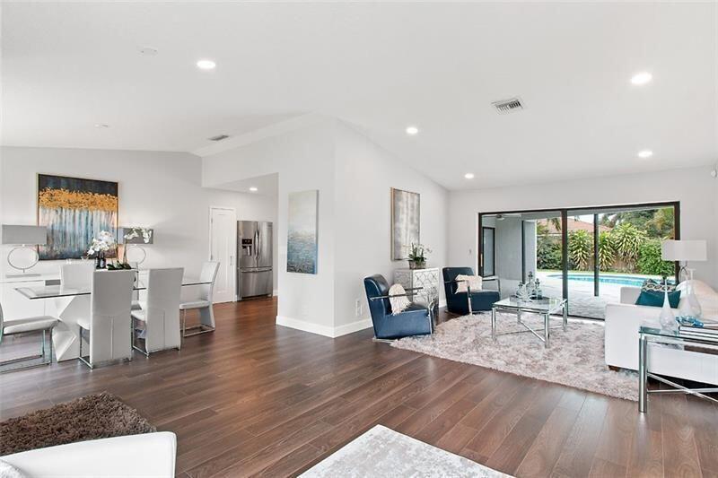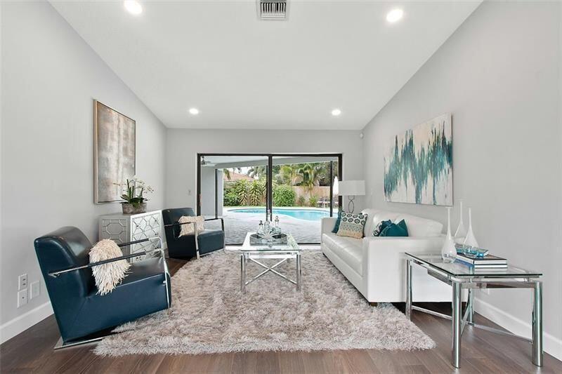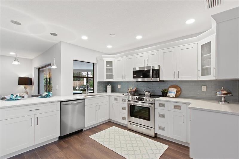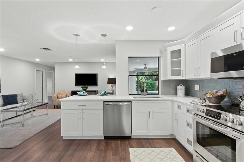 Coastal contemporary renovation. Shaker white cabinetry and satin chrome hardware kitchen. Stainless refrigerator, stove, dishwasher, new garbage disposal, and sink with 3 cm white quartz counter top, extended peninsula bar, and back patio pass through. Flooring (AC-5 laminate) and dimmable studio lighting throughout. Newer Bathrooms have inviting coastal tile, sea glass topped vanities, chrome fixtures & hardware, infinity walk-in shower with frame-less glass showers doors. Views from the master bedroom, living & family room, kitchen, and third bedroom to the pool area afford bright light throughout the home. Large fenced yard, two attached sheds, nice yard surrounding the over-sized pool. New roof in 2020. AC 5 ton unit in 2019, Electric car charging outlet (220v/50amp) in the garage.
