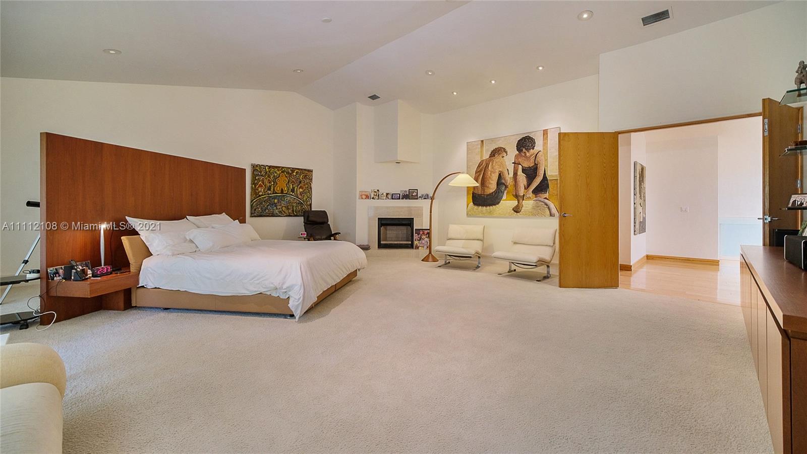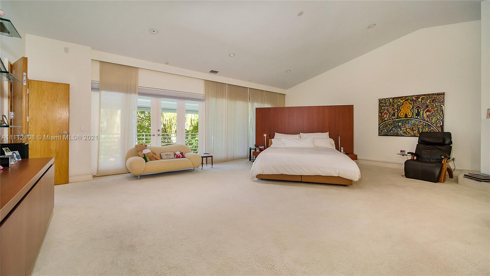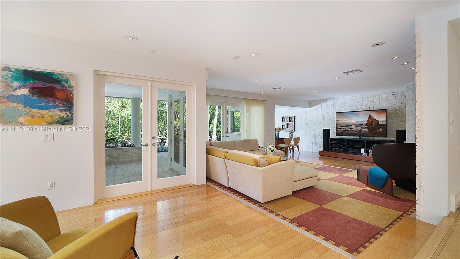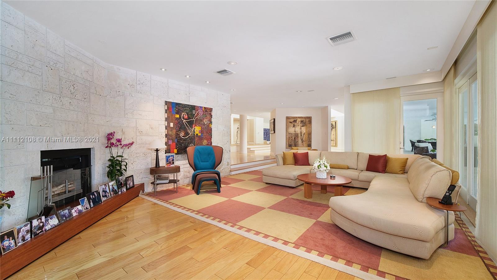 Gables Estates Fabulous Miami Modern waterfront home boasts grandly scaled Dbl-height interiors and cascading natural light. Level 1 includes oversized living, dining, family w/fireplace, wet bar & pool views, library/office, home theater, eat-in kitchen appointed w/Sub-Zero, Wolf & Miele + pantry & breakfast rm; 3-bdrm suite for staff or teens; plus cabana bath, laundry & attached garage. Level 2: Enormous primary suite w/sumptuous bath & huge walk-ins; 4 unique en suite bdrms designed w/private lofts. Light hardwood flows thruout. Huge gym +bonus space. Wonderful covered outdoor living area & BBQ frames huge tiered patio & pool laid in native oolitic limestone. 16-ft elevation; lush tropical landscape, 180 waterfront ft, 66-ft dock, minutes to open bay.