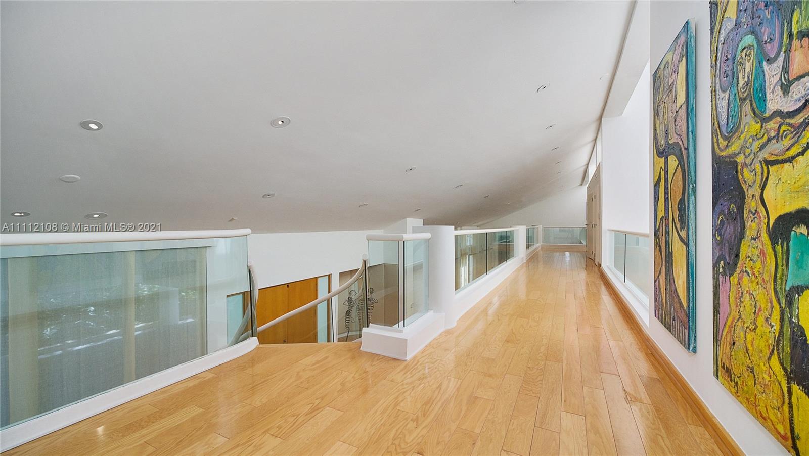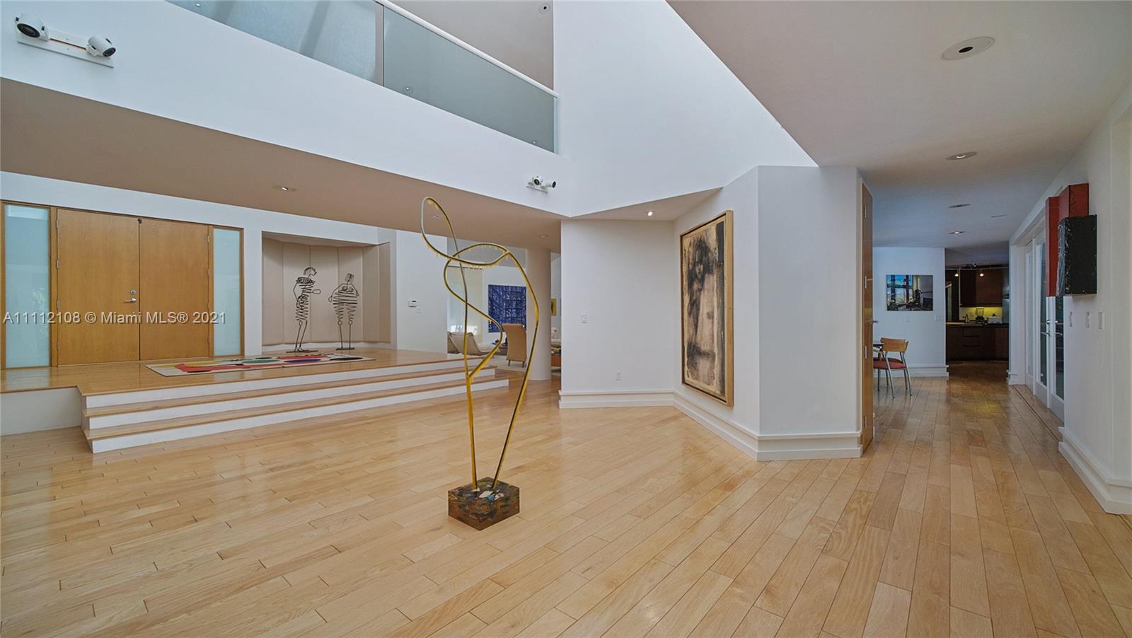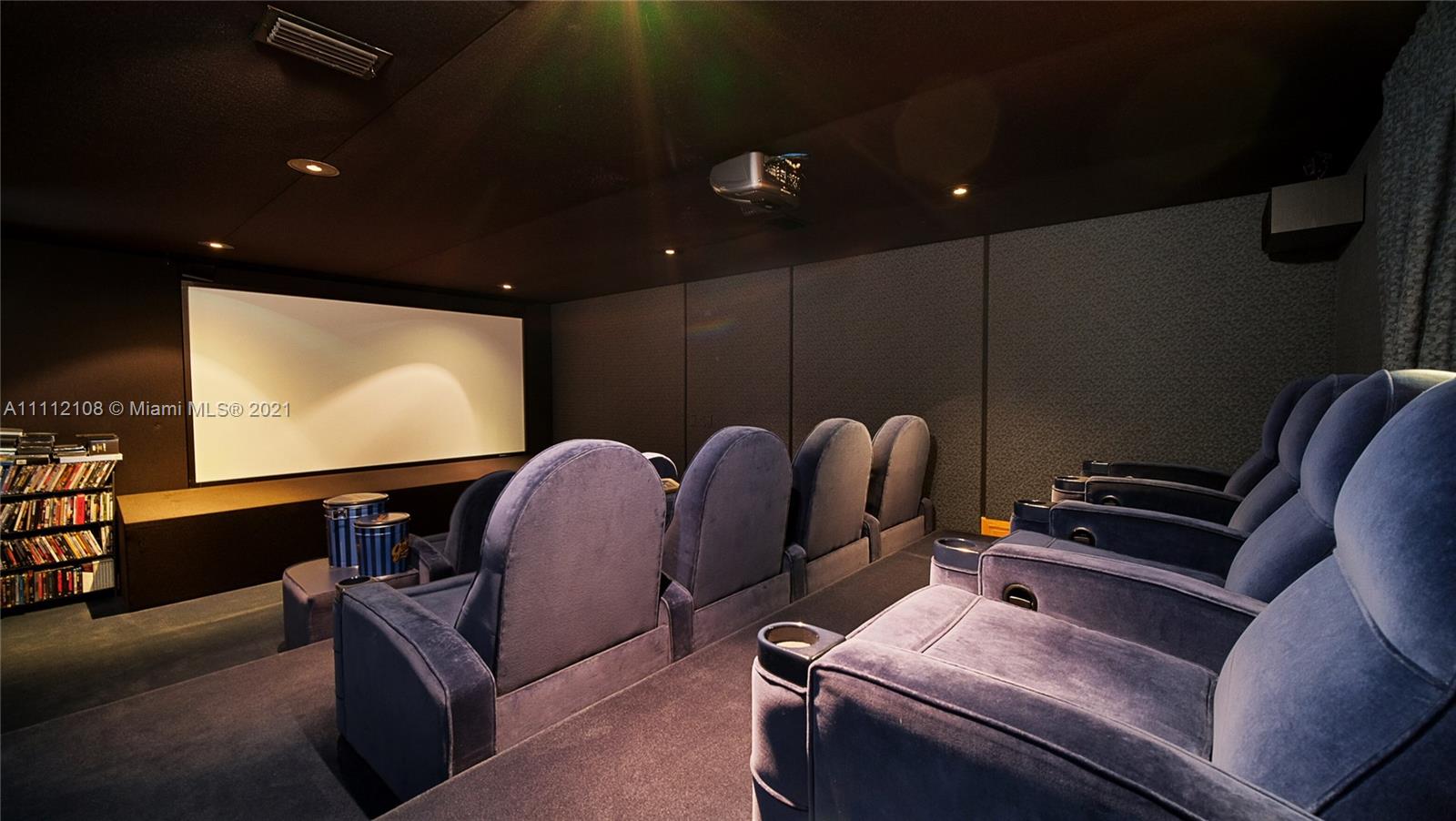 Gables Estates Fabulous Miami Modern waterfront home boasts grandly scaled Dbl-height interiors and cascading natural light. Level 1 includes oversized living, dining, family w/fireplace, wet bar & pool views, library/office, home theater, eat-in kitchen appointed w/Sub-Zero, Wolf & Miele + pantry & breakfast rm; 3-bdrm suite for staff or teens; plus cabana bath, laundry & attached garage. Level 2: Enormous primary suite w/sumptuous bath & huge walk-ins; 4 unique en suite bdrms designed w/private lofts. Light hardwood flows thruout. Huge gym +bonus space. Wonderful covered outdoor living area & BBQ frames huge tiered patio & pool laid in native oolitic limestone. 16-ft elevation; lush tropical landscape, 180 waterfront ft, 66-ft dock, minutes to open bay.