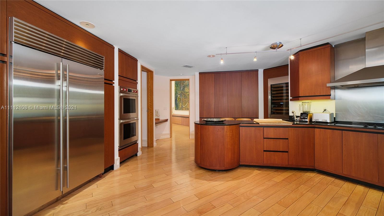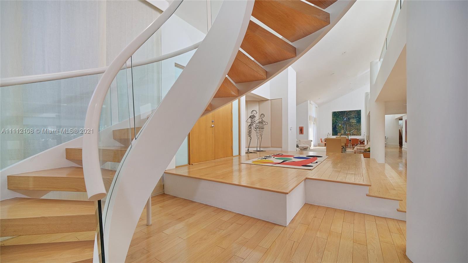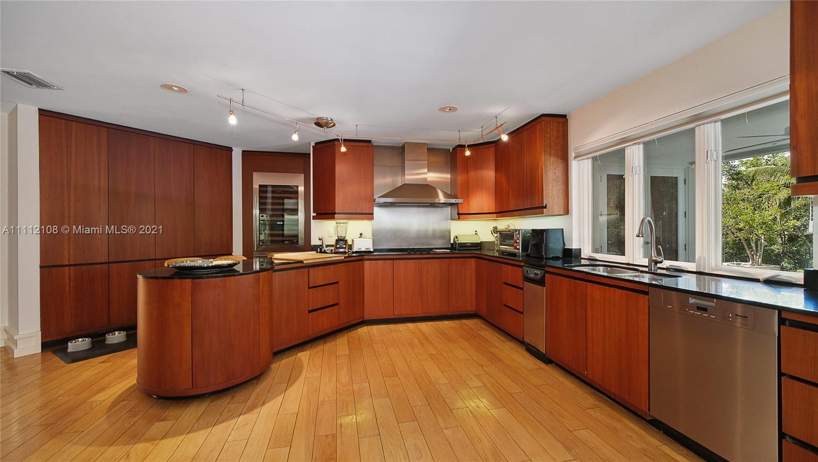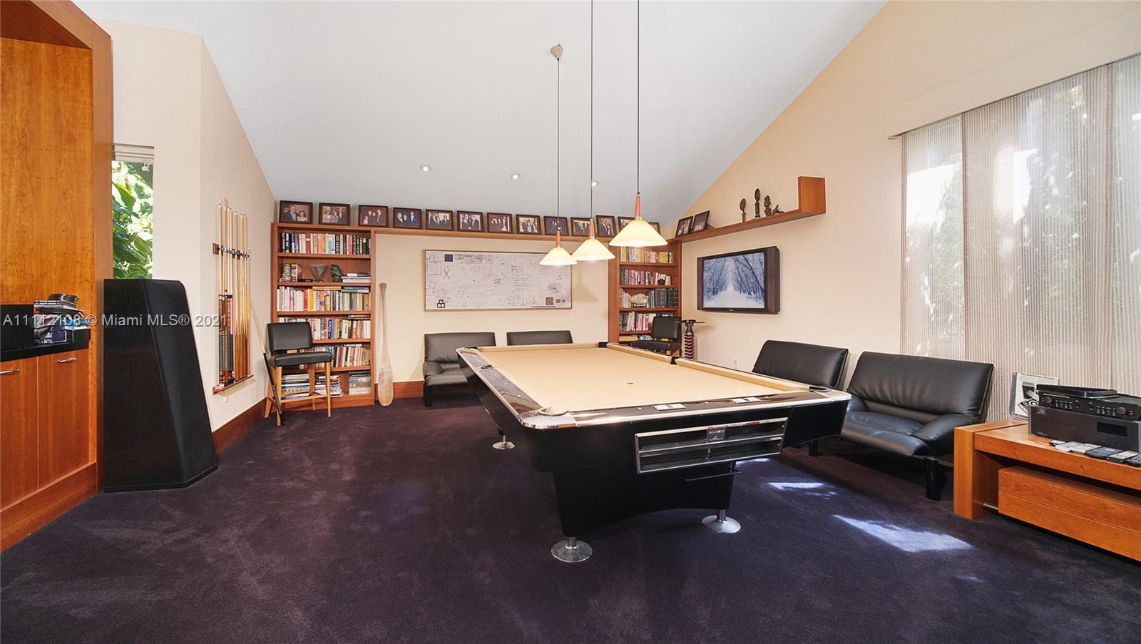 Gables Estates Fabulous Miami Modern waterfront home boasts grandly scaled Dbl-height interiors and cascading natural light. Level 1 includes oversized living, dining, family w/fireplace, wet bar & pool views, library/office, home theater, eat-in kitchen appointed w/Sub-Zero, Wolf & Miele + pantry & breakfast rm; 3-bdrm suite for staff or teens; plus cabana bath, laundry & attached garage. Level 2: Enormous primary suite w/sumptuous bath & huge walk-ins; 4 unique en suite bdrms designed w/private lofts. Light hardwood flows thruout. Huge gym +bonus space. Wonderful covered outdoor living area & BBQ frames huge tiered patio & pool laid in native oolitic limestone. 16-ft elevation; lush tropical landscape, 180 waterfront ft, 66-ft dock, minutes to open bay.