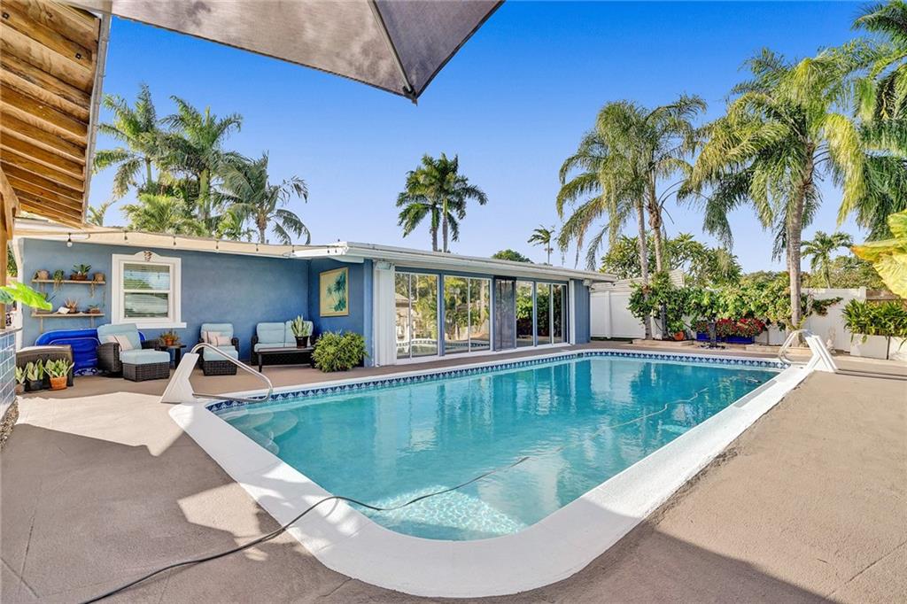 Your Tropical Paradise 3BD 2BA Waterfront Pool home you have been waiting for. Property features an Open Floor Plan with white porcelain tile throughout, split floor plan, vaulted wood beam ceilings, Impact Windows and Doors (2018) and easy-close hurricane concertina shutters for the back portion of the property. Fully fenced back and sides. Exterior has been professionally refinished and painted (2021). New Roof in 2020, 65ft of Ocean Access Waterfront with a New 45ft boat dock (Oct 2021). Move in ready! Come relax in your 32x16x9 Saltwater Pool, or at the lovely outdoor seating areas and tiki hut having a nice cold beverage in the shade. Minimal yard maintenance, & mature tropical landscaping. NO FIXED BRIDGES to ocean access and cruising the waterways around the area!