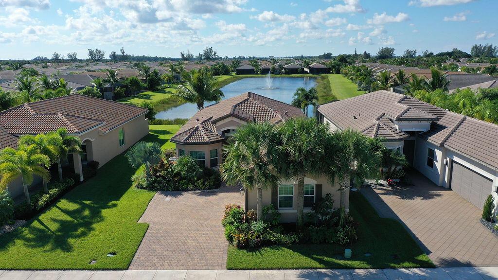 Serene lake views from this 2 bed + den, single family Valencia Bay home built in 2018. One of, if not the best views & locations in the entire community, offering breathtaking sunsets and long lake views. Immaculate, move in condition with new Generac generator, hurricane impact glass windows throughout, chefs kitchen with white-shaker cabinetry, stainless steel premium appliances, coffered ceilings, tiled flooring in living area, screened in patio, 2 car garage, walk in shower, large bathtub, plenty of closet space, too many upgrades to list! A must see! 24/7 guard gated entry! Hurry, this will go fast.