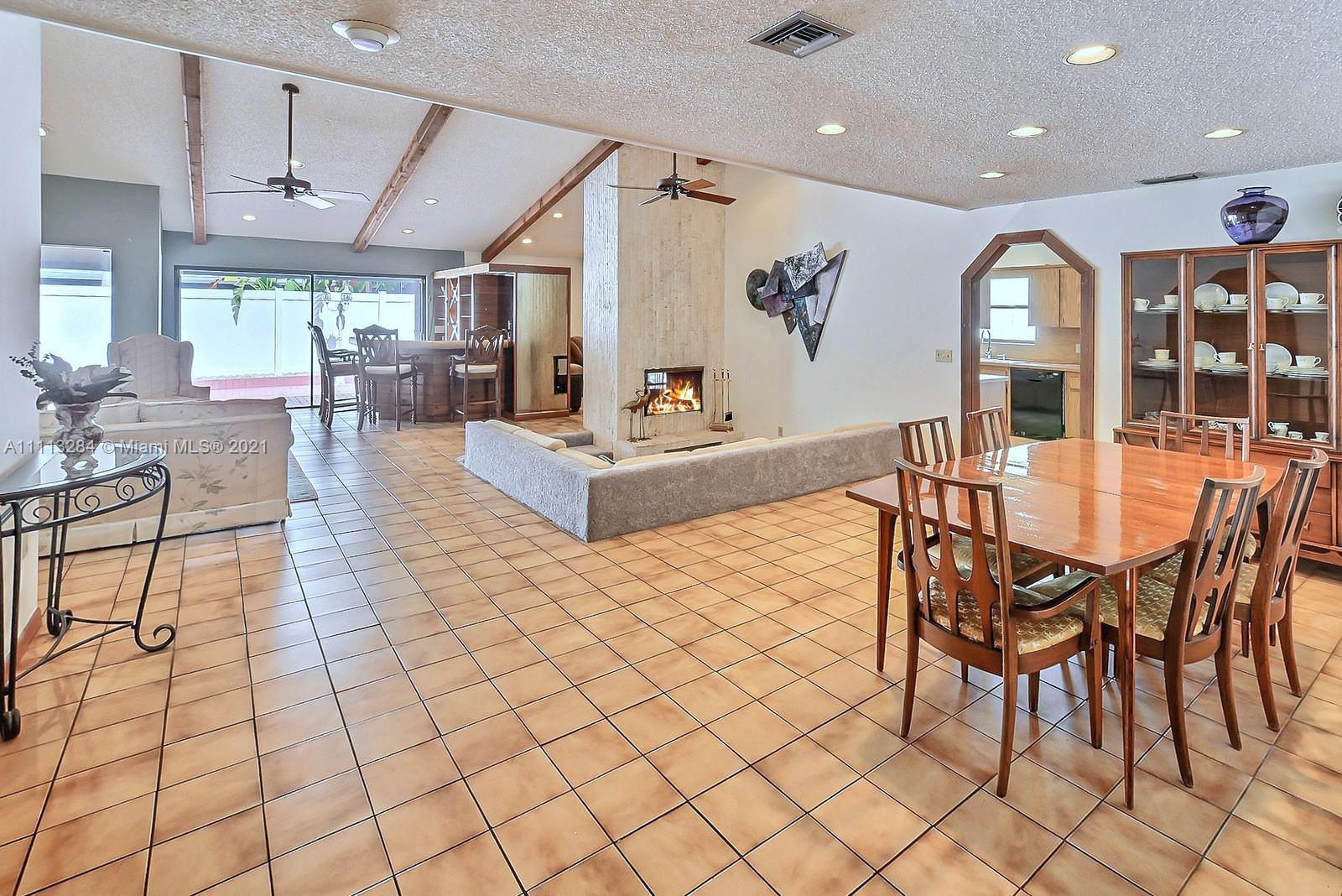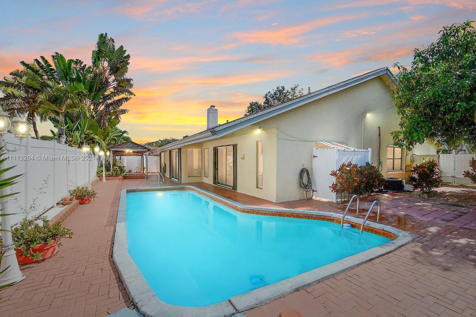 FANTASTIC OPPORTUNITY TO LIVE IN WOODBRIDGE, PEMBROKE PINES. SPACIOUS POOL HOME FEATURES 4 BEDS, 2.5 BATHS, OPEN FLOOR PLAN WITH FAMILY, LIVING & DINING ROOMS. SOARING CEILINGS WITH BEAUTIFUL WOOD BEAMS & ROMANTIC WOOD BURNING FIREPLACE. LARGE PRIMARY BEDROOM WITH ENSUITE BATH. GREAT HOME FOR ENTERTAINING FAMILY AND FRIENDS WITH BUILT-IN BAR, GAZEBO AND REFRESHING POOL ON FENCED BACKYARD. LUSHLY LANDSCAPED BACKYARD WITH LOTS OF SHADE AND TWO MANGO TREES. CIRCULAR DRIVEWAY AND NO HOA! FANTASTIC CENTRAL LOCATION CLOSE TO SHOPS, RESTAURANTS AND EASY ACCESS TO HIGHWAYS.