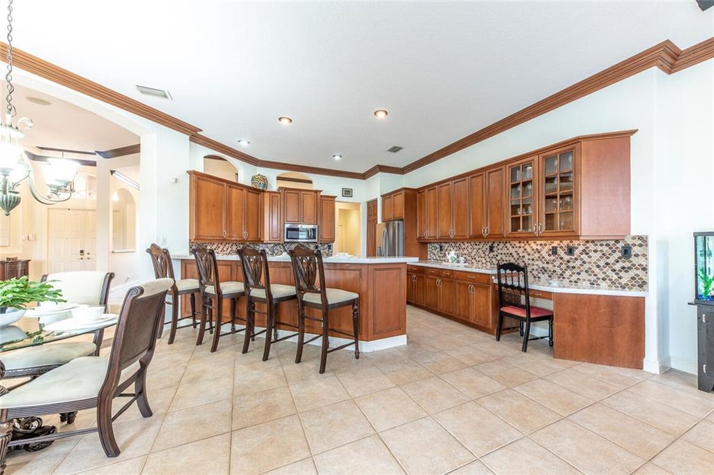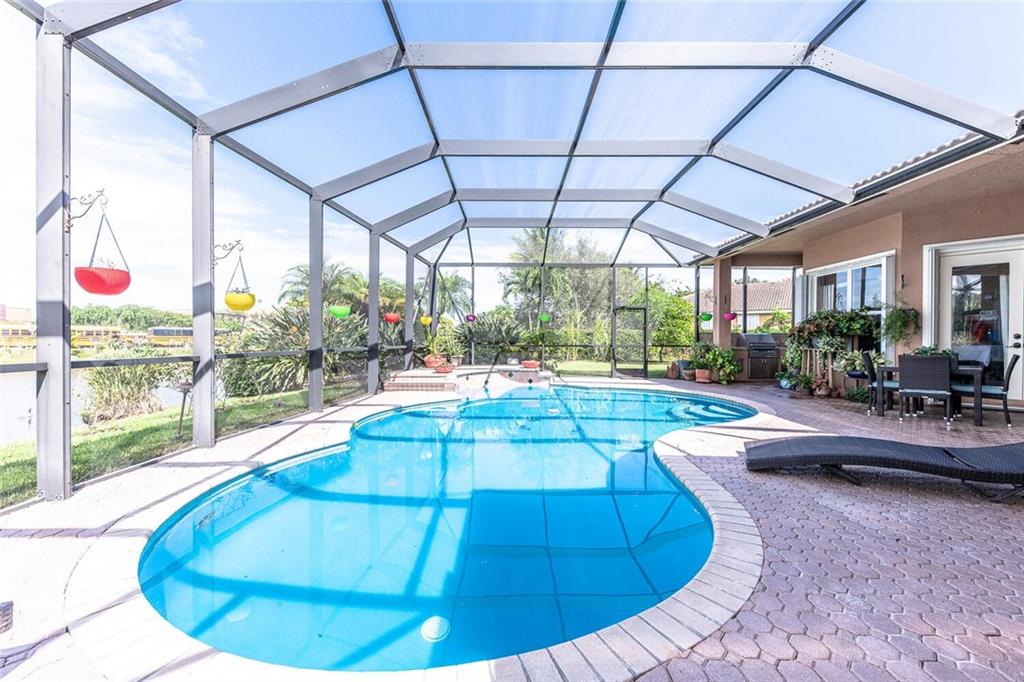 RUN...don't walk to this gorgeous waterfront 5 bedroom (5th BR is an office w/built-in murphy bed), 4 full bathroom home on an oversized pie-shaped lot in desirable Fox Ridge! Impeccably maintained, this home offers: triple split bedroom plan; volume ceilings; stone-look tile in living areas & wood flooring in bedrooms; crown molding; gorgeous kitchen with 42" wood cabinets, stainless steel appliances, brand new quartz countertops & tiled backsplash; huge master bedroom with sitting area & his/her closets; hurricane impact patio door and living room windows + accordion hurricane shutters; built in outdoor grill; custom built patio bar; new 1,000 gal full house generator; newly screen-enclosed pool/patio (pool recently resurfaced + new heater) wtih serene water views & more!