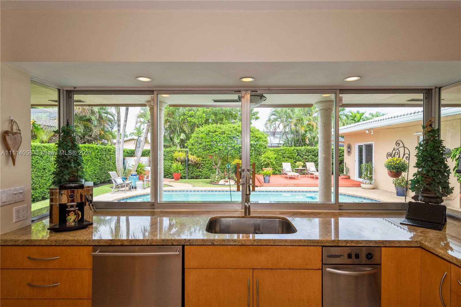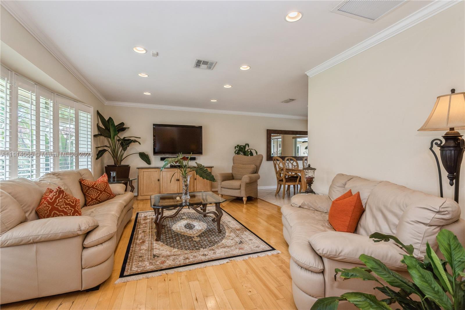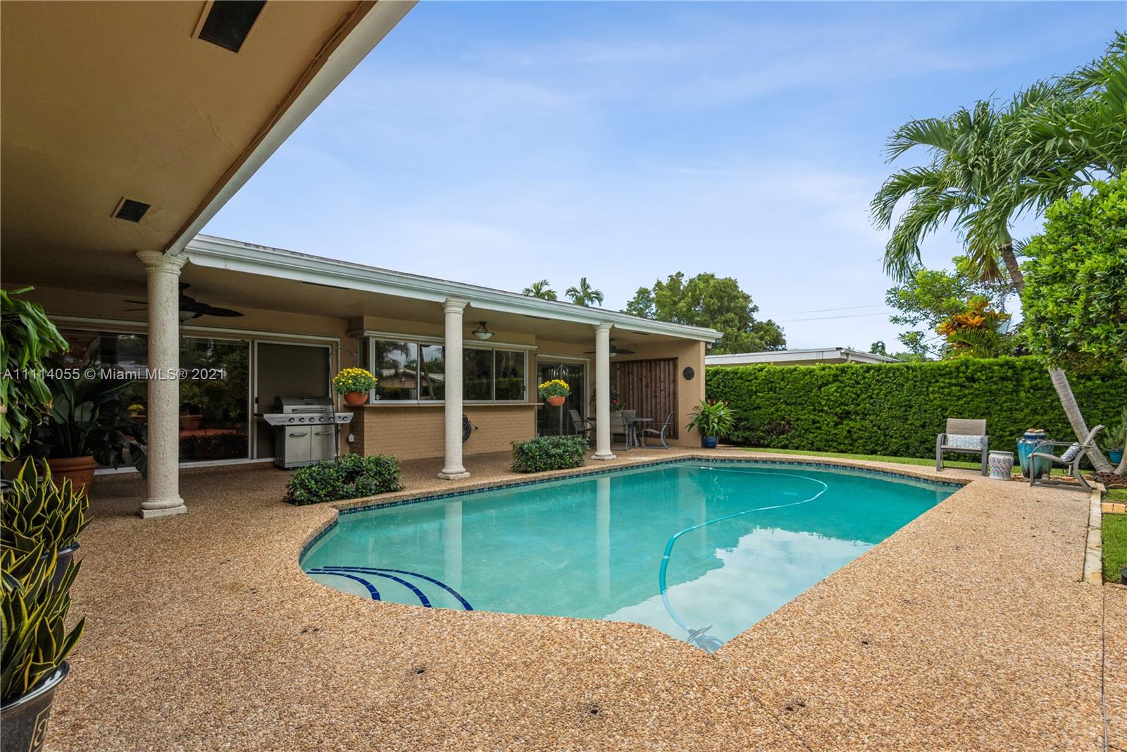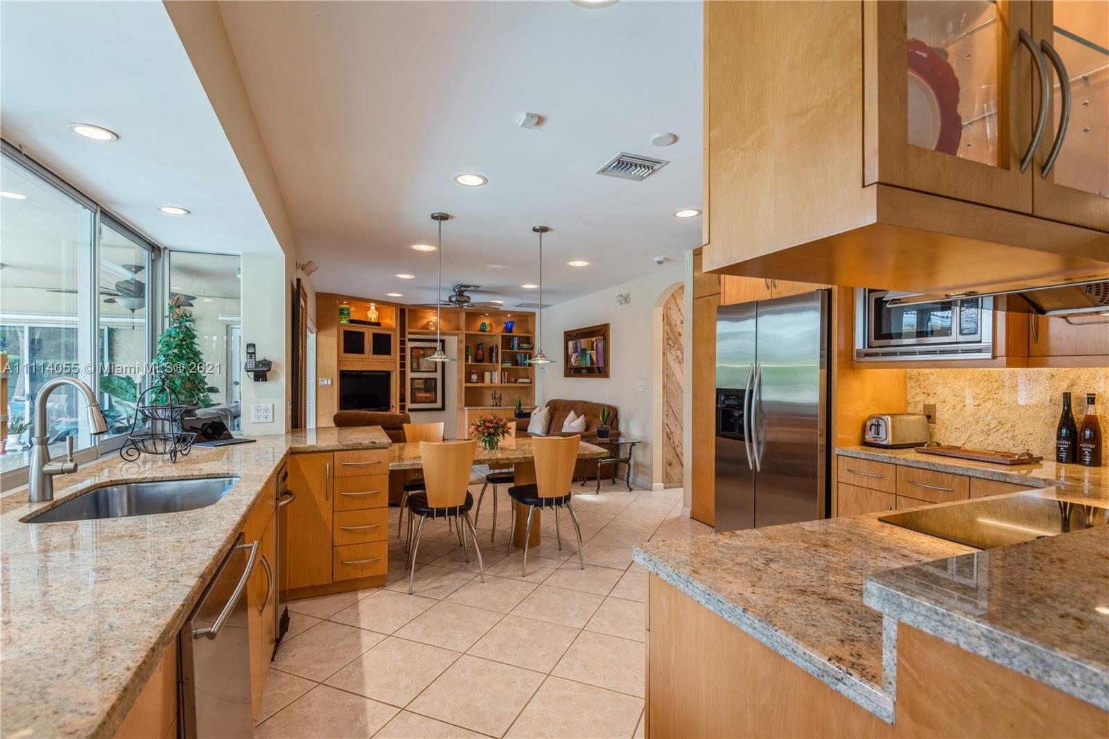Striking Hollywood Hills 3 Bed 2 Bath lushly landscaped pool home plus 2 car garage. Chef’s kitchen with stainless steel appliances, granite countertops & built-in granite table adjoins the family room. Enjoy expansive Living room, separate Dining room, and Large Primary Bedroom Suite too. Tile, wood & carpeted flooring throughout. Hurricane impact skylights keep the home bright. Separate AC systems for living and bedroom areas. Portable generator included with home Hookup. Convenient to everything
