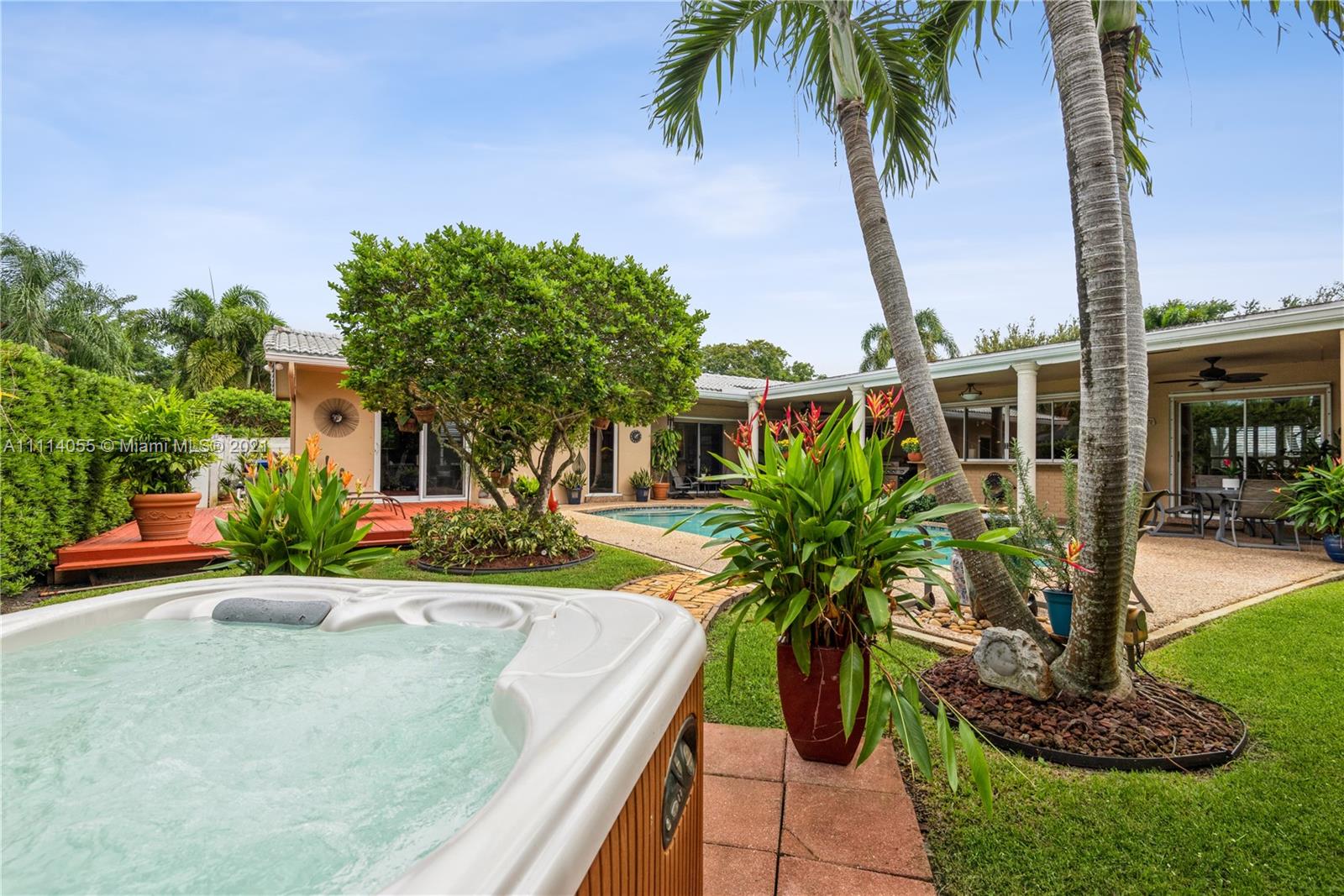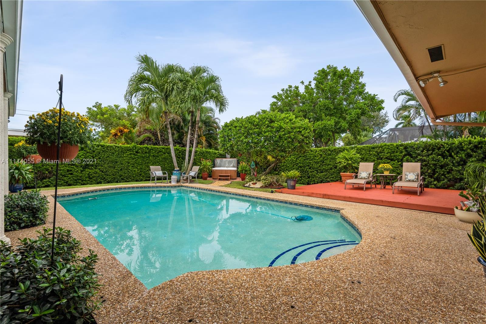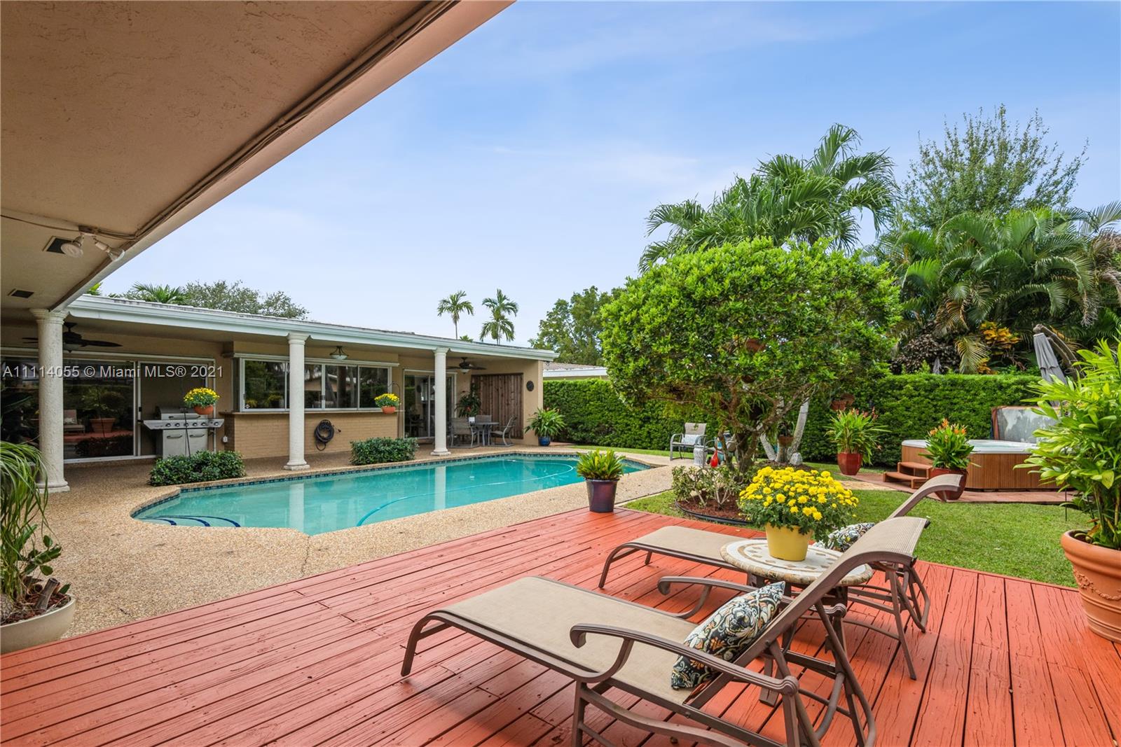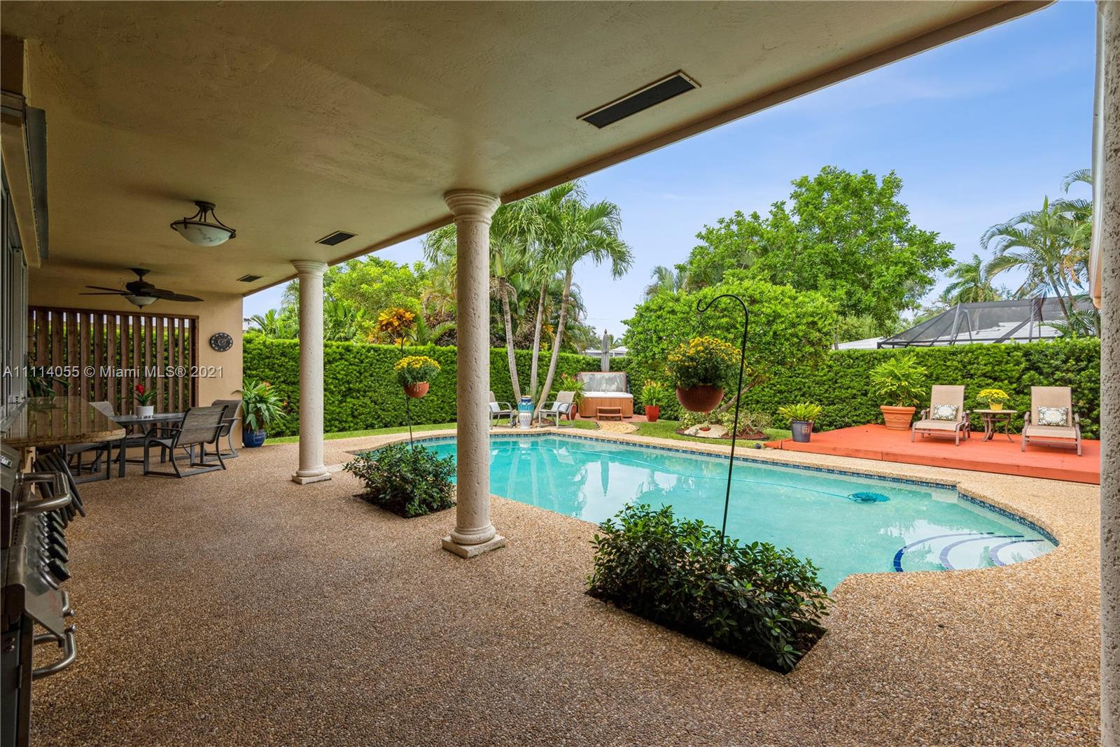Striking Hollywood Hills 3 Bed 2 Bath lushly landscaped pool home plus 2 car garage. Chef’s kitchen with stainless steel appliances, granite countertops & built-in granite table adjoins the family room. Enjoy expansive Living room, separate Dining room, and Large Primary Bedroom Suite too. Tile, wood & carpeted flooring throughout. Hurricane impact skylights keep the home bright. Separate AC systems for living and bedroom areas. Portable generator included with home Hookup. Convenient to everything