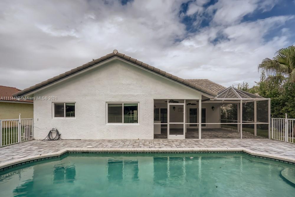 This 3 bedroom, 2 bathroom home greets you with its fantastic curb appeal and accompanying pool! Inside you are invited in by vaulted ceilings and a sunny living space courtesy of both the skylight overhead and an abundance of perfectly placed windows. Nearby, the dining and kitchen area wait for you complete with an array of spacious cabinetry and a sizeable breakfast bar ready for your every meal! The primary bedroom is full of natural light highlighting the beautifully tiled en suite bathroom and its two vanities. The subject property also features a screened-in patio and pool area boasting a charming bar and sink setup perfect for entertaining outdoors. Being situated between multiple main thoroughfares, you will have easy access to all this community has to offer!